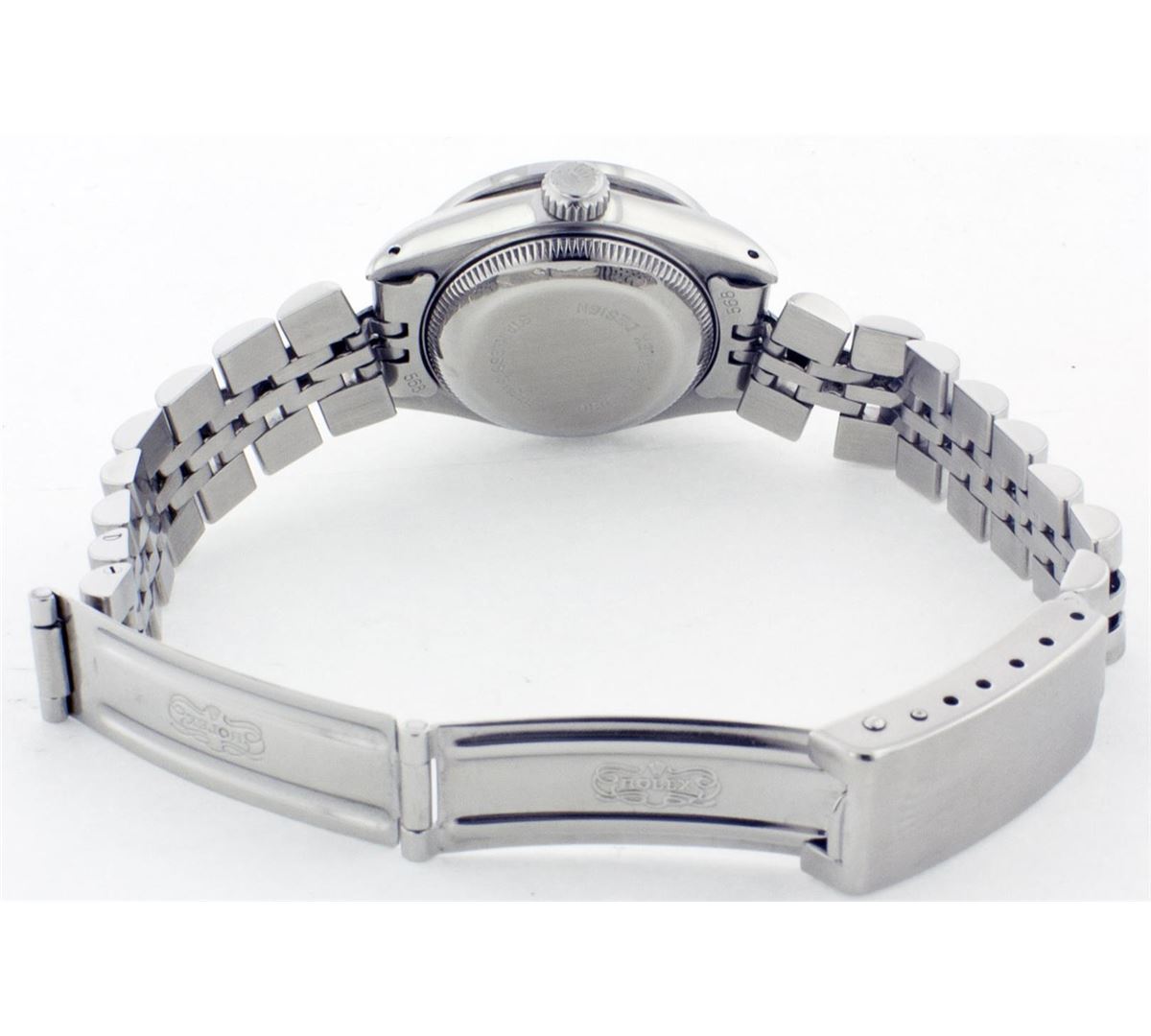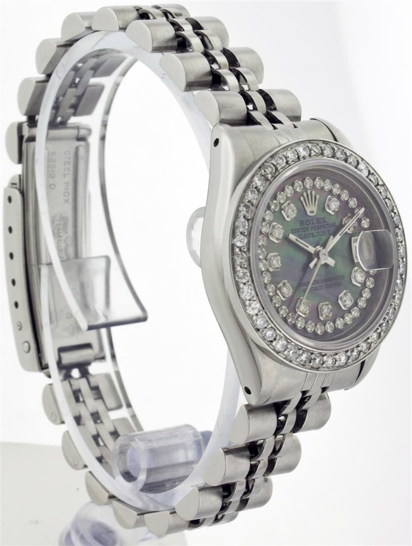 One Ladies Rolex Datejust Polished Bright with Satin Finish, Serviced & Electronically Tested, Stainless Steel Case:26mm, Stainless Steel Crown, Custom Bezel: Stainless Steel Beadset Diamond Bezel, Diamond Count: 40 Diamonds Total Weight 1.00 Carat, Clarity: SI-VS, Color: G to H. Custom Crystal: Synthetic Sapphire Cyclops Lens. Movement: Automatic Winding Movement Caliber 2030. Custom Dial: Black Mother Of Pearl With String Diamond Dial, Diamond Count: 43 Diamonds In Dial, Clarity: SI-VS, Color: G to H. Date Window: 3 O'Clock Position Date Display, Non Quickset, Model: 6917 Condition: G-6 Extra Fine. Bracelet: Stainless Steel Jubilee. Bright Polish & Satin Finish. 5.5 Inch Length, Adjustable. Standard Clasp, With Rolex Logo.