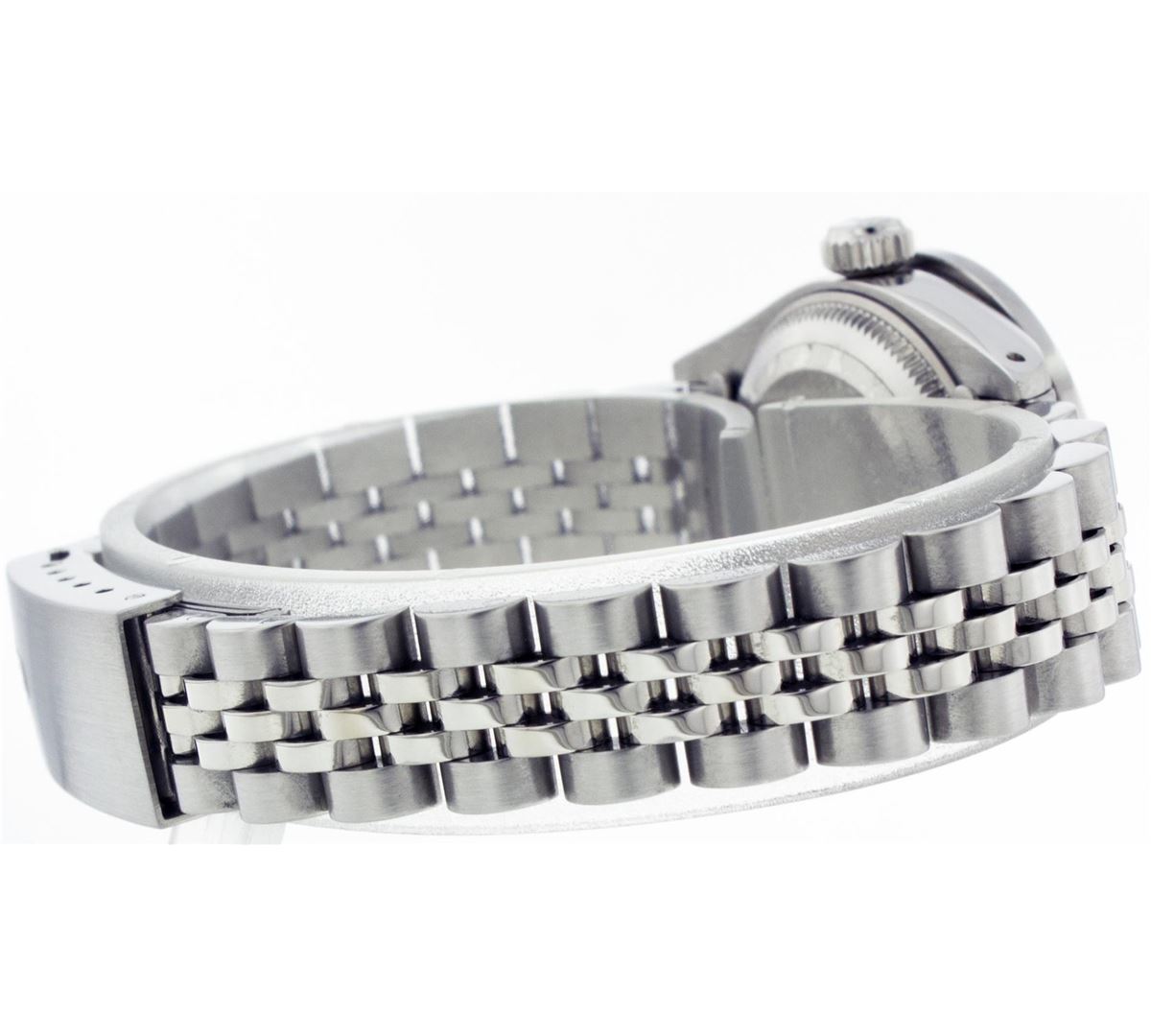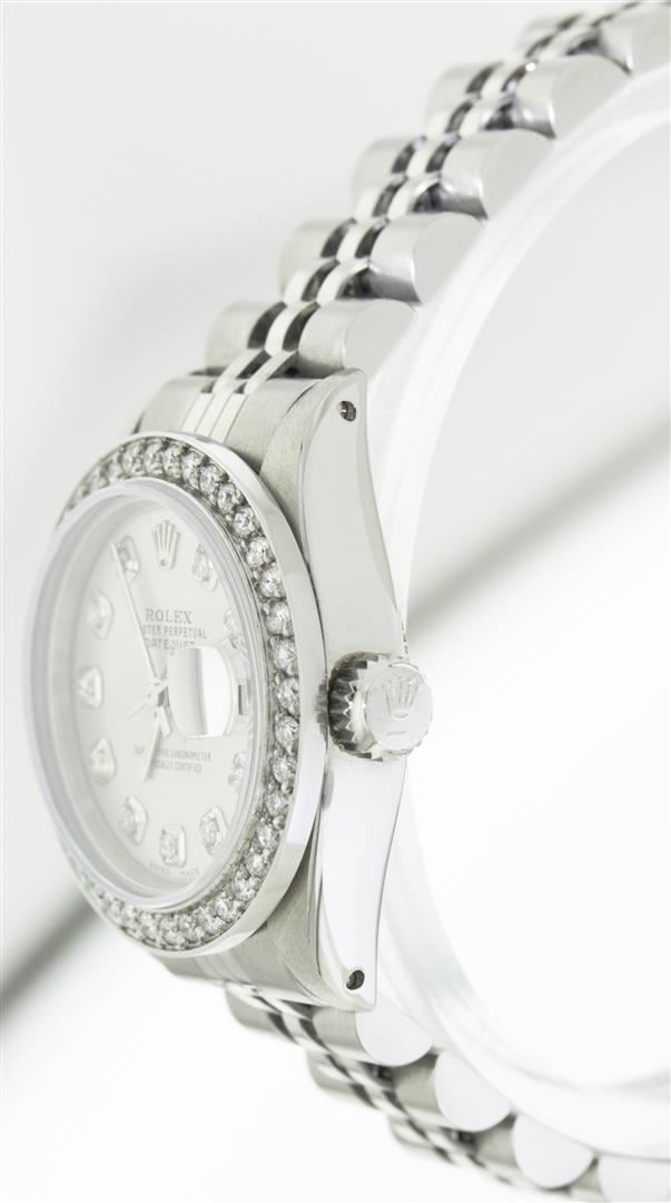 One Ladies Rolex Datejust Polished Bright with Satin Finish, Serviced & Electronically Tested, Stainless Steel Case:26mm, Stainless Steel Crown, Clarity: SI-VS, Color: G to H. Custom Bezel: Stainless Steel Beadset Diamond Bezel, Diamond Count: 40 Diamonds Total Weight 1.00 Carat, Clarity: SI-VS, Color: G to H. Custom Crystal: Synthetic Sapphire Cyclops Lens. Movement: Automatic Winding Movement Caliber 2030. Original Custom Dial: Refinished Silver With Diamond Dial, 10 Diamond in Dial G To H In Color, Clarity: SI-VS. Date Window: 3 O'Clock Position Date Display, Quickset, Model: 6917 Condition: G-6 Extra Fine. Bracelet: Stainless Steel Jubilee. Bright Polish & Satin Finish. 5.5 Inch Length, Adjustable. Standard Clasp, With Rolex Logo.