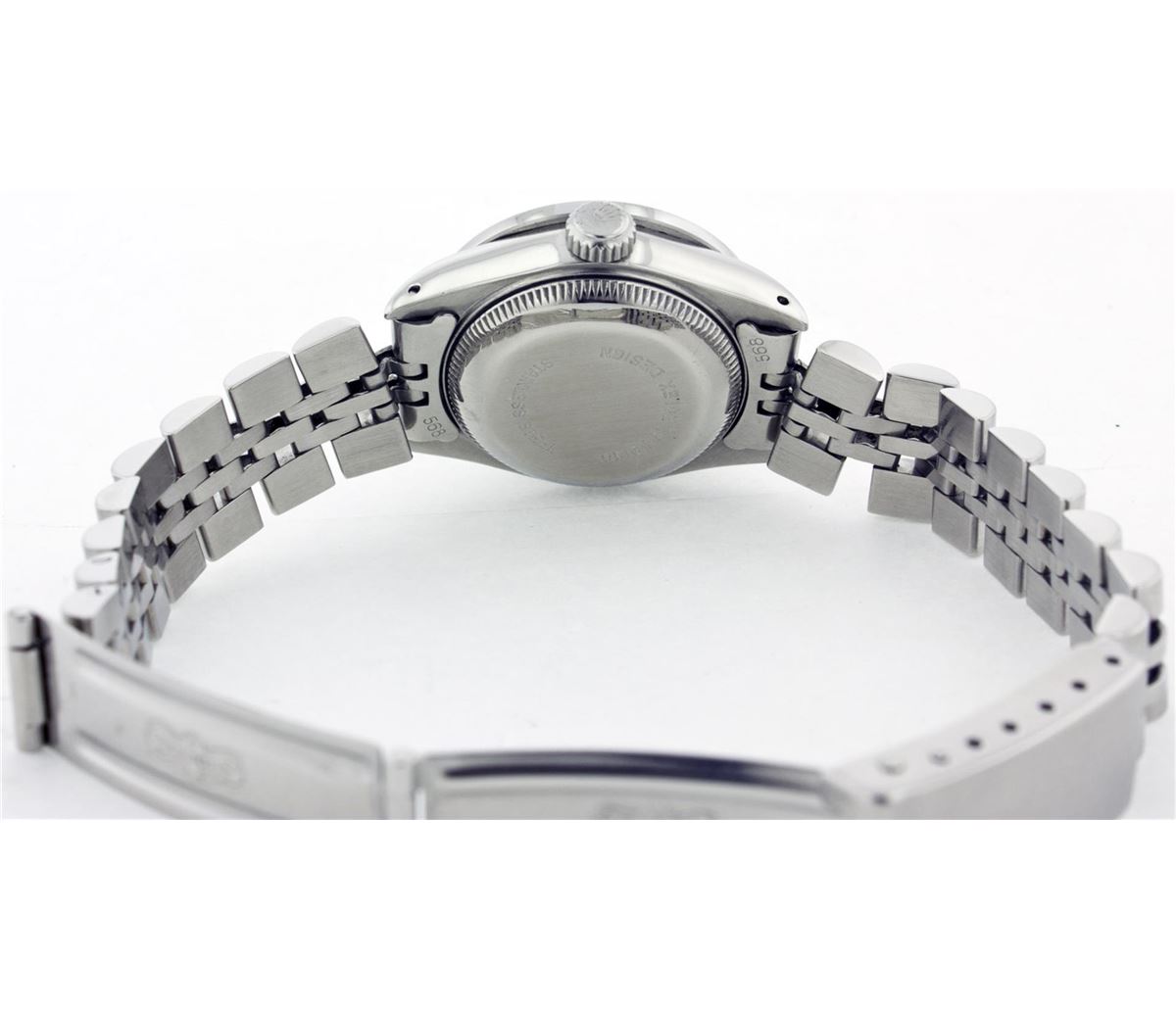 One Ladies Rolex Datejust Polished Bright with Satin Finish, Serviced & Electronically Tested, Stainless Steel Case:26mm, Stainless Steel Crown, Custom Bezel: Stainless Steel Beadset Diamond Bezel, Diamond Count: 40 Diamonds Total Weight 1.00 Carat, Clarity: SI-VS, Color: G to H. Custom Crystal: Synthetic Sapphire Cyclops Lens. Movement: Automatic Winding Movement Caliber 2030. Custom Dial: Black Mother Of Pearl With String Diamond Dial, Diamond Count: 43 Diamonds In Dial, Clarity: SI-VS, Color: G to H. Date Window: 3 O'Clock Position Date Display, Non Quickset, Model: 6917 Condition: G-6 Extra Fine. Bracelet: Stainless Steel Jubilee. Bright Polish & Satin Finish. 5.5 Inch Length, Adjustable. Standard Clasp, With Rolex Logo.