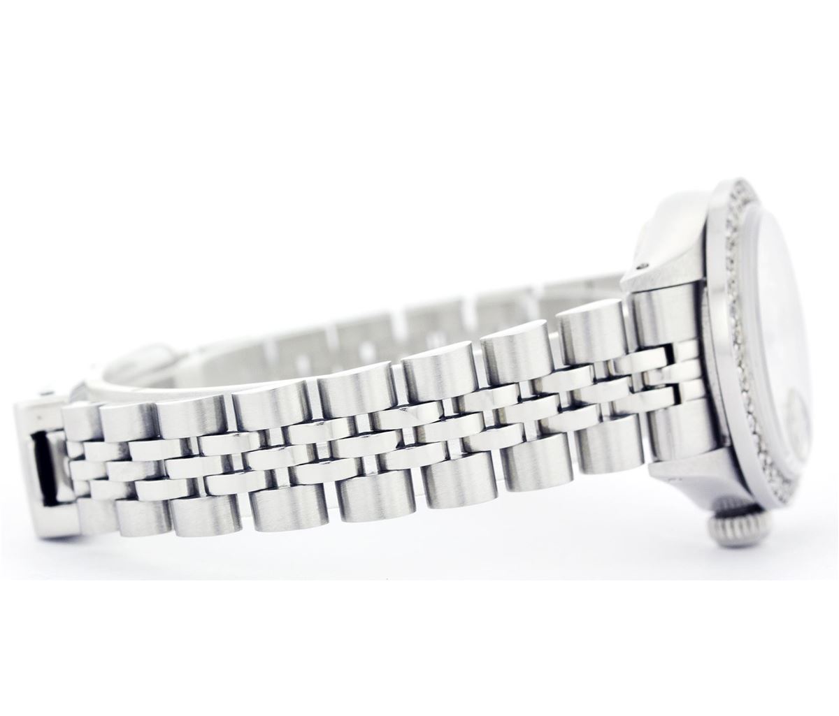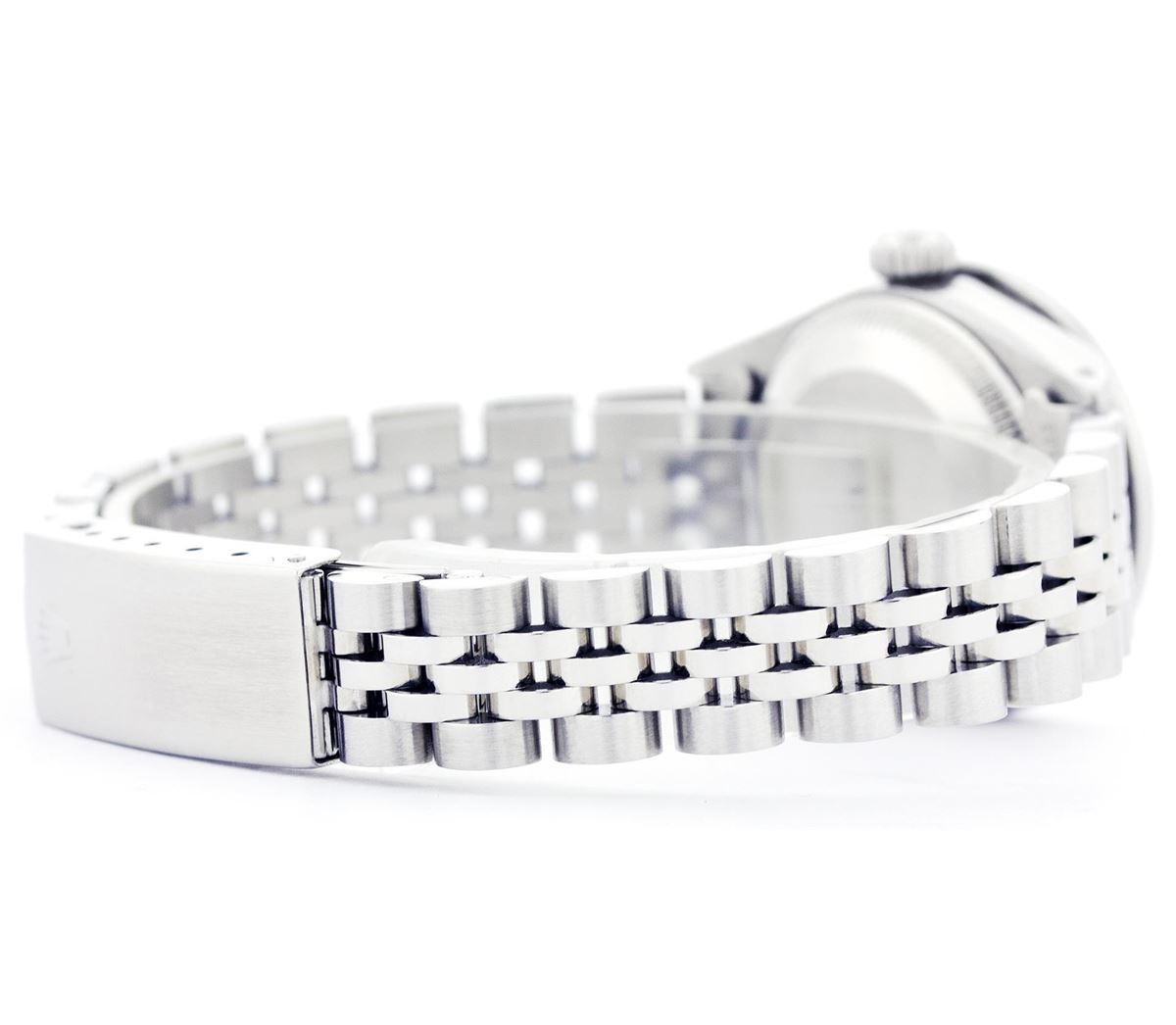 One Ladies Rolex Datejust Polished Bright with Satin Finish, Serviced & Electronically Tested, Stainless Steel Case:26mm, Stainless Steel Crown, Custom Bezel: Stainless Steel Beadset Diamond Bezel, Diamond Count: 40 Diamonds Total Weight 1.00 Carat, Clarity: SI-VS, Color: G to H. Custom Crystal: Synthetic Sapphire Cyclops Lens. Movement: Automatic Winding Movement Caliber 2030. Custom Dial: Refinished Mother Of Pearl With Diamond Hour Markers, Diamond Count: 10 Diamonds, Clarity: SI-VS, to H. Date Window: 3 O'Clock Position Date Display, Non Quickset, Model: 6917 Condition: G-6 Extra Fine. Bracelet: Stainless Steel Jubilee. Bright Polish & Satin Finish. 5.5 Inch Length, Adjustable. Standard Clasp, With Rolex Logo.