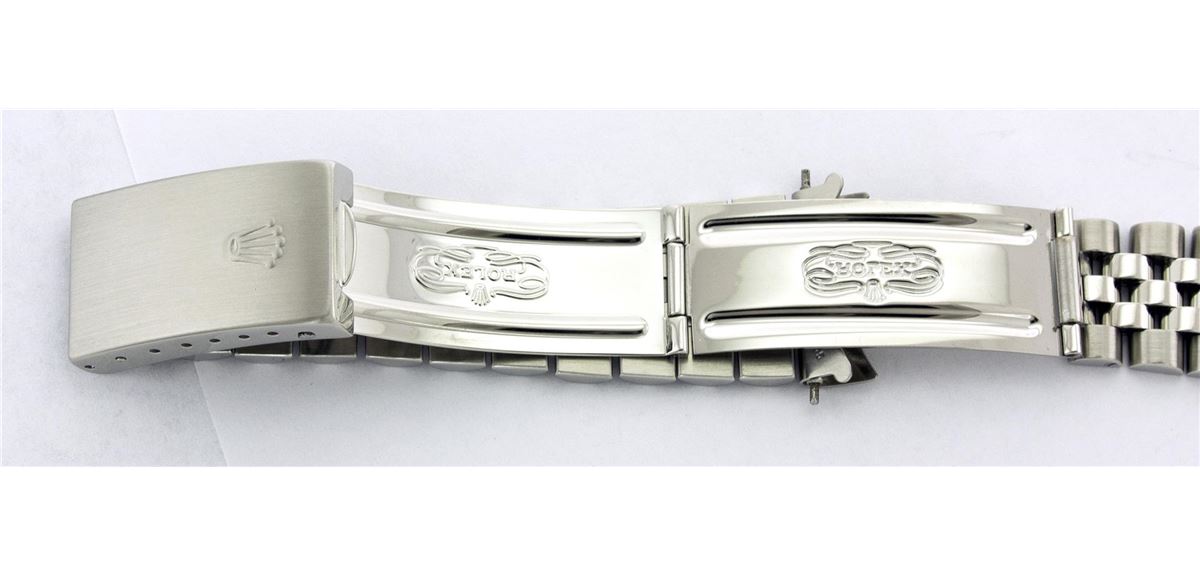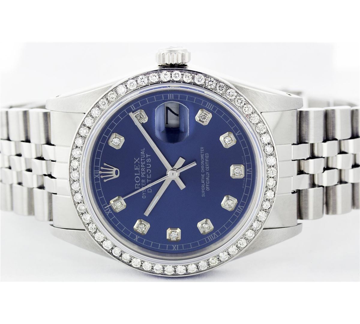 One Gents Rolex Datejust Polished, Serviced & Electronically Tested, Stainless Steel Case:36mm, Stainless Steel Crown, Custom Bezel: Stainless Steel Beadset Diamond Bezel, Total Weight: 1 Carat, Diamond Count: 54 Diamonds, Clarity: SI-VS, Color: G to H. Custom Crystal: Synthetic Sapphire Cyclops Lens. Movement: Automatic Winding Movement Caliber 3035. Custom Dial: Blue With Diamond Hour Markers, Diamond Count: 10 Diamonds, Clarity: SI-VS, Color: G To H. Date Window: 3 O'Clock Position Date Display, Quickset, Model: 16014 Condition: G-6 Extra Fine. Bracelet: Stainless Steel Jubilee. Bright Polish & Satin Finish. 6.5 Inch Length, Adjustable. Standard Clasp, With Rolex Logo.