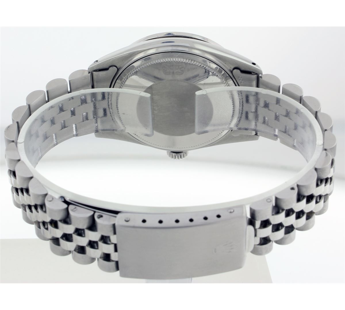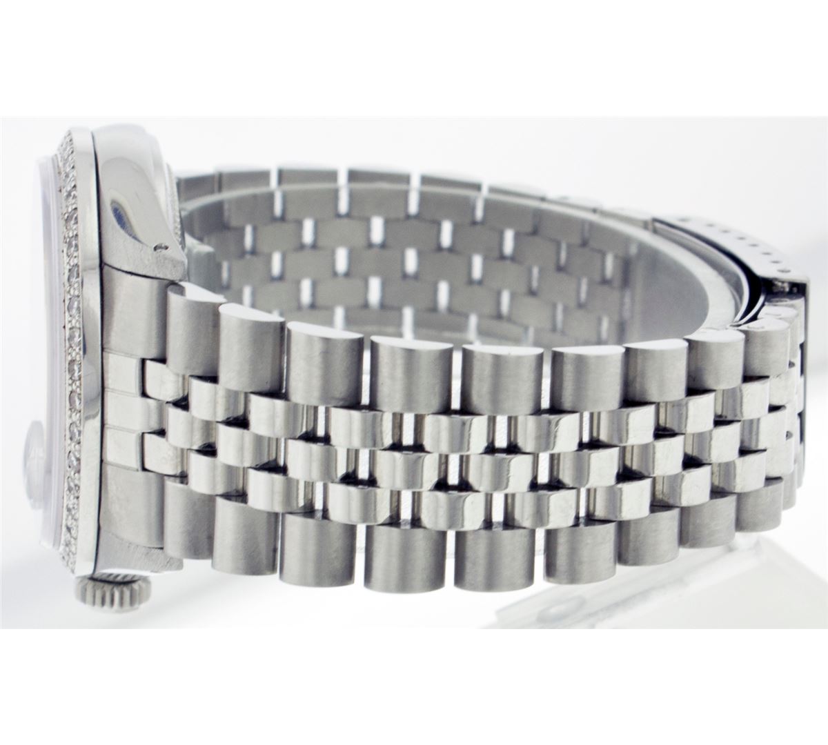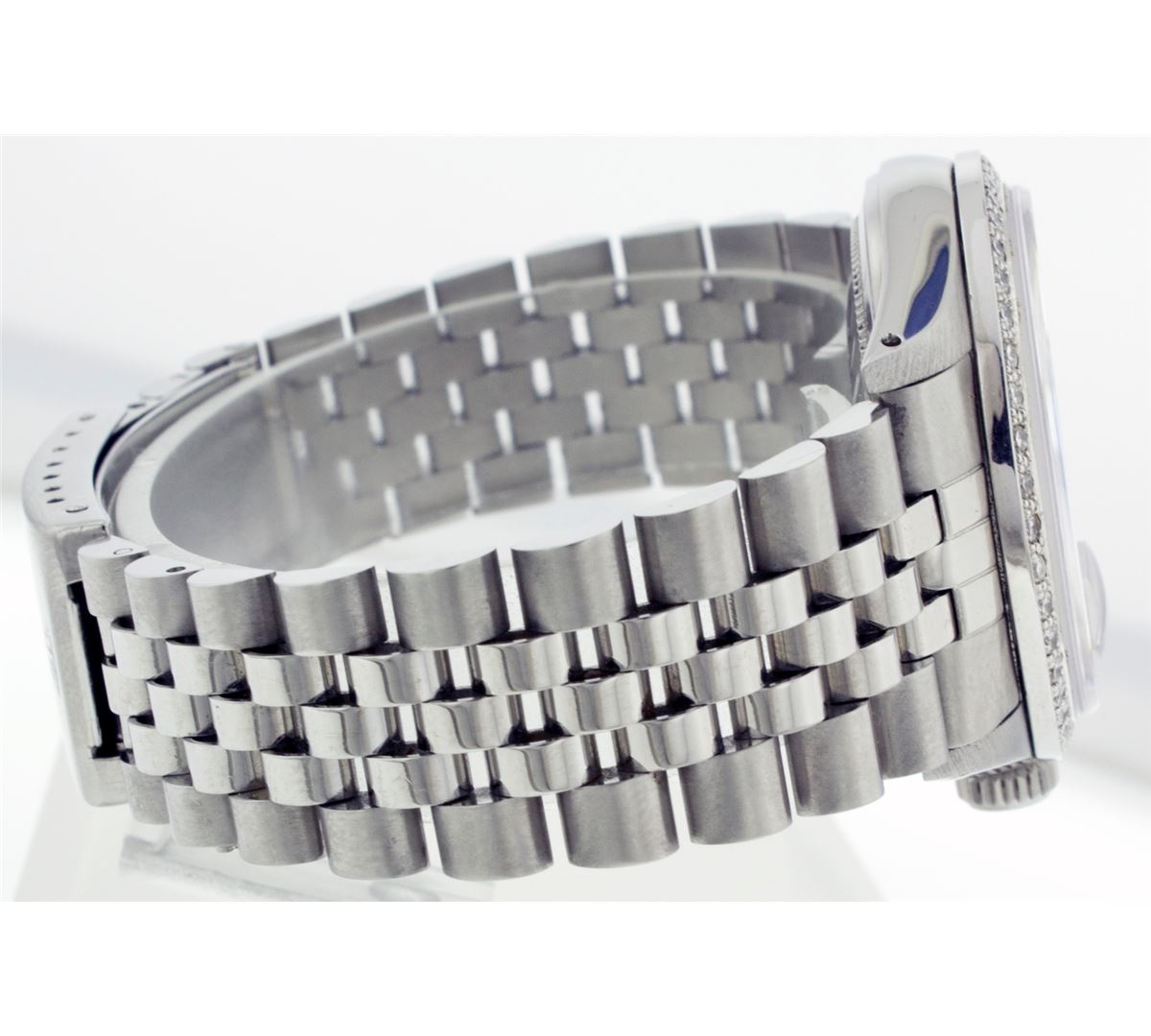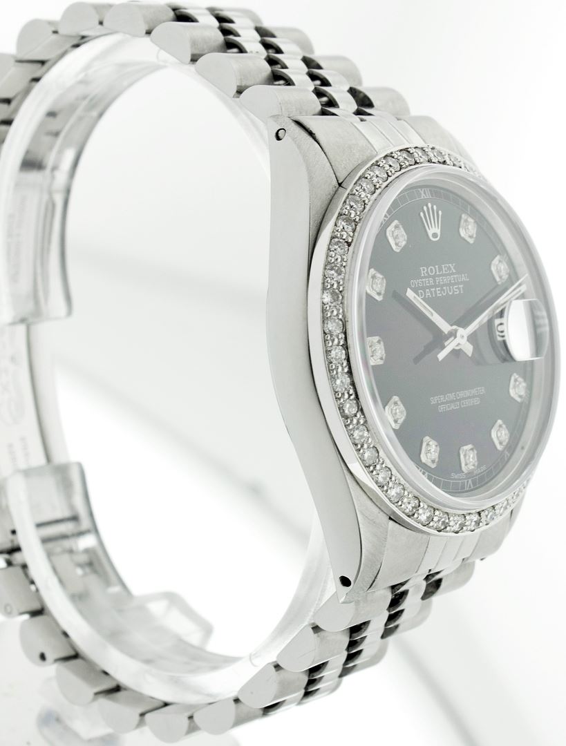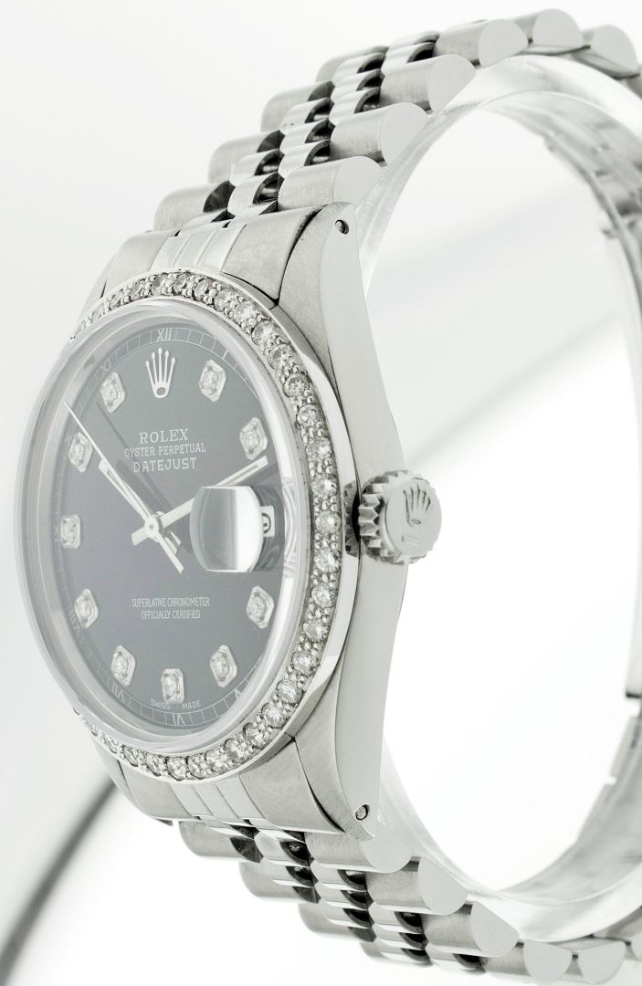 One Gents Rolex Datejust Polished, Serviced & Electronically Tested, Stainless Steel Case:36mm, Stainless Steel Crown, Custom Bezel: Stainless Steel Beadset Diamond Bezel, Diamond Count: 54 Diamonds Total Weight 1.00 Carat, Clarity: SI-VS, Color: G to H. Custom Crystal: Synthetic Sapphire Cyclops Lens. Movement: Automatic Winding Movement Caliber 3035. Custom Dial: Black Dial With Diamond Hour Markers. Diamond Count: 10 Diamonds, G to H In Color, Clarity: SI-VS. Date Window: 3 O'Clock Position Date Display, Quickset, Model: 16014 Condition: G-6 Extra Fine. Bracelet: Stainless Steel Jubilee. Bright Polish & Satin Finish. 6.5 Inch Length, Adjustable. Standard Clasp, With Rolex Logo.