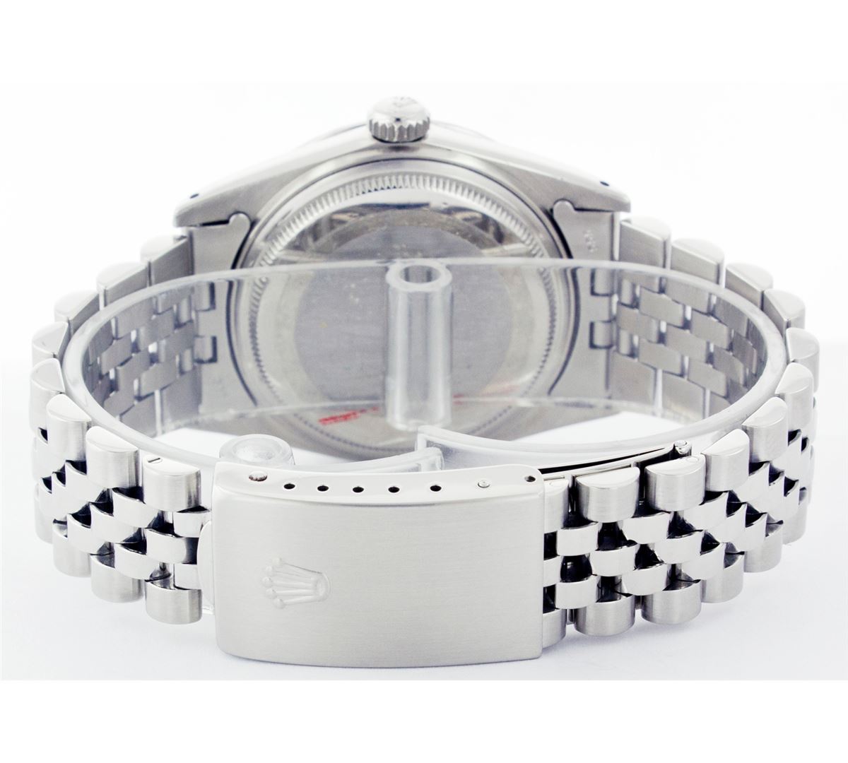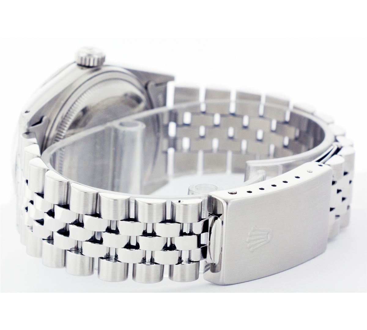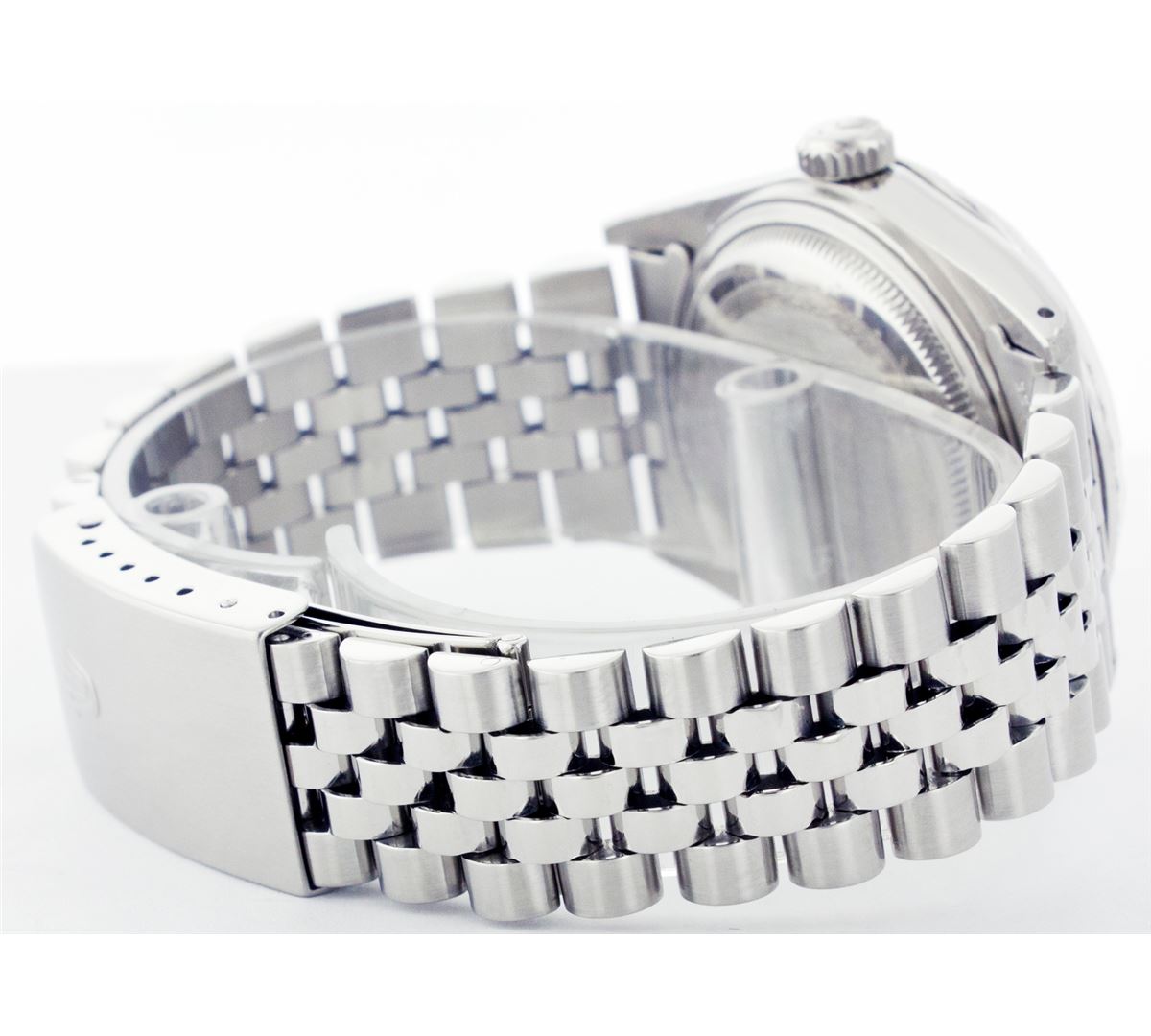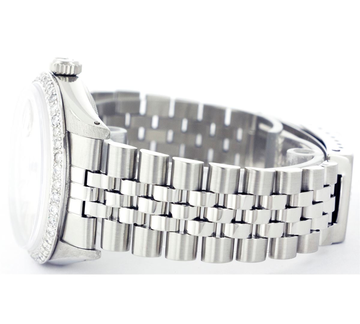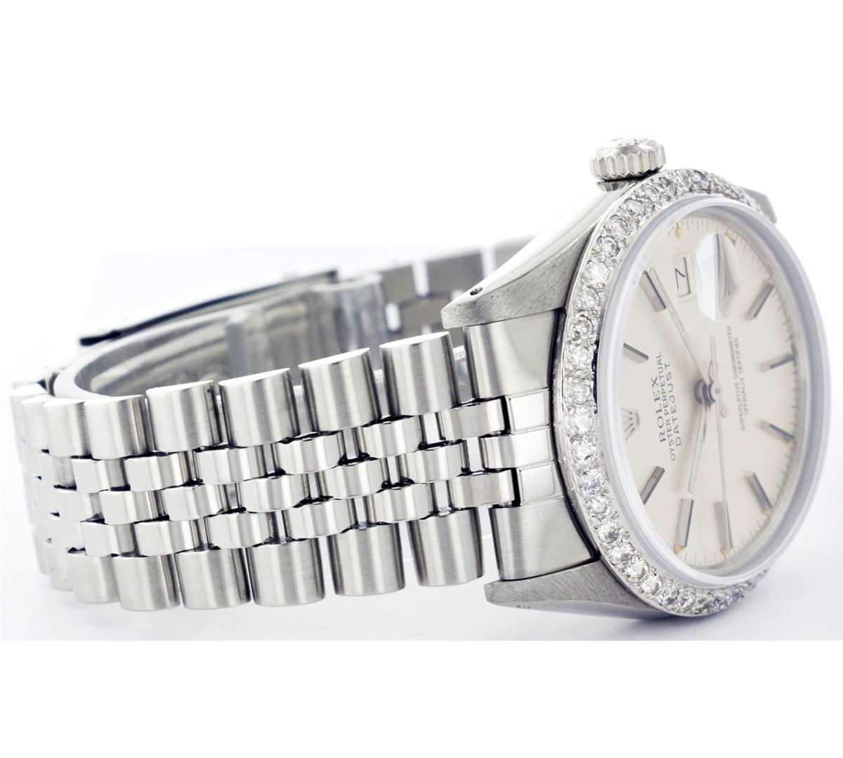 One Gents Rolex Datejust Polished, Serviced & Electronically Tested, Stainless Steel Case:36mm, Stainless Steel Crown, Custom Bezel: Stainless Steel Beadset Diamond Bezel, Total Weight: 1 Carat, Diamond Count: 54 Diamonds, Clarity: SI-VS, Color: G to H. Custom Crystal: Synthetic Sapphire Cyclops Lens. Movement: Automatic Winding Movement Caliber 3035. Custom Dial: Silver With Index Hour Markers. Date Window: 3 O'Clock Position Date Display, Quickset, Model: 16014 Condition: G-6 Extra Fine. Bracelet: Stainless Steel Jubilee. Bright Polish & Satin Finish. 6.5 Inch Length, Adjustable. Standard Clasp, With Rolex Logo.
