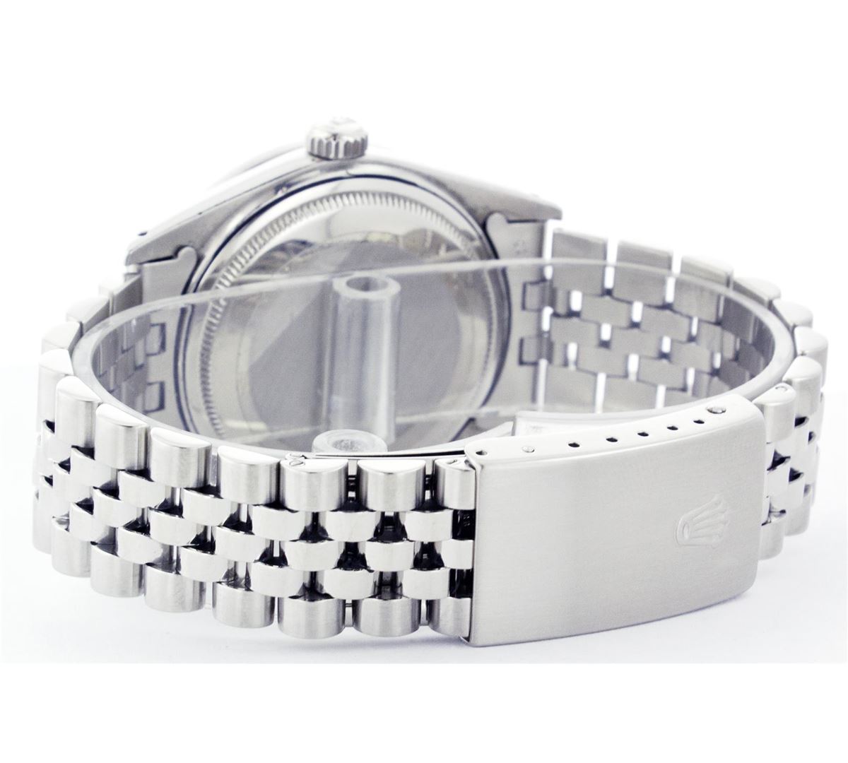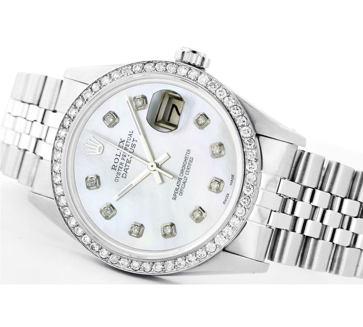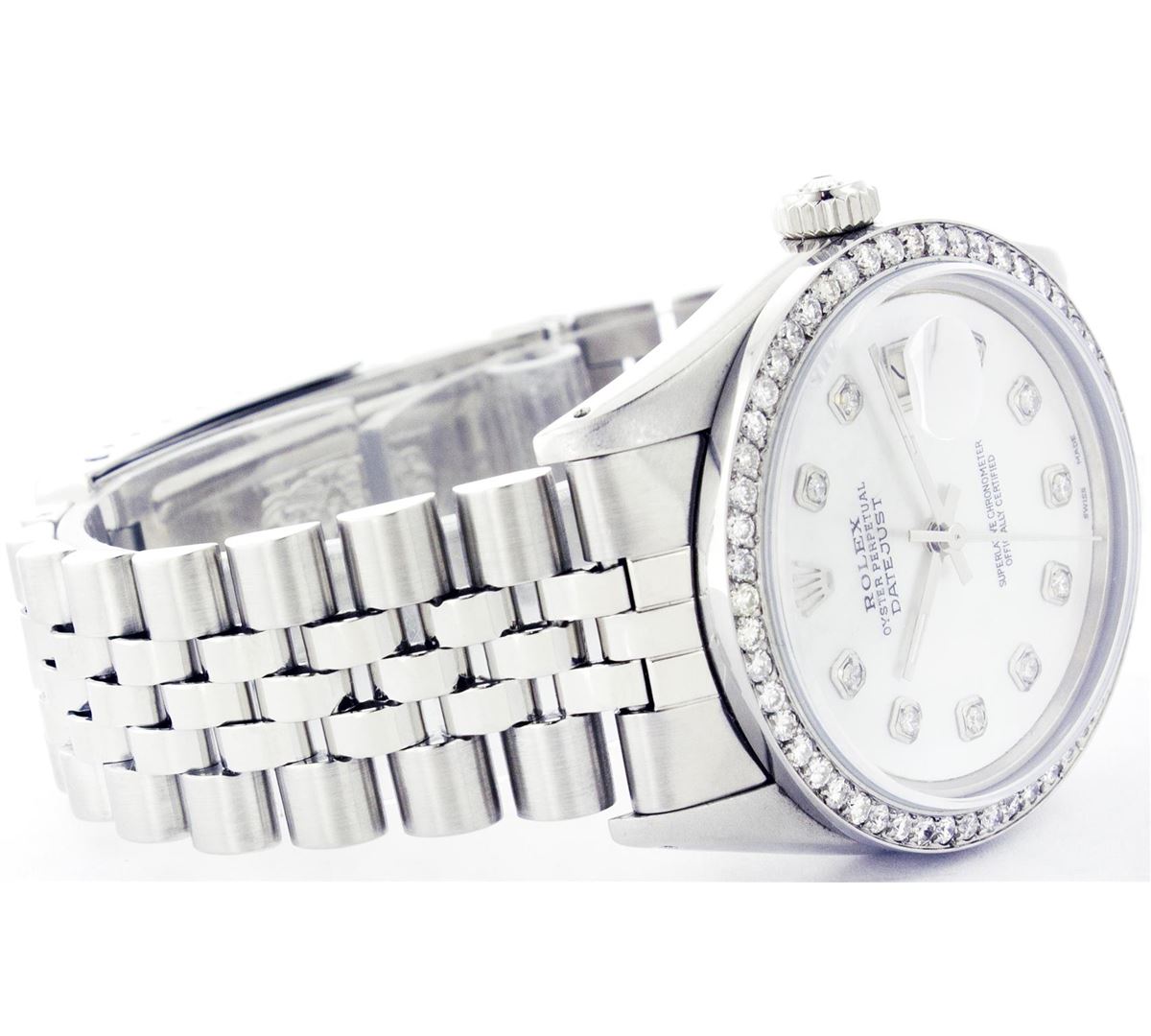 One Gents Rolex Datejust Polished, Serviced & Electronically Tested, Stainless Steel Case:36mm, Stainless Steel Crown, Custom Bezel: Stainless Steel Beadset Diamond Bezel, Total Weight: 1 Carat, Diamond Count: 54 Diamonds, Clarity: SI-VS, Color: G to H. Custom Crystal: Synthetic Sapphire Cyclops Lens. Movement: Automatic Winding Movement Caliber 3035. Custom Dial: Mother Of Pearl With Diamond Hour Markers, Diamond Count: 10 Diamonds, Clarity: SI-VS, Color: G To H. Date Window: 3 O'Clock Position Date Display, Quickset, Model: 16014 Condition: G-6 Extra Fine. Bracelet: Stainless Steel Jubilee. Bright Polish & Satin Finish. 6.5 Inch Length, Adjustable. Standard Clasp, With Rolex Logo.