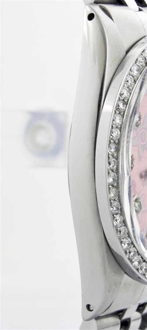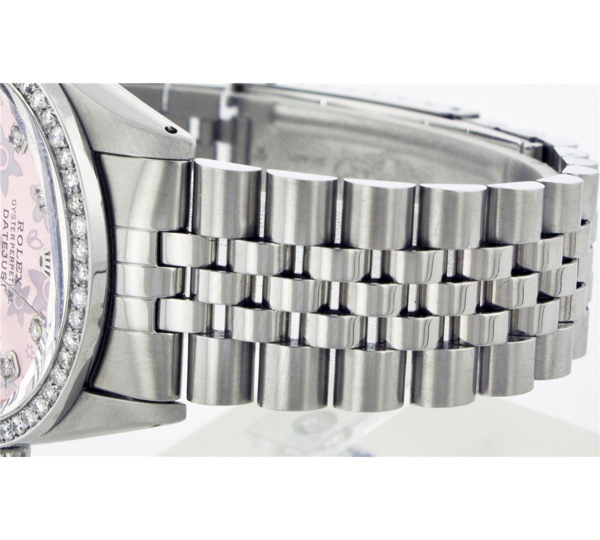 One Gents Rolex Datejust Polished, Serviced & Electronically Tested, Stainless Steel Case:36mm, Stainless Steel Crown, Custom Bezel: Stainless Steel Beadset Diamond Bezel, Total Weight: 1 Carat, Diamond Count: 54 Diamonds, Clarity: SI-VS, Color: G to H. Custom Crystal: Synthetic Sapphire Cyclops Lens. Movement: Automatic Winding Movement Caliber 3035. Custom Dial: Pink Floral With Diamond Hour Markers, Diamond Count: 10 Diamonds, Clarity: SI-VS, Color: G To H. Date Window: 3 O'Clock Position Date Display, Quickset, Model: 16014 Condition: G-6 Extra Fine. Bracelet: Stainless Steel Jubilee. Bright Polish & Satin Finish. 6.5 Inch Length, Adjustable. Standard Clasp, With Rolex Logo.