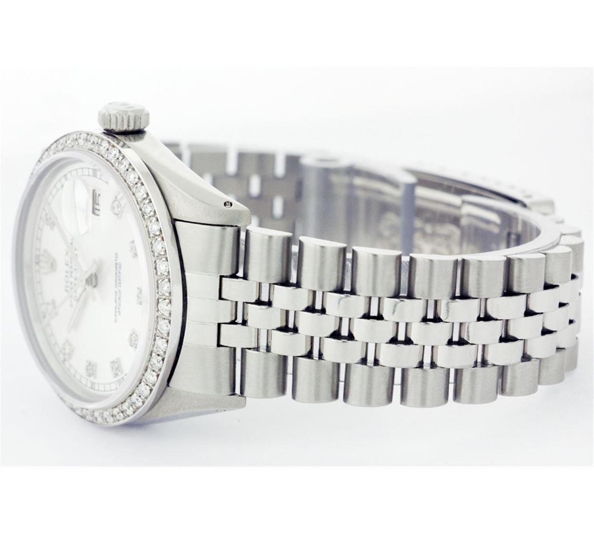 One Mens Stainless Steel Rolex Datejust Polished Bright with Satin Finish, Fully Serviced & Electronically Tested, Stainless Steel Case:36mm, Stainless Steel Crown, Custom Bezel: 18K White Gold Beadset Diamond Bezel, Diamond Count: 44 Diamonds Total Weight 1.00 Carat, Clarity: SI-VS, Color: G to H. Custom Crystal: Synthetic Sapphire Cyclops Lens. Movement: Automatic Winding Movement Caliber 3035. Custom Dial: White Dial With Diamond Hour Markers and Square Roman Track, 10 Diamonds in Dial G To H In Color, Clarity: SI-VS. Date Window: 3 O'Clock Position Date Display, Quickset, Model: Datejust, Condition: G-6 Extra Fine. Bracelet:Stainless Steel Jubilee. Bright Polish & Satin Finish. 6.5 Inch Length, Adjustable. Standard Clasp, With Rolex Logo.