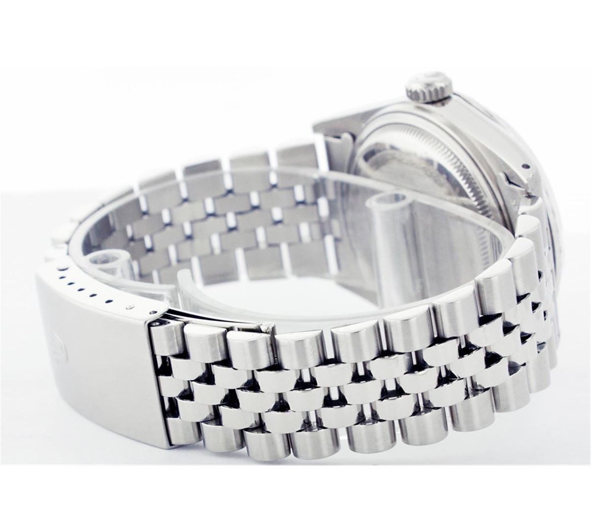 One Mens Rolex Datejust Polished Bright with Satin Finish, Serviced & Electronically Tested, Stainless Steel Case:36mm, Stainless Steel Crown, Custom Bezel: Stainless Steel Beadset Diamond Bezel, Diamond Count: 54 Diamonds Total Weight 1.00 Carat, Clarity: SI-VS, Color: G to H. Custom Crystal: Synthetic Sapphire Cyclops Lens. Movement: Automatic Winding Movement Caliber 3035. Custom Dial: Silver Index Dial With Small Track. Date Window: 3 O'Clock Position Date Display, Quickset, Model: 16014 Condition: G-6 Extra Fine. Bracelet: Stainless Steel Jubilee. Bright Polish & Satin Finish. 6.5 Inch Length, Adjustable. Standard Clasp, With Rolex Logo.