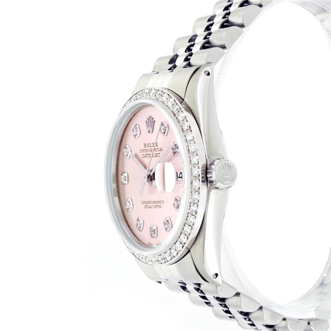 One Gents Stainless Steel Rolex Datejust Polished Bright with Satin Finish, Fully Serviced & Electronically Tested, Stainless Steel Case:36mm, Stainless Steel Crown, Custom Bezel: 18K White Gold Beadset Diamond Bezel, Diamond Count: 44 Diamonds, Total Weight 1.00 Carat, Clarity: SI-VS, Color: G to H. Custom Crystal: Synthetic Sapphire Cyclops Lens. Movement: Automatic Winding Movement Caliber 3035. Custom Dial: Ice Pink Diamond Dial, 10 Diamonds in Dial, G To H In Color, Clarity: SI-VS. Date Window: 3 O'Clock Position Date Display, Quickset, Model: Datejust, Condition: G-6 Extra Fine. Bracelet: Stainless Steel Jubilee. Bright Polish & Satin Finish. 6.5 Inch Length, Adjustable. Standard Clasp, With Rolex Logo.