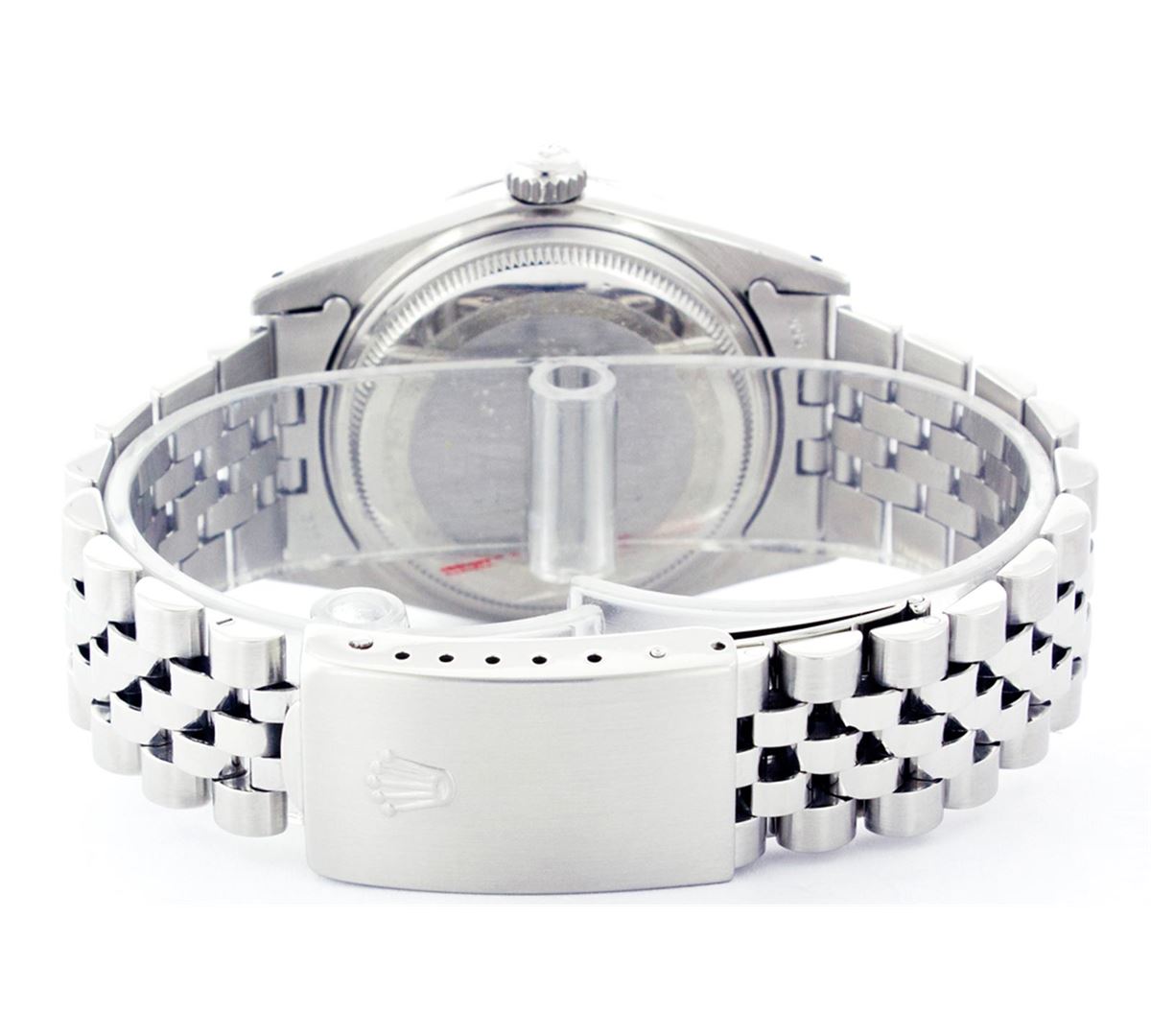 One Mens Rolex Datejust Polished Bright with Satin Finish, Serviced & Electronically Tested, Stainless Steel Case:36mm, Stainless Steel Crown, Custom Bezel: Stainless Steel Beadset Diamond Bezel, Diamond Count: 54 Diamonds Total Weight 1.00 Carat, Clarity: SI-VS, Color: G to H. Custom Crystal: Synthetic Sapphire Cyclops Lens. Movement: Automatic Winding Movement Caliber 3035. Custom Dial: Silver Index Dial With Small Track. Date Window: 3 O'Clock Position Date Display, Quickset, Model: 16014 Condition: G-6 Extra Fine. Bracelet: Stainless Steel Jubilee. Bright Polish & Satin Finish. 6.5 Inch Length, Adjustable. Standard Clasp, With Rolex Logo.
