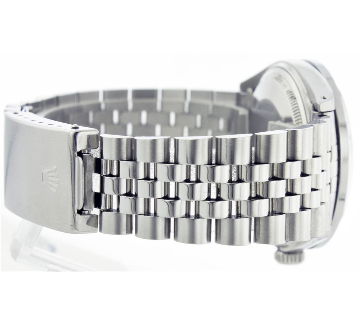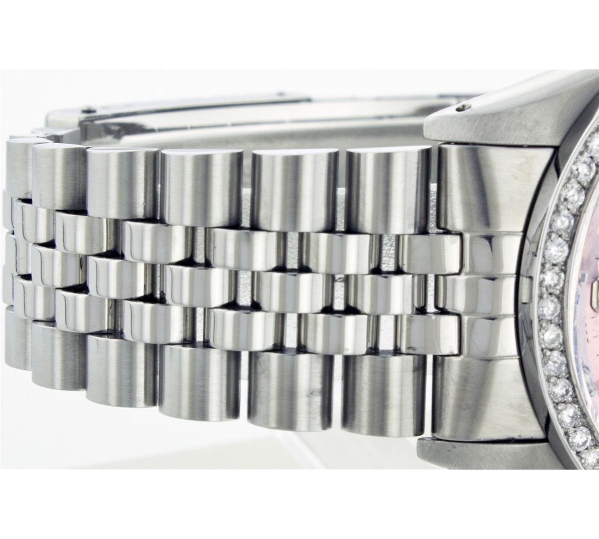 One Gents Rolex Datejust Polished, Serviced & Electronically Tested, Stainless Steel Case:36mm, Stainless Steel Crown, Custom Bezel: Stainless Steel Beadset Diamond Bezel, Total Weight: 1 Carat, Diamond Count: 54 Diamonds, Clarity: SI-VS, Color: G to H. Custom Crystal: Synthetic Sapphire Cyclops Lens. Movement: Automatic Winding Movement Caliber 3035. Custom Dial: Pink Floral With Diamond Hour Markers, Diamond Count: 10 Diamonds, Clarity: SI-VS, Color: G To H. Date Window: 3 O'Clock Position Date Display, Quickset, Model: 16014 Condition: G-6 Extra Fine. Bracelet: Stainless Steel Jubilee. Bright Polish & Satin Finish. 6.5 Inch Length, Adjustable. Standard Clasp, With Rolex Logo.