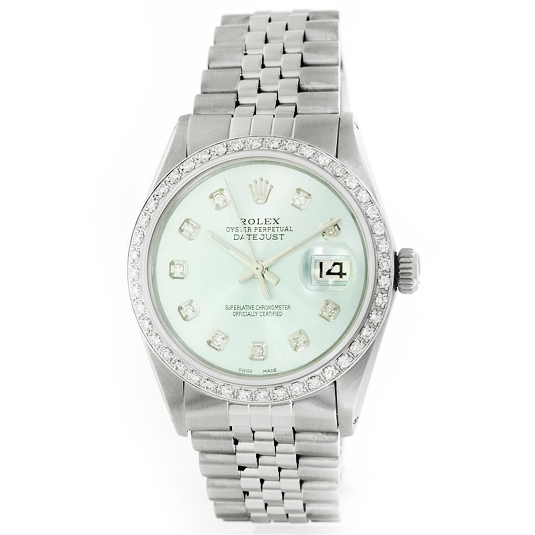 One Gents Stainless Steel Rolex Datejust Polished Bright with Satin Finish, Fully Serviced & Electronically Tested, Stainless Steel Case:36mm, Stainless Steel Crown, Custom Bezel: 18K White Gold Beadset Diamond Bezel, Diamond Count: 44 Diamonds, Total Weight 1.00 Carat, Clarity: SI-VS, Color: G to H. Custom Crystal: Synthetic Sapphire Cyclops Lens. Movement: Automatic Winding Movement Caliber 3035. Custom Dial: Ice Blue Diamond Dial, 10 Diamonds in Dial, G To H In Color, Clarity: SI-VS. Date Window: 3 O'Clock Position Date Display, Quickset, Model: Datejust, Condition: G-6 Extra Fine. Bracelet: Stainless Steel Jubilee. Bright Polish & Satin Finish. 6.5 Inch Length, Adjustable. Standard Clasp, With Rolex Logo.