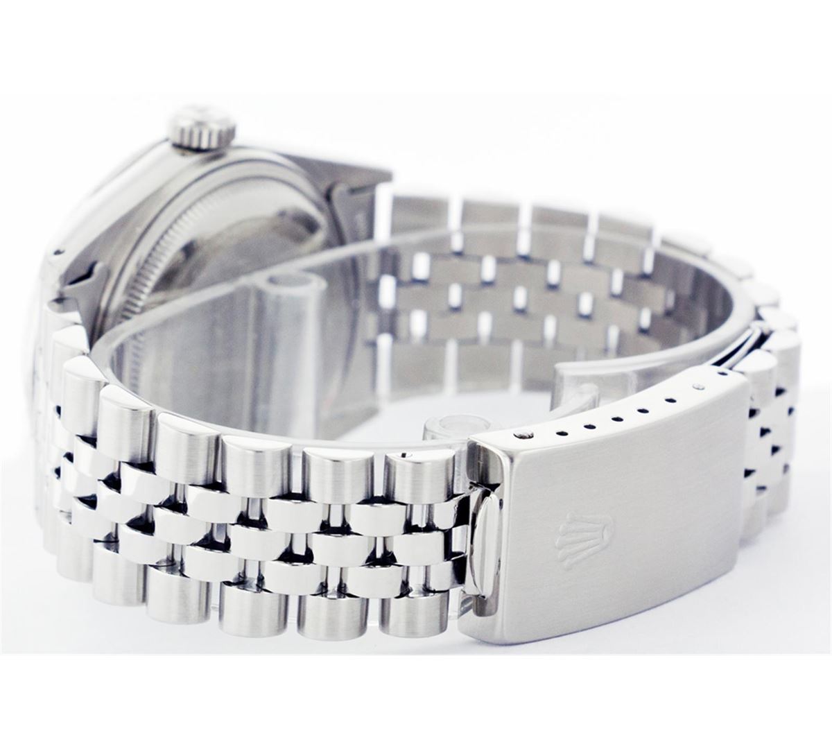 One Mens Rolex Datejust Polished Bright with Satin Finish, Serviced & Electronically Tested, Stainless Steel Case:36mm, Stainless Steel Crown, Custom Bezel: Stainless Steel Beadset Diamond Bezel, Diamond Count: 54 Diamonds Total Weight 1.00 Carat, Clarity: SI-VS, Color: G to H. Custom Crystal: Synthetic Sapphire Cyclops Lens. Movement: Automatic Winding Movement Caliber 3035. Custom Dial: Silver Index Dial With Small Track. Date Window: 3 O'Clock Position Date Display, Quickset, Model: 16014 Condition: G-6 Extra Fine. Bracelet: Stainless Steel Jubilee. Bright Polish & Satin Finish. 6.5 Inch Length, Adjustable. Standard Clasp, With Rolex Logo.