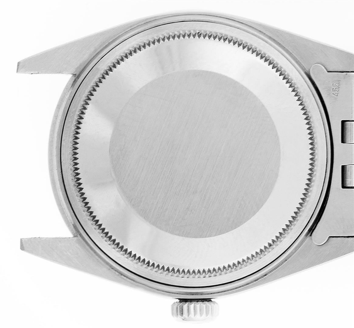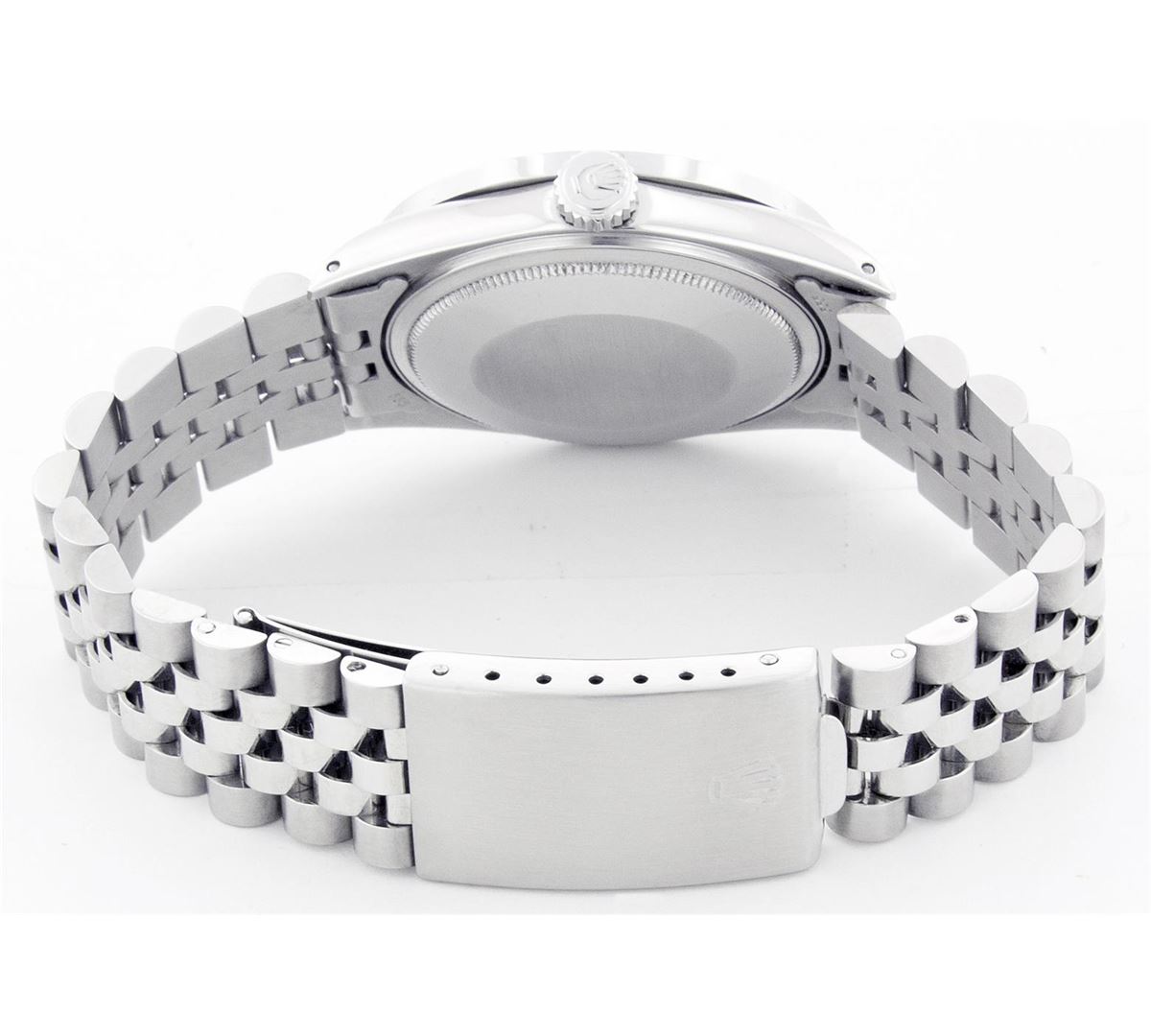 One Gents Rolex Datejust Polished, Serviced & Electronically Tested, Stainless Steel Case:36mm, Stainless Steel Crown, Custom Bezel: Stainless Steel Beadset Diamond Bezel, Diamond Count: 54 Diamonds, Total Weight 1.00 Carat, Clarity: SI-VS, Color: G to H. Custom Crystal: Synthetic Sapphire Cyclops Lens. Movement: Automatic Winding Movement Caliber 3035. Custom Dial: Silver String Diamond Dial, Diamond Count: 54 Diamonds In Dial, Clarity: SI-VS, Color: G to H. Date Window: 3 O'Clock Position Date Display, Quickset, Model: 16014 Condition: G-6 Extra Fine. Bracelet: Stainless Steel Jubilee. Bright Polish & Satin Finish. 6.5 Inch Length, Adjustable. Standard Clasp, With Rolex Logo.