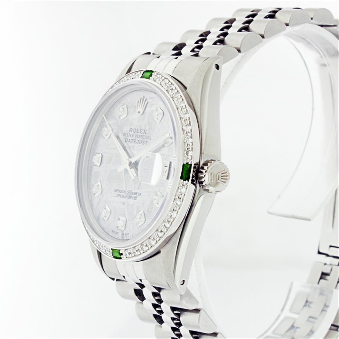 One Gents Stainless Steel Rolex Datejust Polished Bright with Satin Finish, Fully Serviced & Electronically Tested, Stainless Steel Case:36mm, Stainless Steel Crown, Custom Bezel: 18K White Gold Emerald Beadset Diamond Bezel, Diamond Count: 36 Diamonds + 4 Emeralds, Total Weight 1.00 Carat, Clarity: SI-VS, Color: G to H. Custom Crystal: Synthetic Sapphire Cyclops Lens. Movement: Automatic Winding Movement Caliber 3035. Custom Dial: Meteorite Diamond Dial, 10 Diamonds in Dial, G To H In Color, Clarity: SI-VS. Date Window: 3 O'Clock Position Date Display, Quickset, Model: Datejust, Condition: G-6 Extra Fine. Bracelet: Stainless Steel Jubilee. Bright Polish & Satin Finish. 6.5 Inch Length, Adjustable. Standard Clasp, With Rolex Logo.