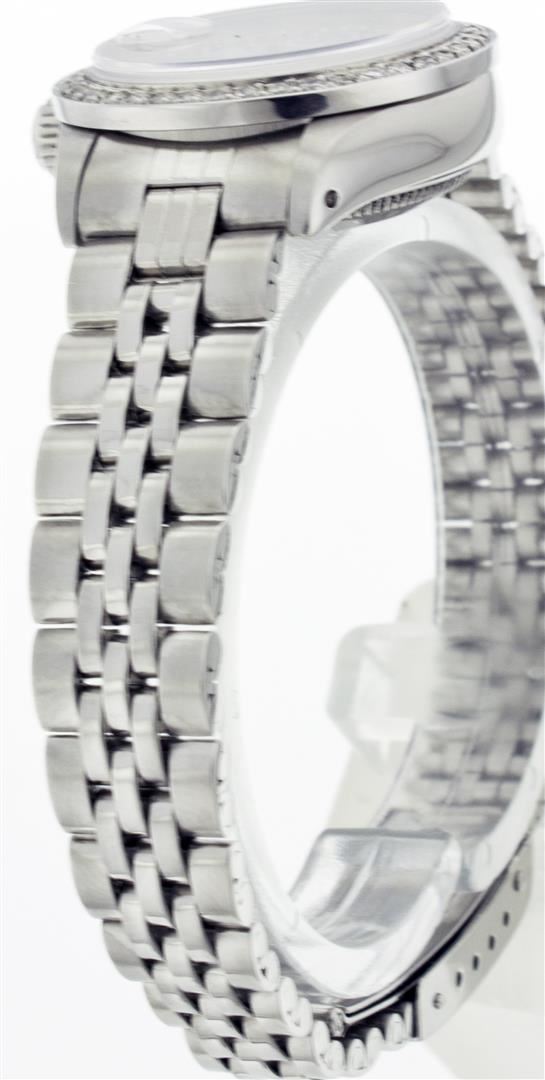 One Ladies Rolex Datejust Polished Bright with Satin Finish, Serviced & Electronically Tested, Stainless Steel Case:26mm, Stainless Steel Crown, Custom Bezel: Stainless Steel Beadset Diamond Bezel, Diamond Count: 40 Diamonds Total Weight 1.00 Carat, Clarity: SI-VS, Color: G to H. Custom Crystal: Synthetic Sapphire Cyclops Lens. Movement: Automatic Winding Movement Caliber 2030. Custom Dial: Mother Of Pearl Ruby String Diamond Dial, Diamond Count: 10 Rubies + 33 Diamonds In Dial, Clarity: SI-VS, Color: G to H. Date Window: 3 O'Clock Position Date Display, Quickset, Model: 6917 Condition: G-6 Extra Fine. Bracelet: Stainless Steel Jubilee Band. Bright Polish & Satin Finish. 5.5 Inch Length, Adjustable. Standard Clasp, With Rolex Logo.