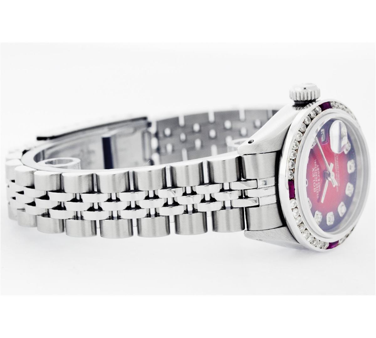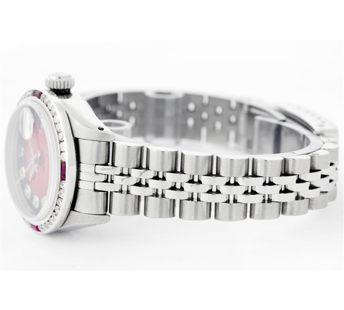 One Ladies Rolex Datejust Polished Bright with Satin Finish, Serviced & Electronically Tested, Stainless Steel Case:26mm, Stainless Steel Crown, Custom Bezel: 18K White Gold Ruby Channel Set Diamond Bezel, Diamond + Gem Count: 36 Diamonds + 4 Rubies Total Weight 1.00 Carat, Clarity: SI-VS, Color: G to H. Custom Crystal: Synthetic Sapphire Cyclops Lens. Movement: Automatic Winding Movement Caliber 2030. Custom Dial: Red Vignette With Diamond Hour Markers, Diamond Count: 10 Diamonds, Clarity: SI-VS, to H. Date Window: 3 O'Clock Position Date Display, Non Quickset, Model: Datejust, Condition: G-6 Extra Fine. Bracelet: Stainless Steel Jubilee. Bright Polish & Satin Finish. 5.5 Inch Length, Adjustable. Standard Clasp, With Rolex Logo.