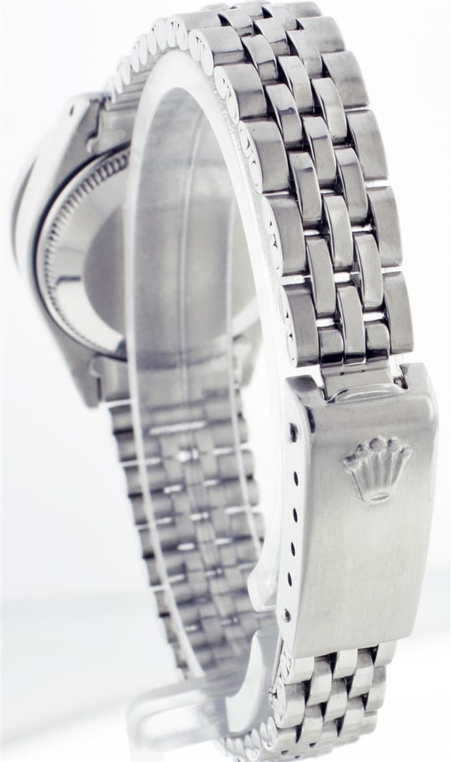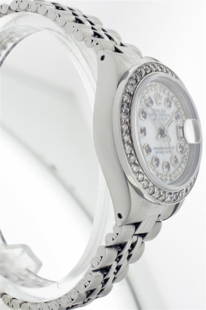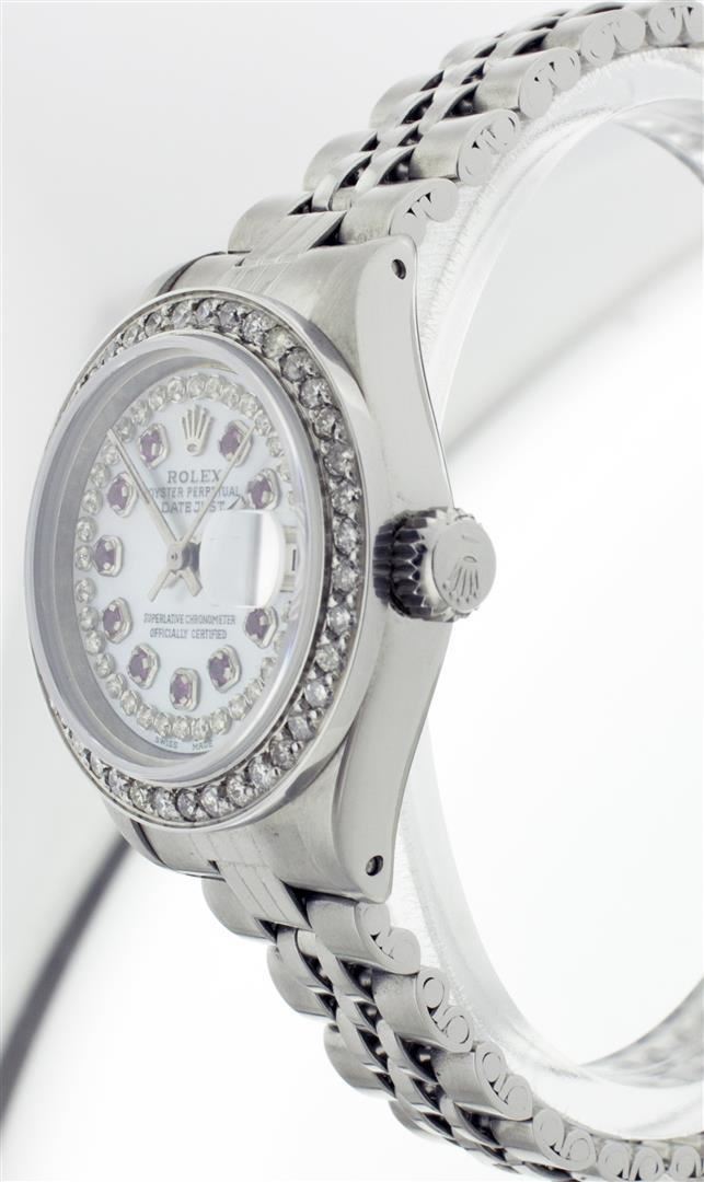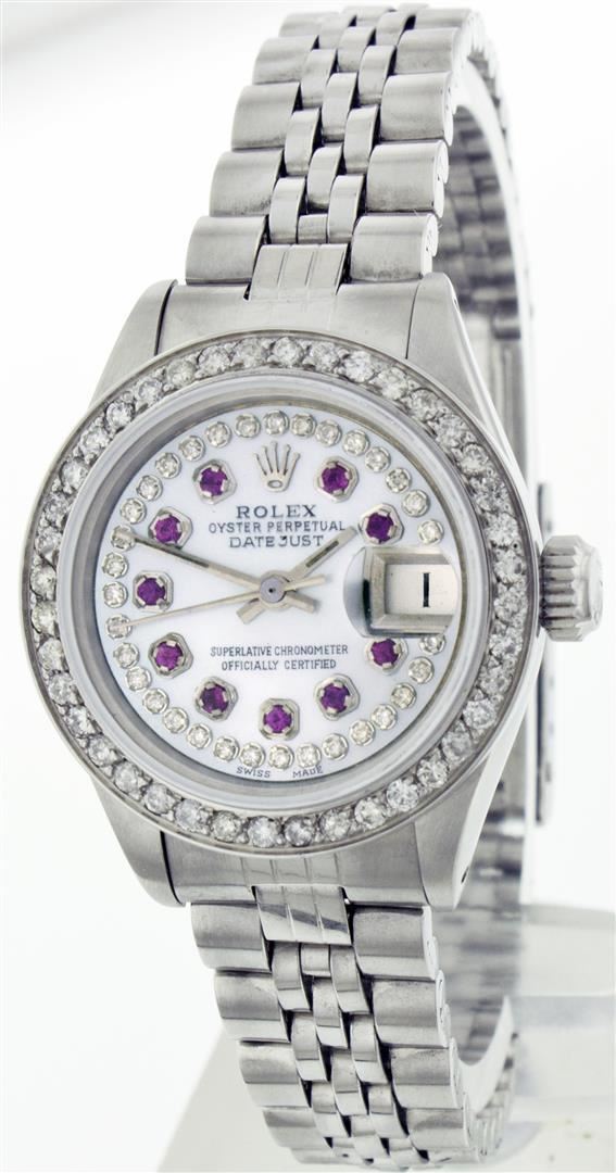 One Ladies Rolex Datejust Polished Bright with Satin Finish, Serviced & Electronically Tested, Stainless Steel Case:26mm, Stainless Steel Crown, Custom Bezel: Stainless Steel Beadset Diamond Bezel, Diamond Count: 40 Diamonds Total Weight 1.00 Carat, Clarity: SI-VS, Color: G to H. Custom Crystal: Synthetic Sapphire Cyclops Lens. Movement: Automatic Winding Movement Caliber 2030. Custom Dial: Mother Of Pearl Ruby String Diamond Dial, Diamond Count: 10 Rubies + 33 Diamonds In Dial, Clarity: SI-VS, Color: G to H. Date Window: 3 O'Clock Position Date Display, Non Quickset, Model: 6917 Condition: G-6 Extra Fine. Bracelet: Stainless Steel Jubilee Band. Bright Polish & Satin Finish. 5.5 Inch Length, Adjustable. Standard Clasp, With Rolex Logo.