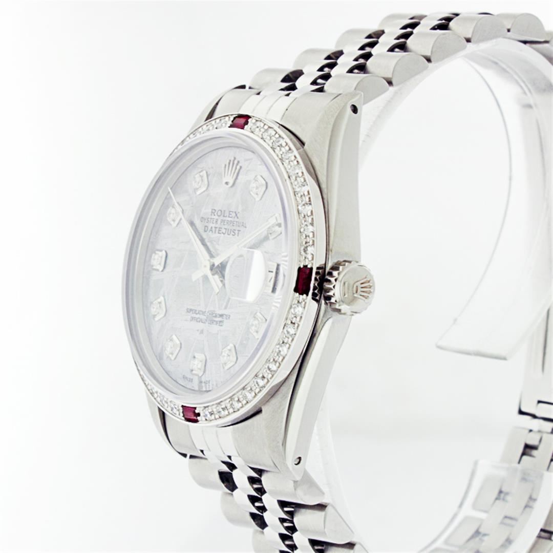 One Gents Stainless Steel Rolex Datejust Polished Bright with Satin Finish, Fully Serviced & Electronically Tested, Stainless Steel Case:36mm, Stainless Steel Crown, Custom Bezel: 18K White Gold Ruby Beadset Diamond Bezel, Diamond Count: 36 Diamonds + 4 Rubies, Total Weight 1.00 Carat, Clarity: SI-VS, Color: G to H. Custom Crystal: Synthetic Sapphire Cyclops Lens. Movement: Automatic Winding Movement Caliber 3035. Custom Dial: Meteorite Diamond Dial, 10 Diamonds in Dial, G To H In Color, Clarity: SI-VS. Date Window: 3 O'Clock Position Date Display, Quickset, Model: Datejust, Condition: G-6 Extra Fine. Bracelet: Stainless Steel Jubilee. Bright Polish & Satin Finish. 6.5 Inch Length, Adjustable. Standard Clasp, With Rolex Logo.