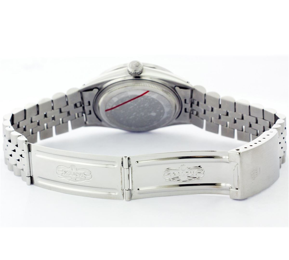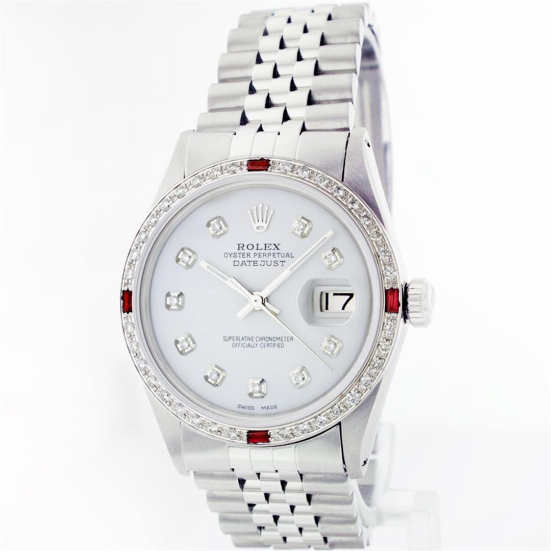 One Gents Stainless Steel Rolex Datejust Polished Bright with Satin Finish, Fully Serviced & Electronically Tested, Stainless Steel Case:36mm, Stainless Steel Crown, Custom Bezel: 18K White Gold Ruby Beadset Diamond Bezel, Diamond Count: 36 Diamonds + 4 Rubies, Total Weight 1.00 Carat, Clarity: SI-VS, Color: G to H. Custom Crystal: Synthetic Sapphire Cyclops Lens. Movement: Automatic Winding Movement Caliber 3035. Custom Dial: Mother Of Pearl Diamond Dial, 10 Diamonds in Dial, G To H In Color, Clarity: SI-VS. Date Window: 3 O'Clock Position Date Display, Quickset, Model: Datejust, Condition: G-6 Extra Fine. Bracelet: Stainless Steel Jubilee. Bright Polish & Satin Finish. 6.5 Inch Length, Adjustable. Standard Clasp, With Rolex Logo.