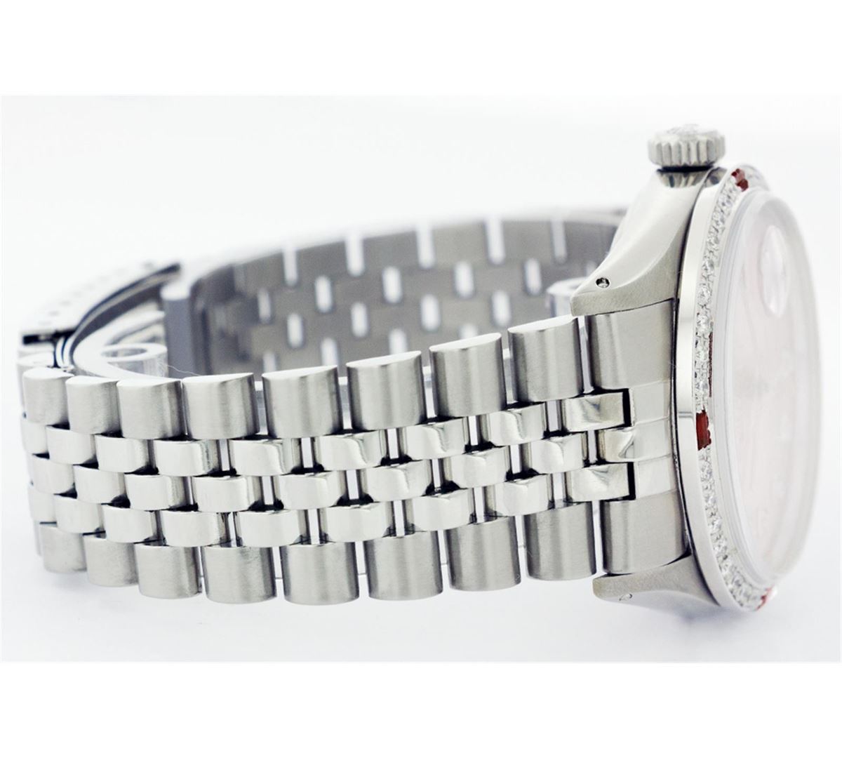 One Gents Stainless Steel Rolex Datejust Polished Bright with Satin Finish, Fully Serviced & Electronically Tested, Stainless Steel Case:36mm, Stainless Steel Crown, Custom Bezel: 18K White Gold Ruby Beadset Diamond Bezel, Diamond Count: 36 Diamonds + 4 Rubies, Total Weight 1.00 Carat, Clarity: SI-VS, Color: G to H. Custom Crystal: Synthetic Sapphire Cyclops Lens. Movement: Automatic Winding Movement Caliber 3035. Custom Dial: Ice Pink Diamond Dial, 10 Diamonds in Dial, G To H In Color, Clarity: SI-VS. Date Window: 3 O'Clock Position Date Display, Quickset, Model: Datejust, Condition: G-6 Extra Fine. Bracelet: Stainless Steel Jubilee. Bright Polish & Satin Finish. 6.5 Inch Length, Adjustable. Standard Clasp, With Rolex Logo.