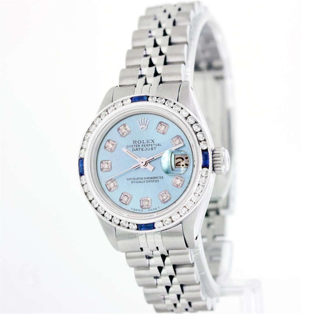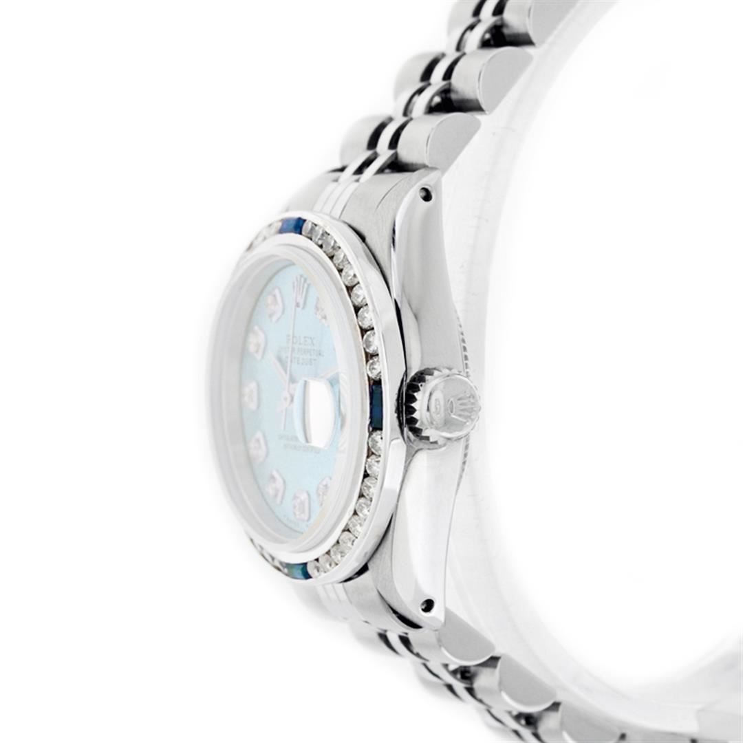 One Ladies Rolex Datejust Polished Bright with Satin Finish, Serviced & Electronically Tested, Stainless Steel Case:26mm, Stainless Steel Crown, Custom Bezel: 18K White Gold Sapphire Channel Set Diamond Bezel, Diamond + Gem Count: 36 Diamonds + 4 Sapphires Total Weight 1.00 Carat, Clarity: SI-VS, Color: G to H. Custom Crystal: Synthetic Sapphire Cyclops Lens. Movement: Automatic Winding Movement Caliber 2030. Custom Dial: Ice Blue Diamond Dial, Diamond Count: 10 Diamonds, Clarity: SI-VS, Color: G to H. Date Window: 3 O'Clock Position Date Display, Non Quickset, Model: Datejust, Condition: G-6 Extra Fine. Bracelet: Stainless Steel Jubilee. Bright Polish & Satin Finish. 5.5 Inch Length, Adjustable. Standard Clasp, With Rolex Logo.
