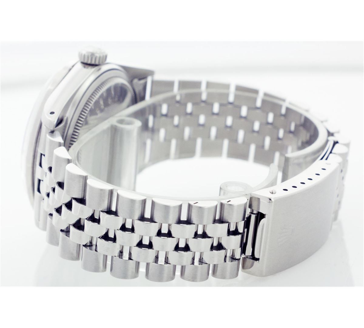 One Gents Rolex Datejust Polished, Serviced & Electronically Tested, Stainless Steel Case:36mm, Stainless Steel Crown, Custom Bezel: 18K White Gold Sapphire Beadset Diamond Bezel, Diamond Count: 36 Diamonds + 4 Sapphires, Total Weight 1.00 Carat, Clarity: SI-VS, Color: G to H. Custom Crystal: Synthetic Sapphire Cyclops Lens. Movement: Automatic Winding Movement Caliber 3035. Custom Dial: Black Diamond Dial, Diamond Count: 10 Diamonds In Dial, Clarity: SI-VS, Color: G to H. Date Window: 3 O'Clock Position Date Display, Quickset, Model: 16014 Condition: G-6 Extra Fine. Bracelet: Stainless Steel Jubilee. Bright Polish & Satin Finish. 6.5 Inch Length, Adjustable. Standard Clasp, With Rolex Logo.