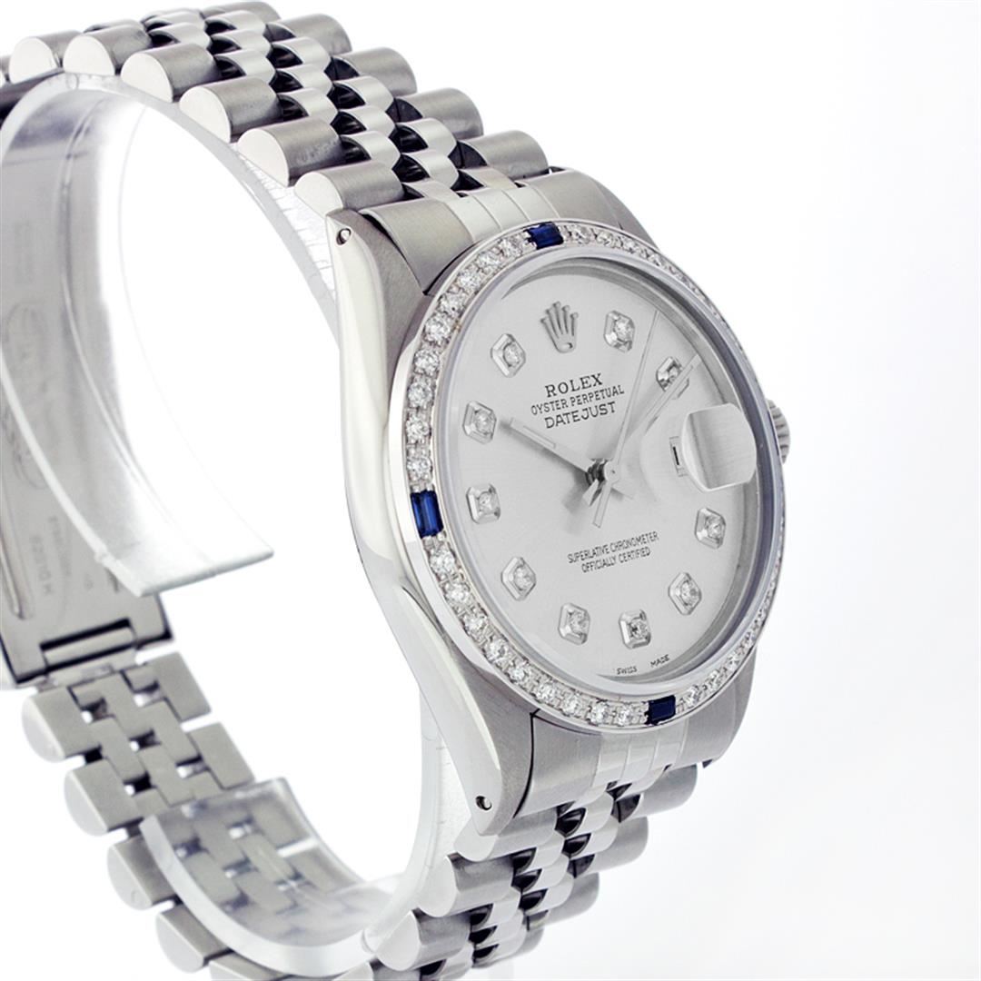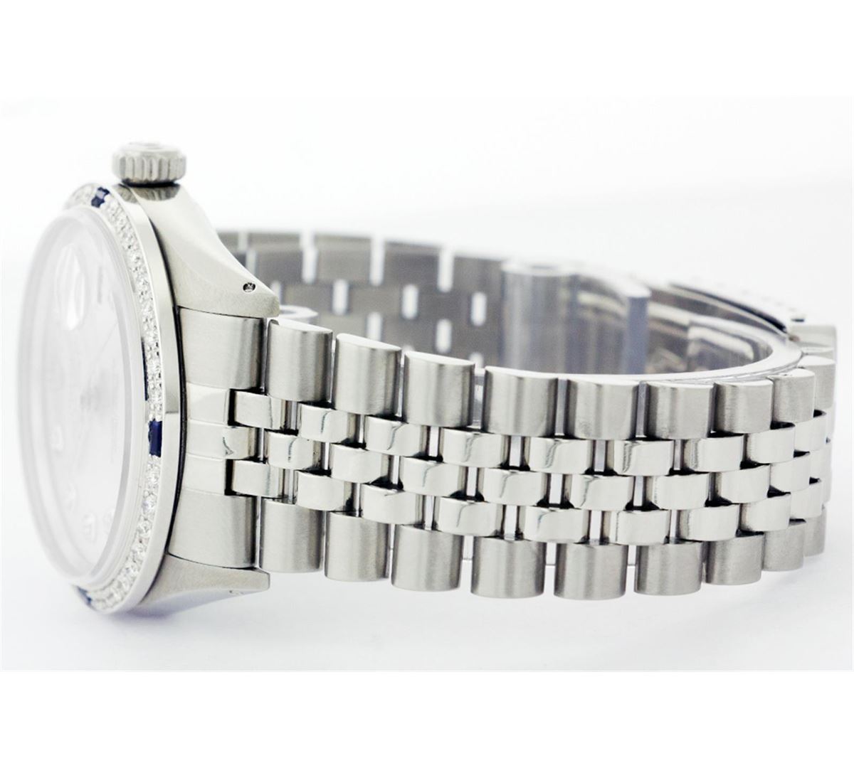 One Mens Stainless Steel Rolex Datejust Polished Bright with Satin Finish, Fully Serviced & Electronically Tested, Stainless Steel Case:36mm, Stainless Steel Crown, Custom Bezel: 18K White Gold Sapphire Beadset Diamond Bezel, Diamond Count: 36 Diamonds + 4 Sapphires, Total Weight 1.00 Carat, Clarity: SI-VS, Color: G to H. Custom Crystal: Synthetic Sapphire Cyclops Lens. Movement: Automatic Winding Movement Caliber 3035. Custom Dial: Silver Diamond Dial, 10 Diamonds in Dial G To H In Color, Clarity: SI-VS. Date Window: 3 O'Clock Position Date Display, Quickset, Model: Datejust, Condition: G-6 Extra Fine. Bracelet:Stainless Steel Jubilee. Bright Polish & Satin Finish. 6.5 Inch Length, Adjustable. Standard Clasp, With Rolex Logo.