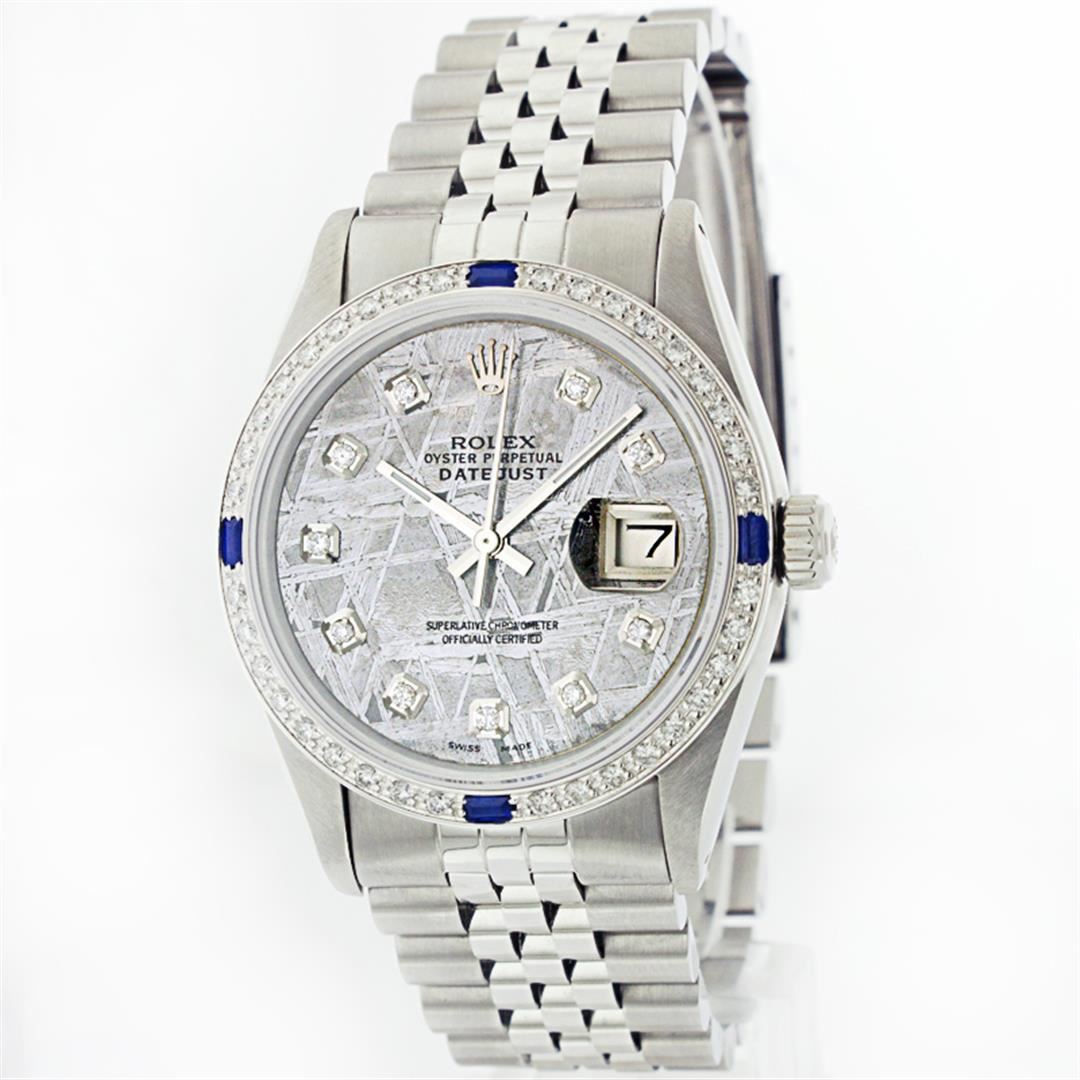 One Gents Stainless Steel Rolex Datejust Polished Bright with Satin Finish, Fully Serviced & Electronically Tested, Stainless Steel Case:36mm, Stainless Steel Crown, Custom Bezel: 18K White Gold Sapphire Beadset Diamond Bezel, Diamond Count: 36 Diamonds + 4 Sapphire, Total Weight 1.00 Carat, Clarity: SI-VS, Color: G to H. Custom Crystal: Synthetic Sapphire Cyclops Lens. Movement: Automatic Winding Movement Caliber 3035. Custom Dial: Meteorite Diamond Dial, 10 Diamonds in Dial, G To H In Color, Clarity: SI-VS. Date Window: 3 O'Clock Position Date Display, Quickset, Model: Datejust, Condition: G-6 Extra Fine. Bracelet: Stainless Steel Jubilee. Bright Polish & Satin Finish. 6.5 Inch Length, Adjustable. Standard Clasp, With Rolex Logo. Comes with a six month warranty card.
