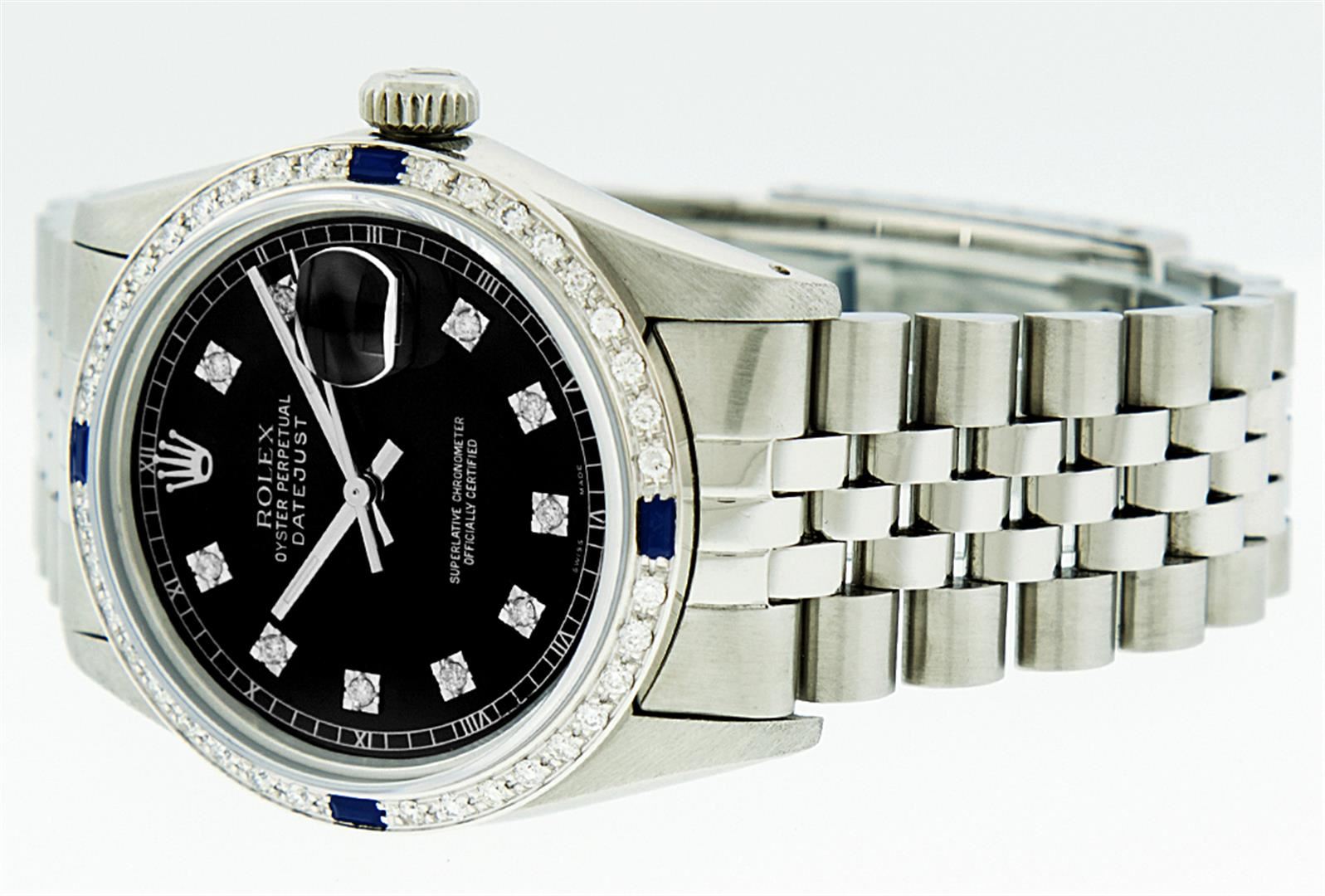 One Mens Rolex Datejust Polished, Serviced & Electronically Tested, Stainless Steel Case:36mm, Stainless Steel Crown, Custom Bezel: 18K White Gold Sapphire Beadset Diamond Bezel, Diamond + Gem Count: 36 Diamonds + 4 Sapphires. Total Weight 1.00 Carat, Clarity: SI-VS, Color: G to H. Custom Crystal: Synthetic Sapphire Cyclops Lens. Movement: Automatic Winding Movement Caliber 3035. Custom Dial: Black With Diamond Hour Markers Square Roman Track, 10 Diamond Dial Square Setting. G To H In Color, Clarity: SI-VS. Date Window: 3 O'Clock Position Date Display, Quickset, Model: Datejust. Condition: G-6 Extra Fine. Bracelet: Stainless Steel Jubilee. Bright Polish & Satin Finish. 7.0 Inch Length, Adjustable. Standard Clasp, With Rolex Logo. Comes with 6 month warranty.