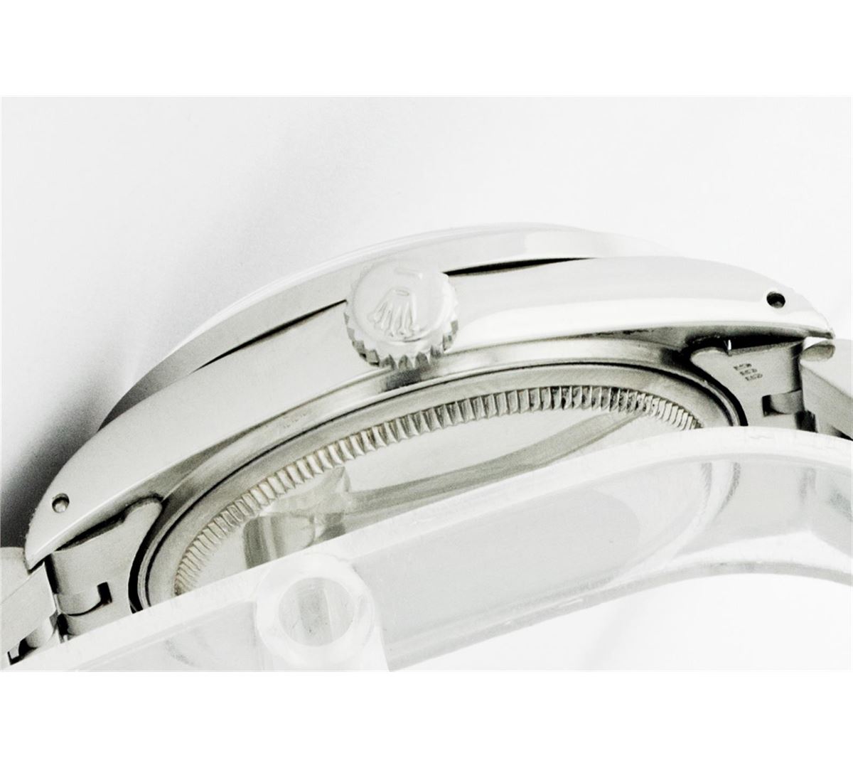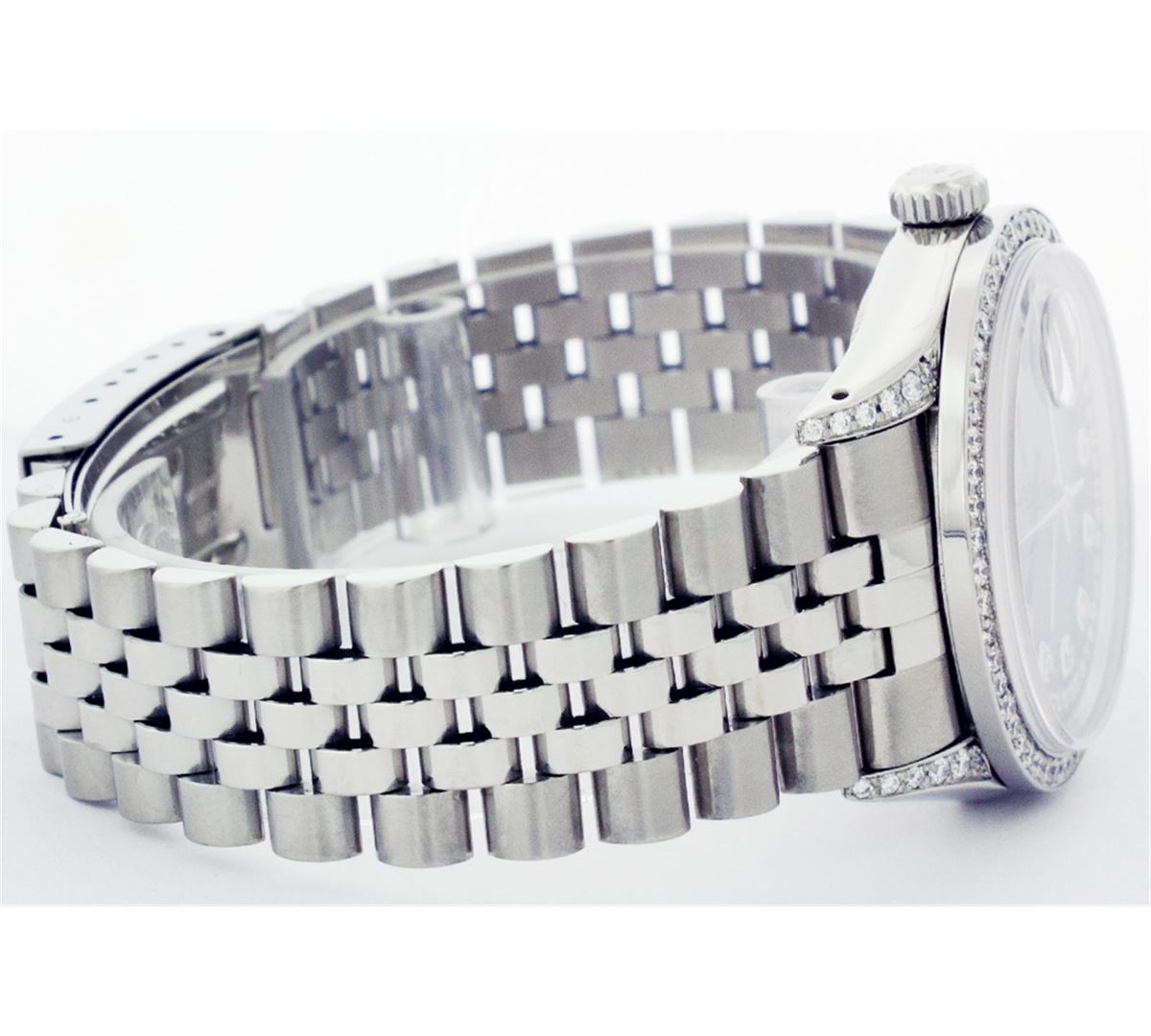 One Gents Rolex Datejust Polished, Serviced & Electronically Tested, Stainless Steel Case:36mm, Diamond Lugs: Clarity SI-VS, Color: G to H. Stainless Steel Crown, Custom Bezel: Stainless Steel Beadset Diamond Bezel. Diamond Count: 54 Diamonds Total Weight 1.2 Carat, Clarity: SI-VS, Color: G to H. Custom Crystal: Synthetic Sapphire Cyclops Lens. Movement: Automatic Winding Movement Caliber 3035. Custom Dial: Black, String Diamond Dial, Diamond Count: 58 Diamonds In Dial, Clarity: SI-VS, Color: G to H. Date Window: 3 O'Clock Position Date Display, Quickset, Model: 16014 Condition: G-6 Extra Fine. Bracelet: Stainless Steel Jubilee. Bright Polish & Satin Finish. 6.5 Inch Length, Adjustable. Standard Clasp, With Rolex Logo.