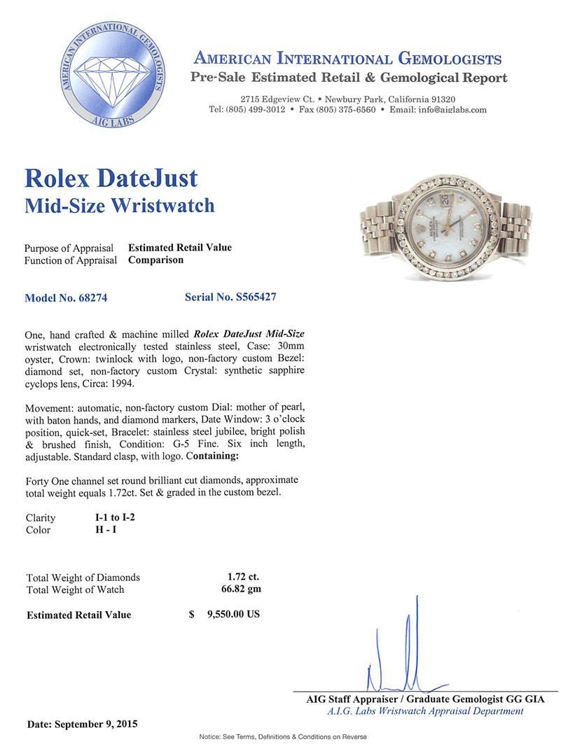 One, hand crafted & machine milled Rolex DateJust Mid-Size wristwatch electronically tested stainless steel, Case: 30mm oyster, Crown: twinlock with logo, non-factory custom Bezel: diamond set, non-factory custom Crystal: synthetic sapphire cyclops lens, Circa: 1994.Movement: automatic, non-factory custom Dial: mother of pearl, with baton hands, and diamond markers, Date Window: 3 o'clock position, quick-set, Bracelet: stainless steel jubilee, bright polish & brushed finish, Condition: G-5 Fine. Six inch length, adjustable. Standard clasp, with logo. Containing: Forty One channel set round brilliant cut diamonds, approximate total weight equals 1.72ct. Set & graded in the custom bezel. Clarity: I-1 to I-2. Color: H - I. Total Weight of Diamonds 1.72ct. Total Weight of Watch 66.82gm. AIG Appraised at $9,550.00.