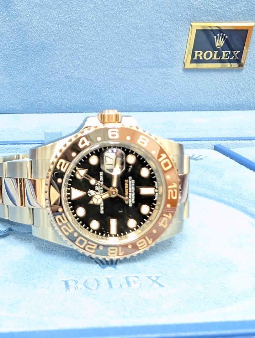 A Rolex GMT Master II "Rootbeer" crafted with a 40mm stainless steel case and an 18K rose gold and ceramic bidirectional bezel. The black dial features luminous hour markers, complemented by narrow baton hands for precise readability. This timepiece is powered by the Superlative Chronometer Calibre 3285 movement, ensuring top-tier accuracy and performance. A sapphire crystal with a Cyclops lens at 3 o'clock enhances visibility. The bracelet combines stainless steel and 18K rose gold in the signature Oyster design, secured with a deployment Oysterlock clasp. Weighing 167.60 grams, this luxury sports watch merges sophistication with functionality.