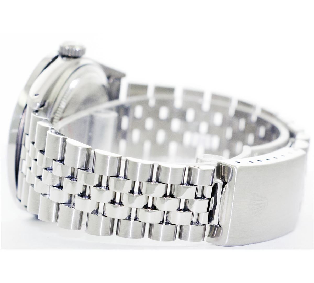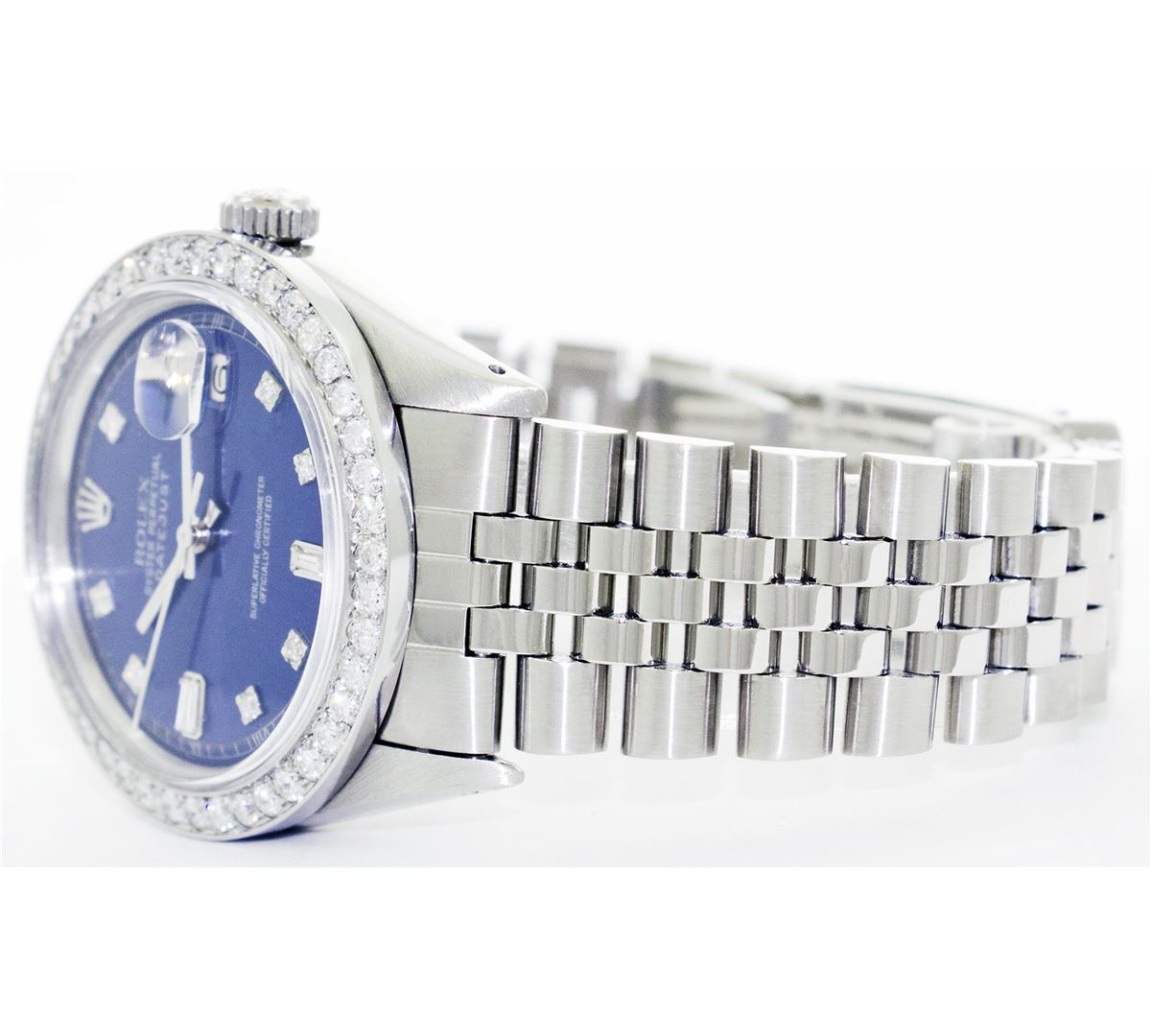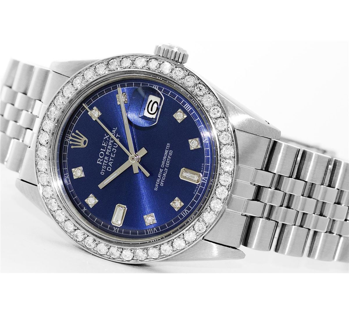 One Gents Rolex Datejust Polished Bright with Satin Finish, Serviced & Electronically Tested, Stainless Steel Case:36mm, Stainless Steel Crown, Custom Bezel: Stainless Steel 2 Carat Diamond Beadset Bezel, Diamond Count: 44 Diamonds Total Weight 2.00 Carat, Clarity: SI-VS, Color: G to H. Custom Crystal: Synthetic Sapphire Cyclops Lens. Movement: Automatic Winding Movement Caliber 3035. Custom Dial: Blue Baguette Diamond Dial, Diamond Count: 8 Diamonds + 2 Baguette, Clarity: SI-VS, Color: G to H. Date Window: 3 O'Clock Position Date Display, Quickset, Model: 16014 Condition: G-6 Extra Fine. Bracelet: Stainless Steel Jubilee. Bright Polish & Satin Finish. 6.5 Inch Length, Adjustable. Standard Clasp, With Rolex Logo.