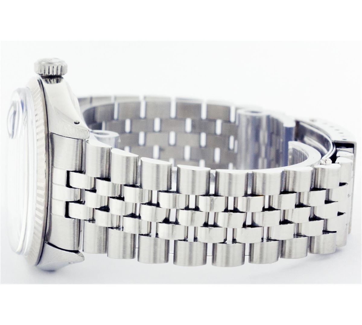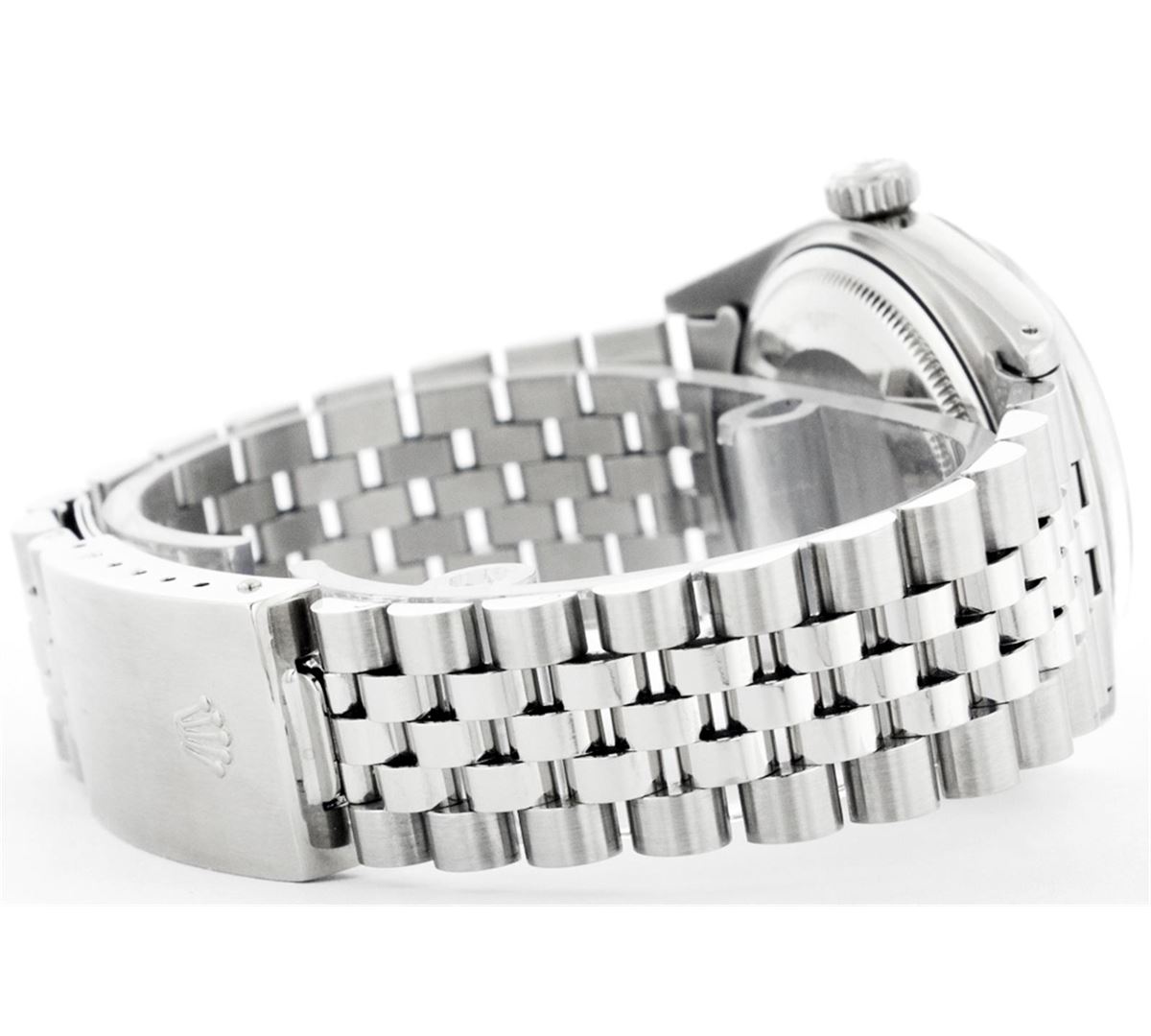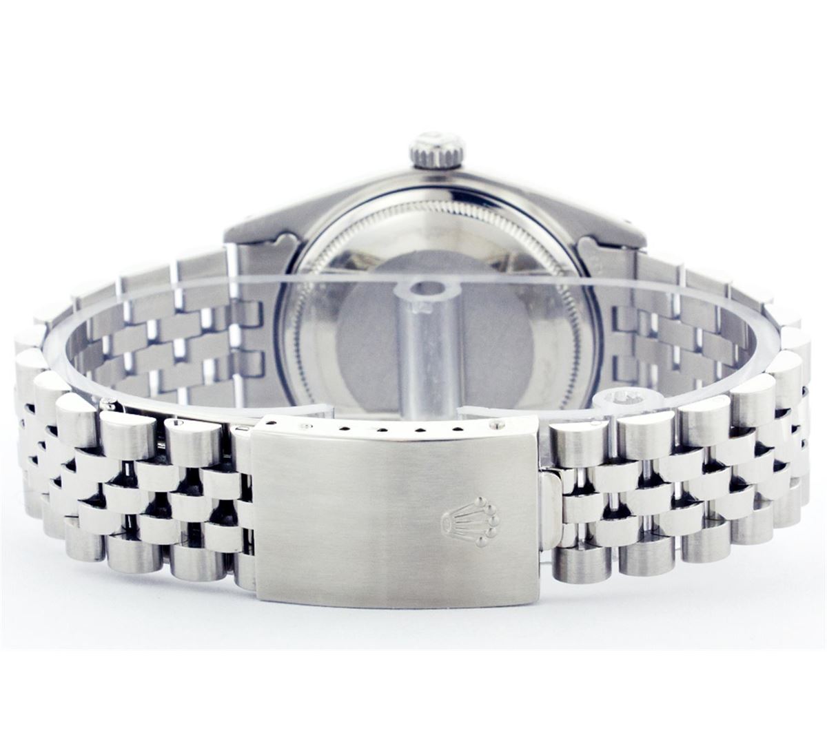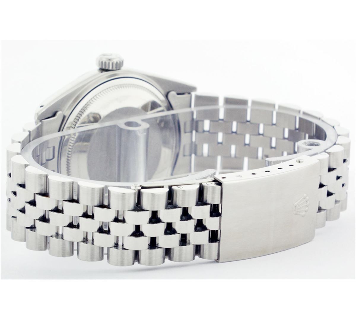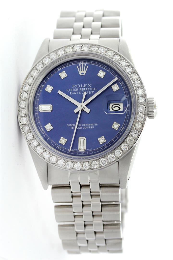 One Gents Rolex Datejust Polished, Serviced & Electronically Tested, Stainless Steel Case:36mm, Stainless Steel Crown, Custom Bezel: Stainless Steel Beadset Diamond Bezel, Diamond Count: 44 Diamonds Total Weight 2.00 Carat, Clarity: SI-VS, Color: G to H. Custom Crystal: Synthetic Sapphire Cyclops Lens. Movement: Automatic Winding Movement Caliber 3035. Custom Dial: Blue With Diamond Hour Markers, 8 Diamonds + 2 Baguettes On Dial G To H In Color, Clarity: SI-VS. Date Window: 3 O'Clock Position Date Display, Quickset, Model: 16014 Condition: G-6 Extra Fine. Bracelet: Stainless Steel Jubilee. Bright Polish & Satin Finish. 6.5 Inch Length, Adjustable. Standard Clasp, With Rolex Logo.
