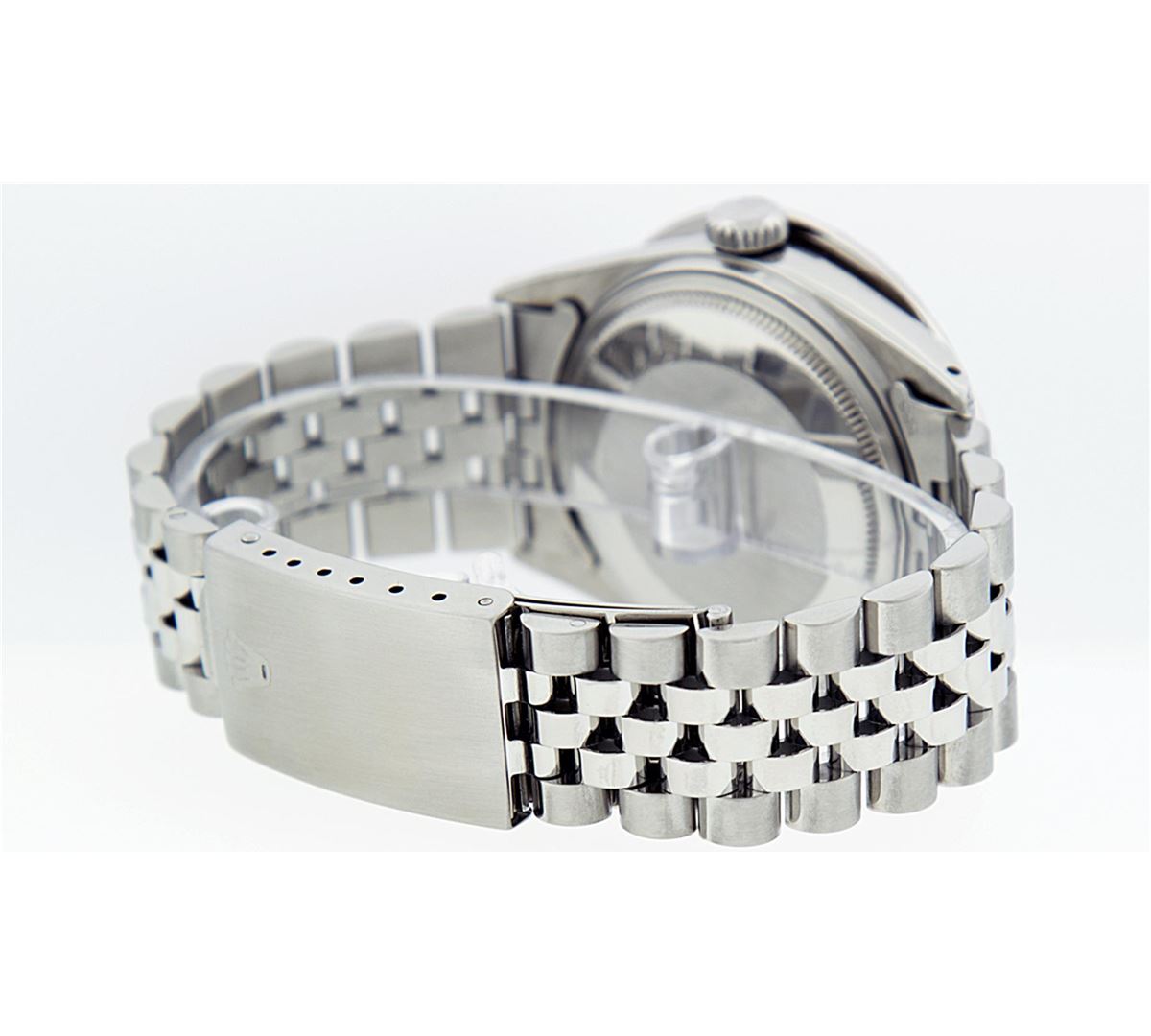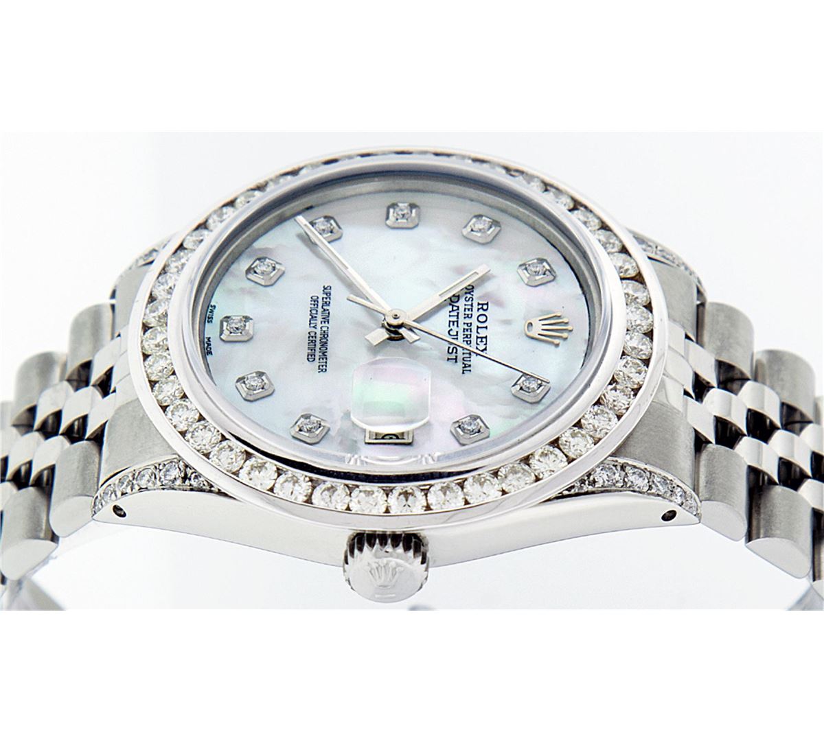 One Mens Rolex Datejust Polished Bright with Satin Finish, Serviced & Electronically Tested, Stainless Steel Case:36mm, Diamond Lugs: 24 Diamonds In Lugs, Color: G to H, Clarity: SI-VS. Stainless Steel Crown, Custom Bezel: 18K White Gold Channel Set Diamond Bezel, Diamond Count: 40 Diamonds, Total Weight 3.00 Carat, Clarity: SI-VS, Color: G to H. Custom Crystal: Synthetic Sapphire Cyclops Lens. Movement: Automatic Winding Movement Caliber 3035. Custom Dial: Mother Of Pearl Diamond, Diamond Count: 10 Diamonds, Diamond Color: G To H In Color, Clarity: SI-VS. Date Window: 3 O'Clock Position Date Display, Quickset, Model: Datejust Condition: G-6 Extra Fine. Bracelet: Stainless Steel Jubilee. Bright Polish & Satin Finish. 7.0 Inch Length, Adjustable. Standard Clasp, With Rolex Logo. Comes with 6 month warranty.