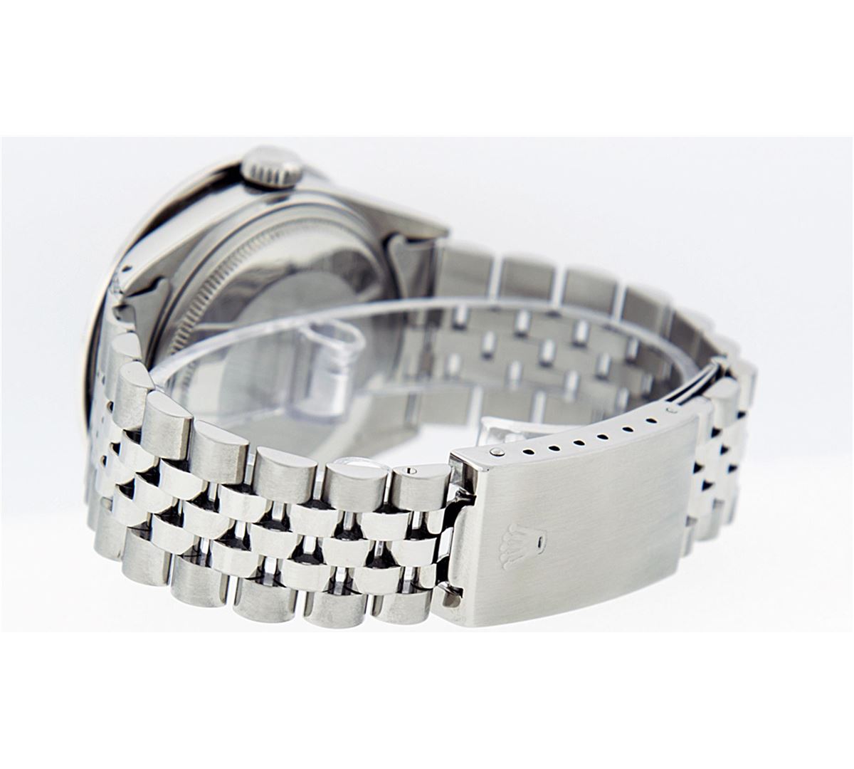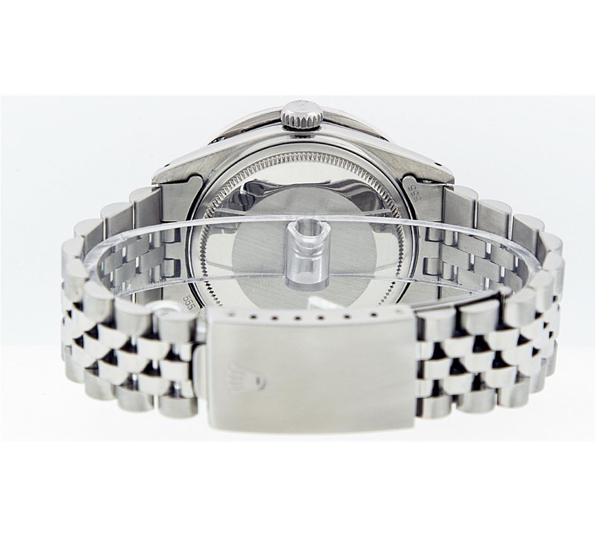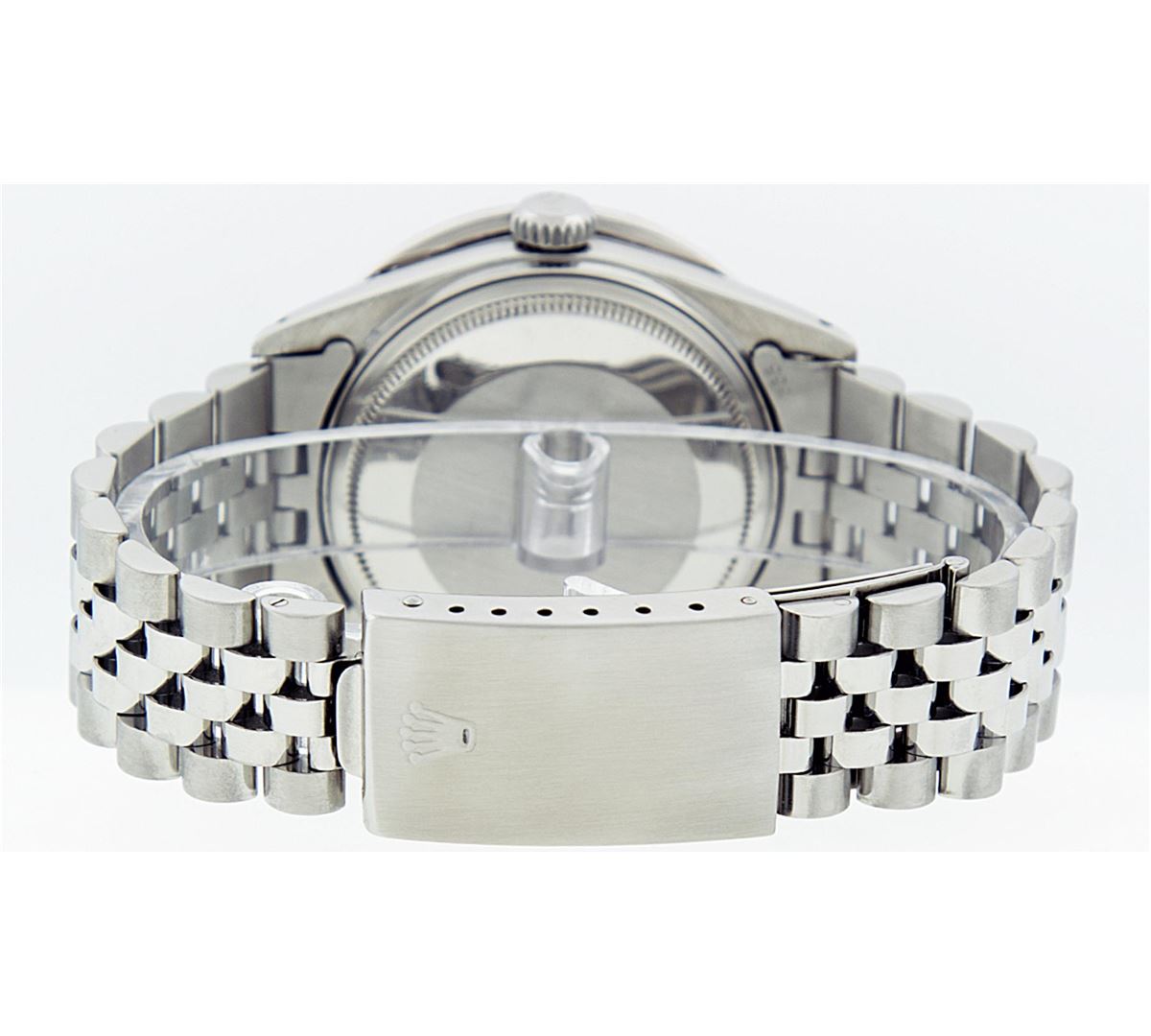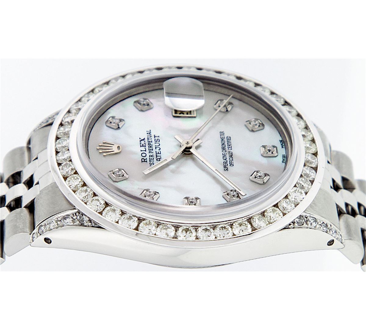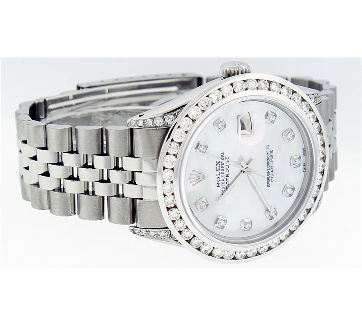 One Mens Rolex Datejust Polished Bright with Satin Finish, Serviced & Electronically Tested, Stainless Steel Case:36mm, Diamond Lugs: 24 Diamonds In Lugs, Color: G to H, Clarity: SI-VS. Stainless Steel Crown, Custom Bezel: 18K White Gold Channel Set Diamond Bezel, Diamond Count: 40 Diamonds, Total Weight 3.00 Carat, Clarity: SI-VS, Color: G to H. Custom Crystal: Synthetic Sapphire Cyclops Lens. Movement: Automatic Winding Movement Caliber 3035. Custom Dial: Mother Of Pearl Diamond, Diamond Count: 10 Diamonds, Diamond Color: G To H In Color, Clarity: SI-VS. Date Window: 3 O'Clock Position Date Display, Quickset, Model: Datejust Condition: G-6 Extra Fine. Bracelet: Stainless Steel Jubilee. Bright Polish & Satin Finish. 7.0 Inch Length, Adjustable. Standard Clasp, With Rolex Logo. Comes with 6 month warranty.