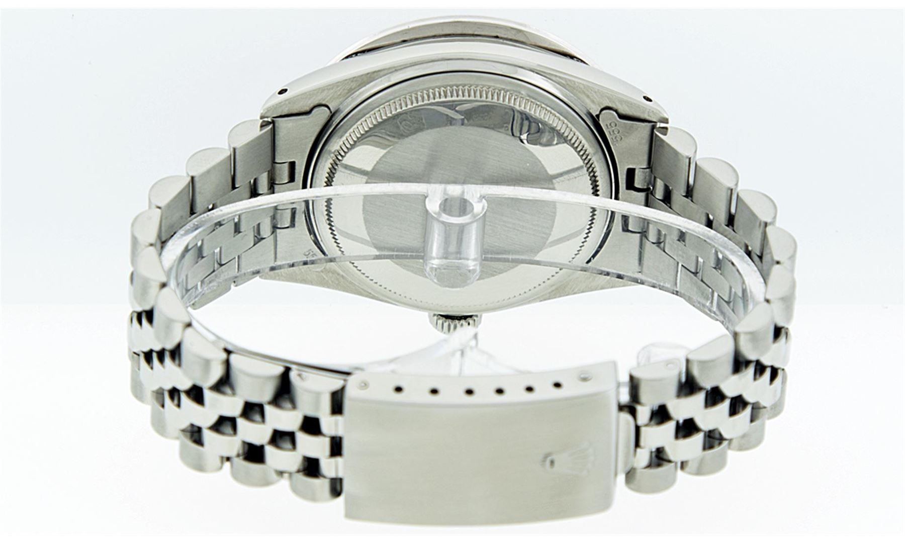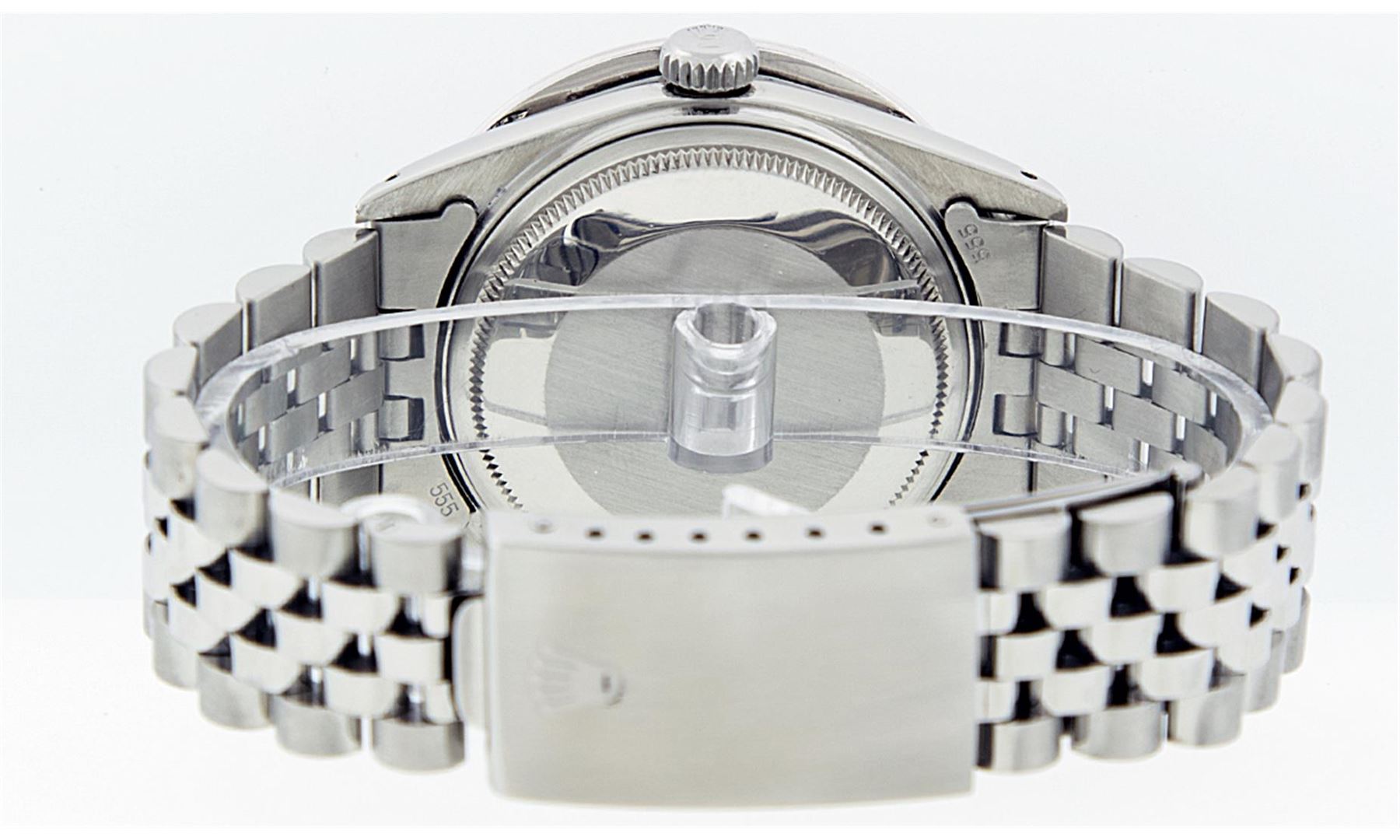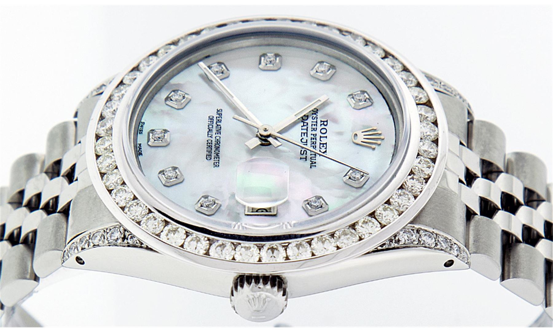 One Mens Rolex Datejust Polished Bright with Satin Finish, Serviced & Electronically Tested, Stainless Steel Case:36mm, Diamond Lugs: 24 Diamonds In Lugs, Color: G to H, Clarity: SI-VS. Stainless Steel Crown, Custom Bezel: 18K White Gold Channel Set Diamond Bezel, Diamond Count: 40 Diamonds, Total Weight 3.00 Carat, Clarity: SI-VS, Color: G to H. Custom Crystal: Synthetic Sapphire Cyclops Lens. Movement: Automatic Winding Movement Caliber 3035. Custom Dial: Mother Of Pearl Diamond, Diamond Count: 10 Diamonds, Diamond Color: G To H In Color, Clarity: SI-VS. Date Window: 3 O'Clock Position Date Display, Quickset, Model: Datejust Condition: G-6 Extra Fine. Bracelet: Stainless Steel Jubilee. Bright Polish & Satin Finish. 7.0 Inch Length, Adjustable. Standard Clasp, With Rolex Logo. Comes with 6 month warranty.