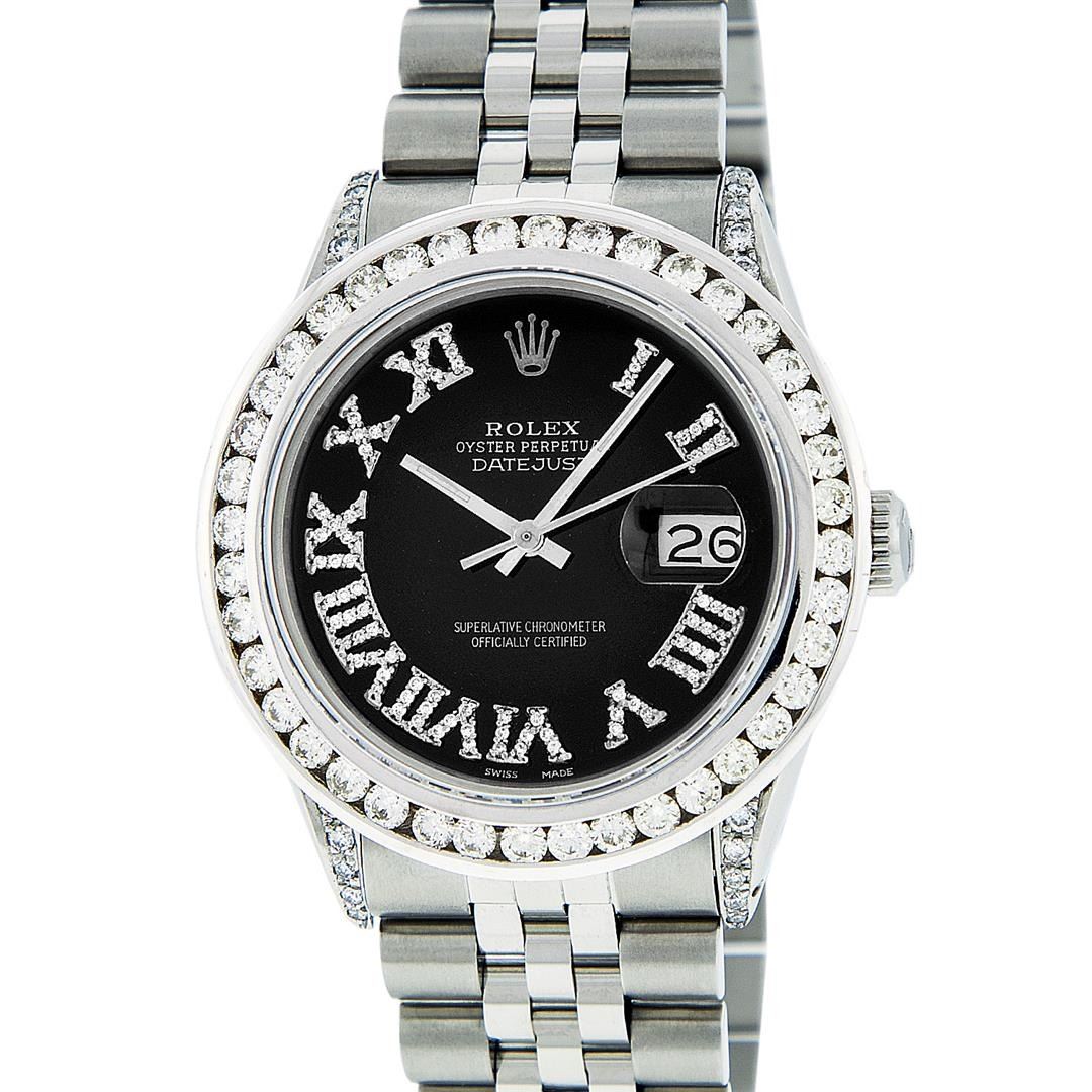 One Mens Rolex Datejust Polished Bright with Satin Finish, Serviced & Electronically Tested, Stainless Steel Case:36mm, Diamond Lugs: 24 Diamonds In Lugs, Color: G to H, Clarity: SI-VS. Stainless Steel Crown, Custom Bezel: 18K White Gold Channel Set Diamond Bezel, Diamond Count: 40 Diamonds, Total Weight 3.00 Carat, Clarity: SI-VS, Color: G to H. Custom Crystal: Synthetic Sapphire Cyclops Lens. Movement: Automatic Winding Movement Caliber 3035. Custom Dial: Black Roman Diamond Dial, Diamond Color: G To H In Color, Clarity: SI-VS. Date Window: 3 O'Clock Position Date Display, Quickset, Model: Datejust Condition: G-6 Extra Fine. Bracelet: Stainless Steel Jubilee. Bright Polish & Satin Finish. 7.0 Inch Length, Adjustable. Standard Clasp, With Rolex Logo. Comes with 6 month warranty.