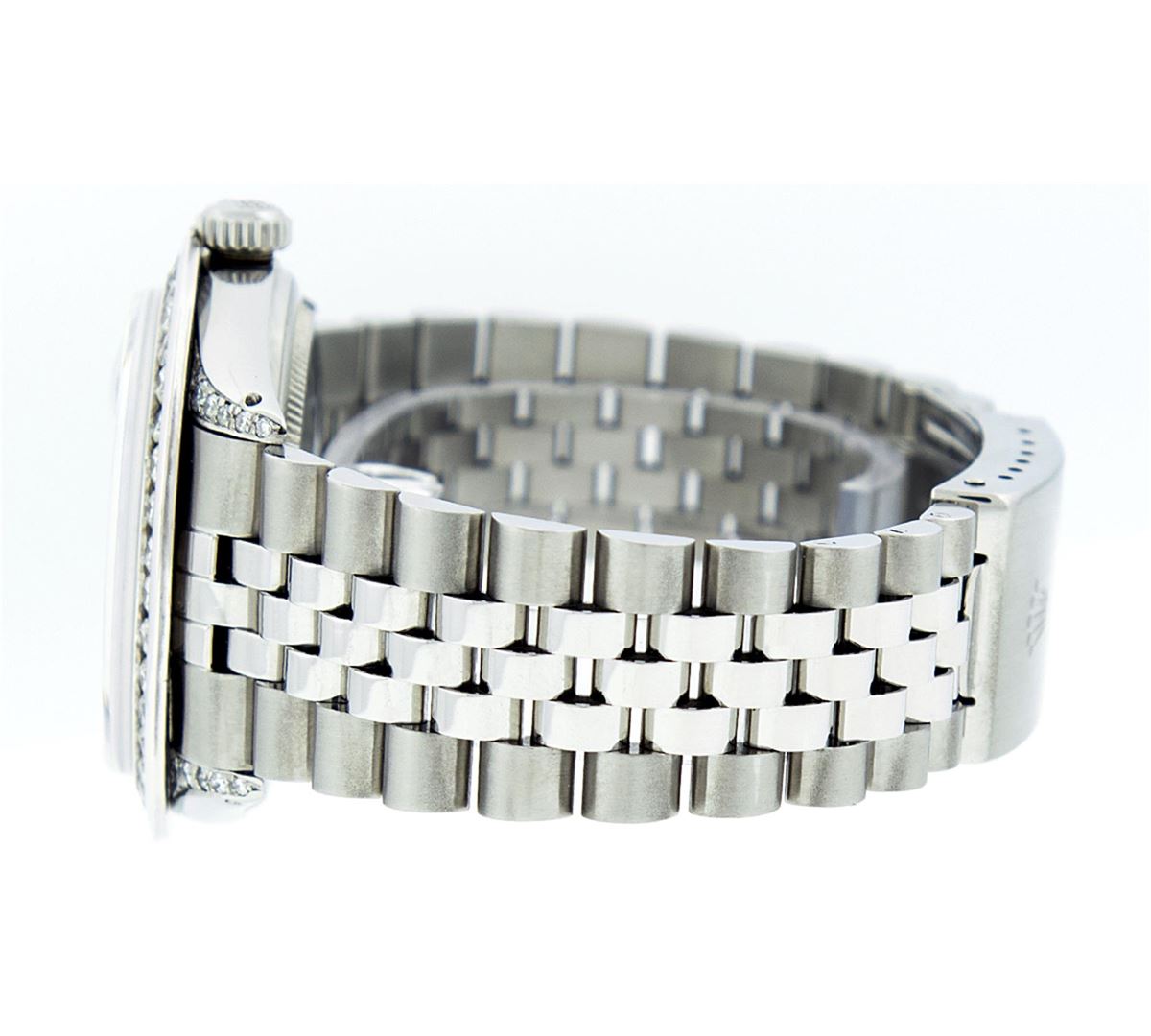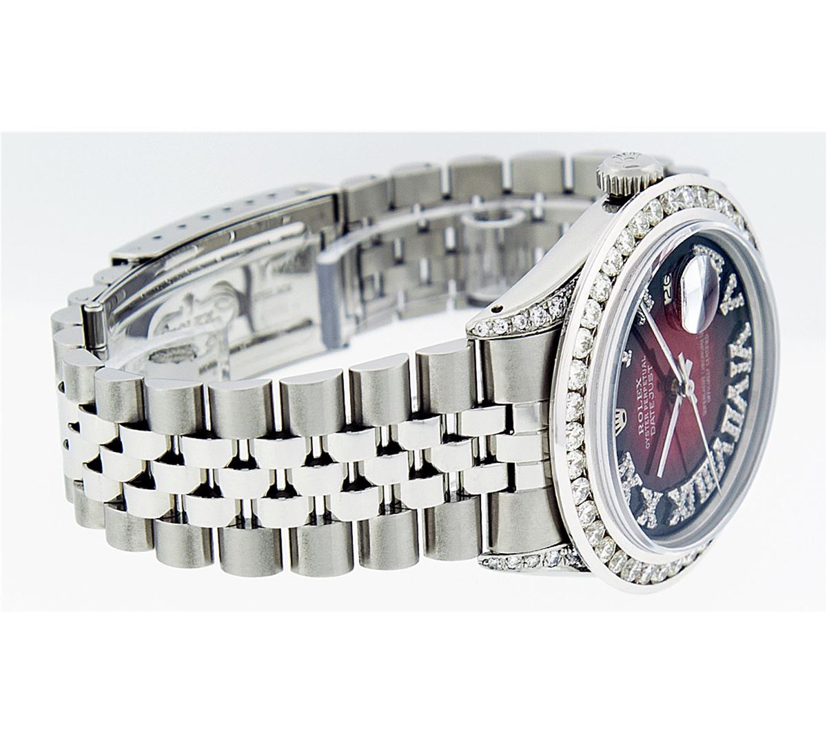 One Mens Rolex Datejust Polished Bright with Satin Finish, Serviced & Electronically Tested, Stainless Steel Case:36mm, Diamond Lugs: 24 Diamonds In Lugs, Color: G to H, Clarity: SI-VS. Stainless Steel Crown, Custom Bezel: 18K White Gold Channel Set Diamond Bezel, Diamond Count: 40 Diamonds, Total Weight 3.00 Carat, Clarity: SI-VS, Color: G to H. Custom Crystal: Synthetic Sapphire Cyclops Lens. Movement: Automatic Winding Movement Caliber 3035. Custom Dial: Red Vignette Roman Diamond Dial, Diamond Color: G To H In Color, Clarity: SI-VS. Date Window: 3 O'Clock Position Date Display, Quickset, Model: Datejust Condition: G-6 Extra Fine. Bracelet: Stainless Steel Jubilee. Bright Polish & Satin Finish. 7.0 Inch Length, Adjustable. Standard Clasp, With Rolex Logo. Comes with 6 month warranty.