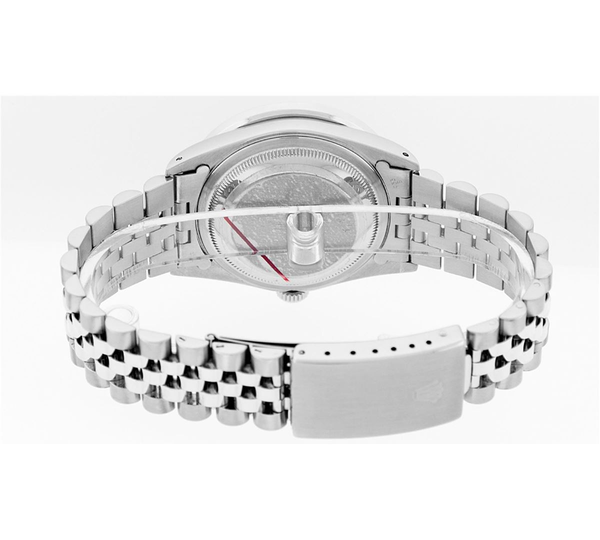 One Mens Rolex Datejust Polished Bright with Satin Finish, Serviced & Electronically Tested, Stainless Steel Case:36mm, Diamond Lugs: 24 Diamonds In Lugs, Color: G to H, Clarity: SI-VS. Stainless Steel Crown, Custom Bezel: 18K White Gold Channel Set Diamond Bezel, Diamond Count: 40 Diamonds, Total Weight 3.00 Carat, Clarity: SI-VS, Color: G to H. Custom Crystal: Synthetic Sapphire Cyclops Lens. Movement: Automatic Winding Movement Caliber 3035. Custom Dial: Green Vignette Roman Diamond Dial, Diamond Color: G To H In Color, Clarity: SI-VS. Date Window: 3 O'Clock Position Date Display, Quickset, Model: Datejust Condition: G-6 Extra Fine. Bracelet: Stainless Steel Jubilee. Bright Polish & Satin Finish. 7.0 Inch Length, Adjustable. Standard Clasp, With Rolex Logo. Comes with 6 month warranty.