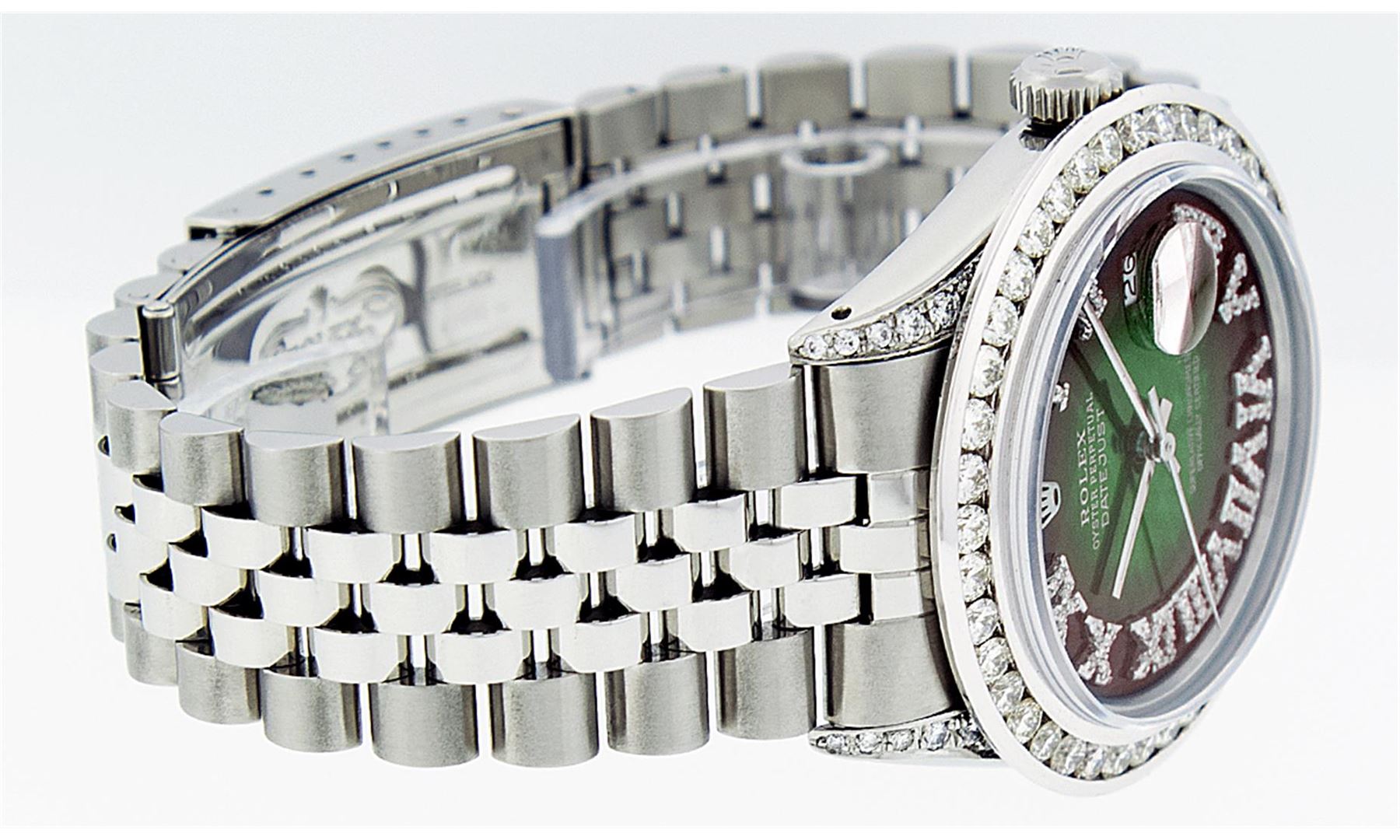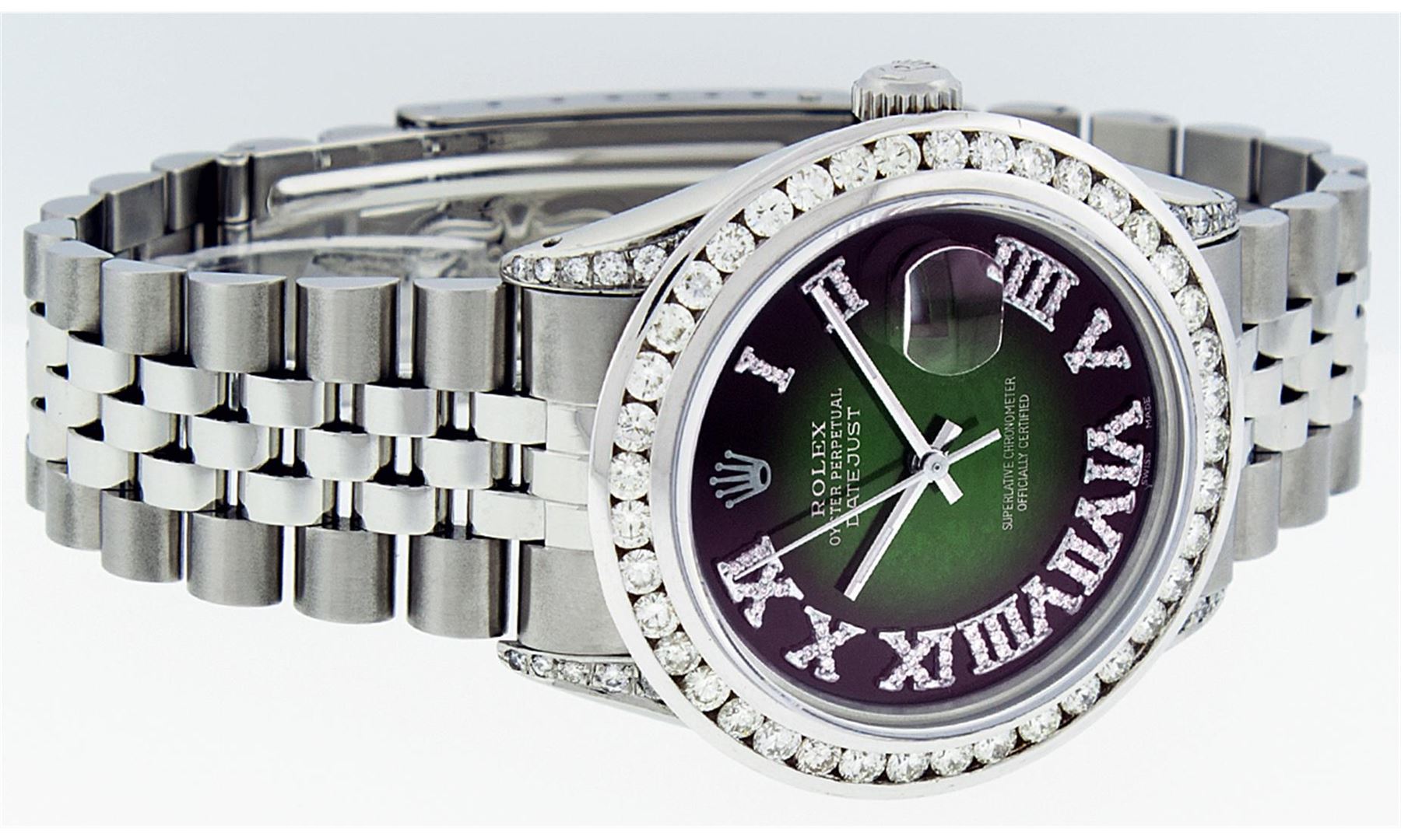 One Mens Rolex Datejust Polished Bright with Satin Finish, Serviced & Electronically Tested, Stainless Steel Case:36mm, Diamond Lugs: 24 Diamonds In Lugs, Color: G to H, Clarity: SI-VS. Stainless Steel Crown, Custom Bezel: 18K White Gold Channel Set Diamond Bezel, Diamond Count: 40 Diamonds, Total Weight 3.00 Carat, Clarity: SI-VS, Color: G to H. Custom Crystal: Synthetic Sapphire Cyclops Lens. Movement: Automatic Winding Movement Caliber 3035. Custom Dial: Green Vignette Roman Diamond Dial, Diamond Color: G To H In Color, Clarity: SI-VS. Date Window: 3 O'Clock Position Date Display, Quickset, Model: Datejust Condition: G-6 Extra Fine. Bracelet: Stainless Steel Jubilee. Bright Polish & Satin Finish. 7.0 Inch Length, Adjustable. Standard Clasp, With Rolex Logo. Comes with 6 month warranty.