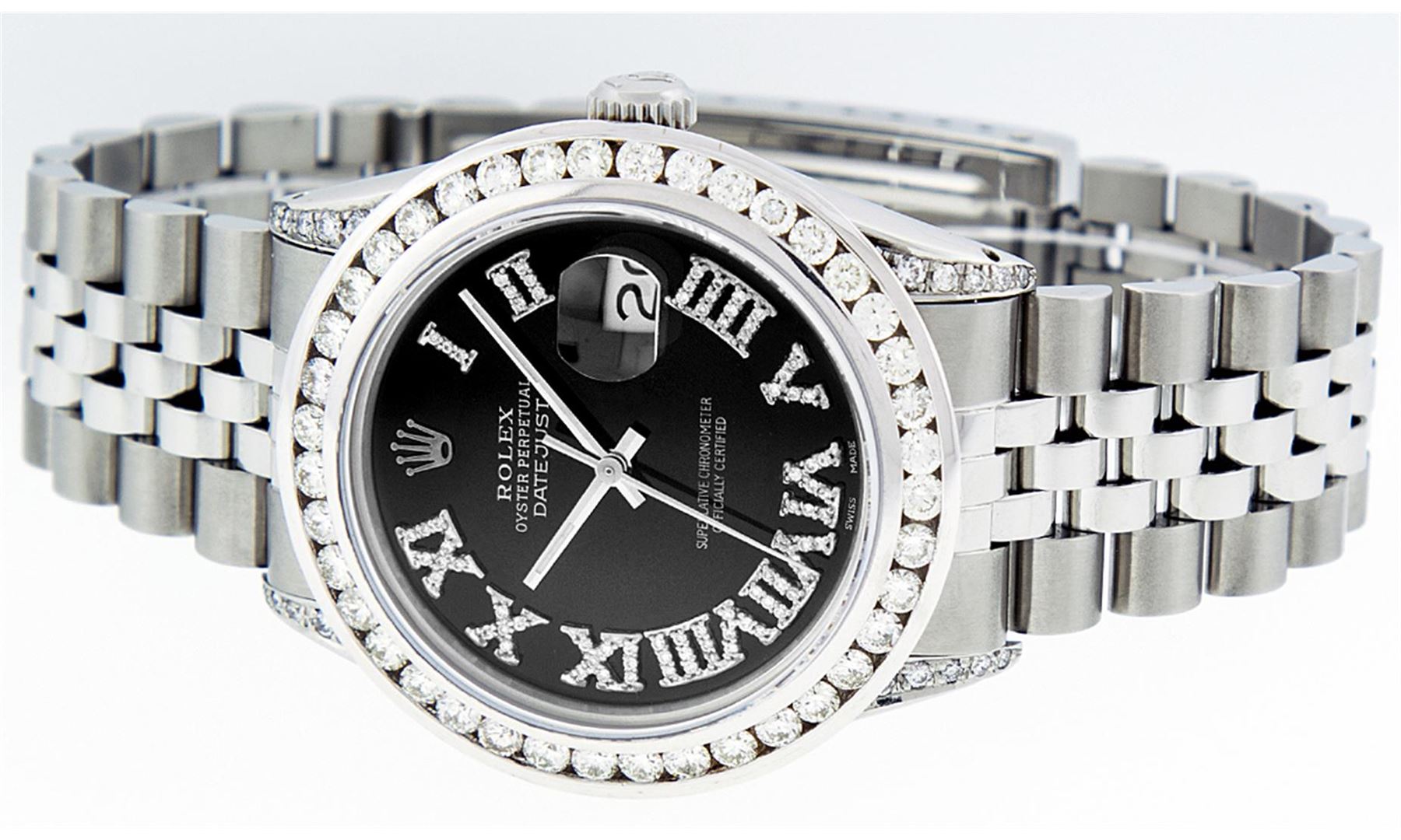 One Mens Rolex Datejust Polished Bright with Satin Finish, Serviced & Electronically Tested, Stainless Steel Case:36mm, Diamond Lugs: 24 Diamonds In Lugs, Color: G to H, Clarity: SI-VS. Stainless Steel Crown, Custom Bezel: 18K White Gold Channel Set Diamond Bezel, Diamond Count: 40 Diamonds, Total Weight 3.00 Carat, Clarity: SI-VS, Color: G to H. Custom Crystal: Synthetic Sapphire Cyclops Lens. Movement: Automatic Winding Movement Caliber 3035. Custom Dial: Black Roman Diamond Dial, Diamond Color: G To H In Color, Clarity: SI-VS. Date Window: 3 O'Clock Position Date Display, Quickset, Model: Datejust Condition: G-6 Extra Fine. Bracelet: Stainless Steel Jubilee. Bright Polish & Satin Finish. 7.0 Inch Length, Adjustable. Standard Clasp, With Rolex Logo. Comes with 6 month warranty.