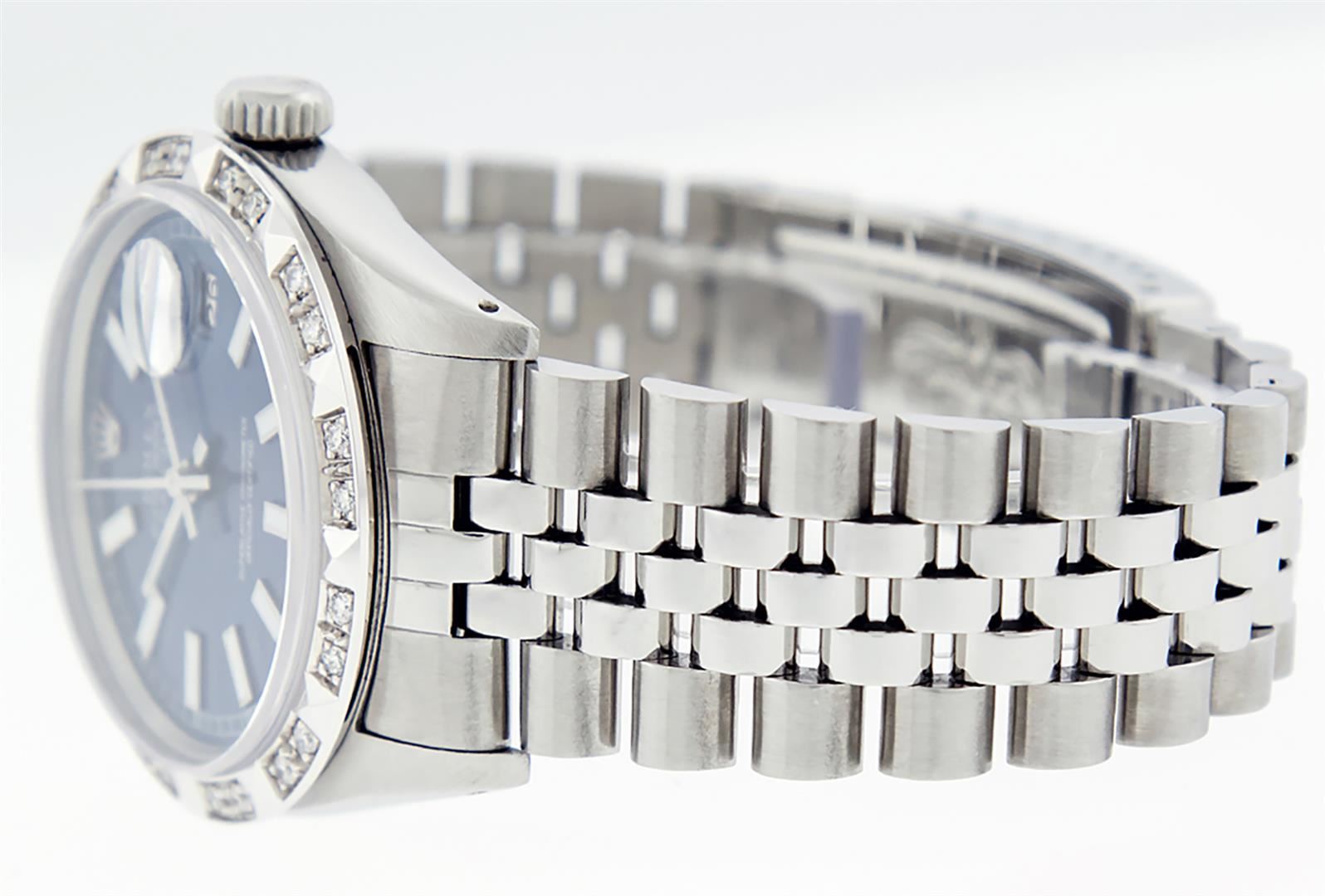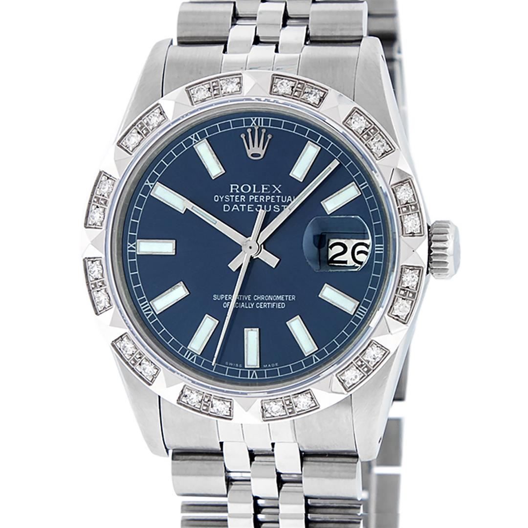One Mens Stainless Steel Rolex Datejust Polished Bright with Satin Finish, Serviced & Electronically Tested, Stainless Steel Case: 36mm, Stainless Steel Crown, Custom Bezel: New 18K White Gold Pyramid Diamond Bezel, Diamond Count: 24 Diamonds, Total Weight .70 Carat, Clarity: SI-VS, Color: G to H. Custom Crystal: New Synthetic Sapphire Cyclops Lens. Custom Hands: New Luminescent Hands. Movement: Automatic Winding Movement. Custom Dial: Blue Index Dial. Date Window: 3 O'Clock Position Date Display, Quickset, Model: Datejust. Condition: G-6 Extra Fine. Bracelet: Stainless Steel Jubilee. Bright Polish & Satin Finish. 7.0 Inch Length, Adjustable. Standard Clasp, With Rolex Logo. This Watch Has Been Serviced Time Tested And Is In Excellent Condition It Is Free Of All Scratches And Dents.