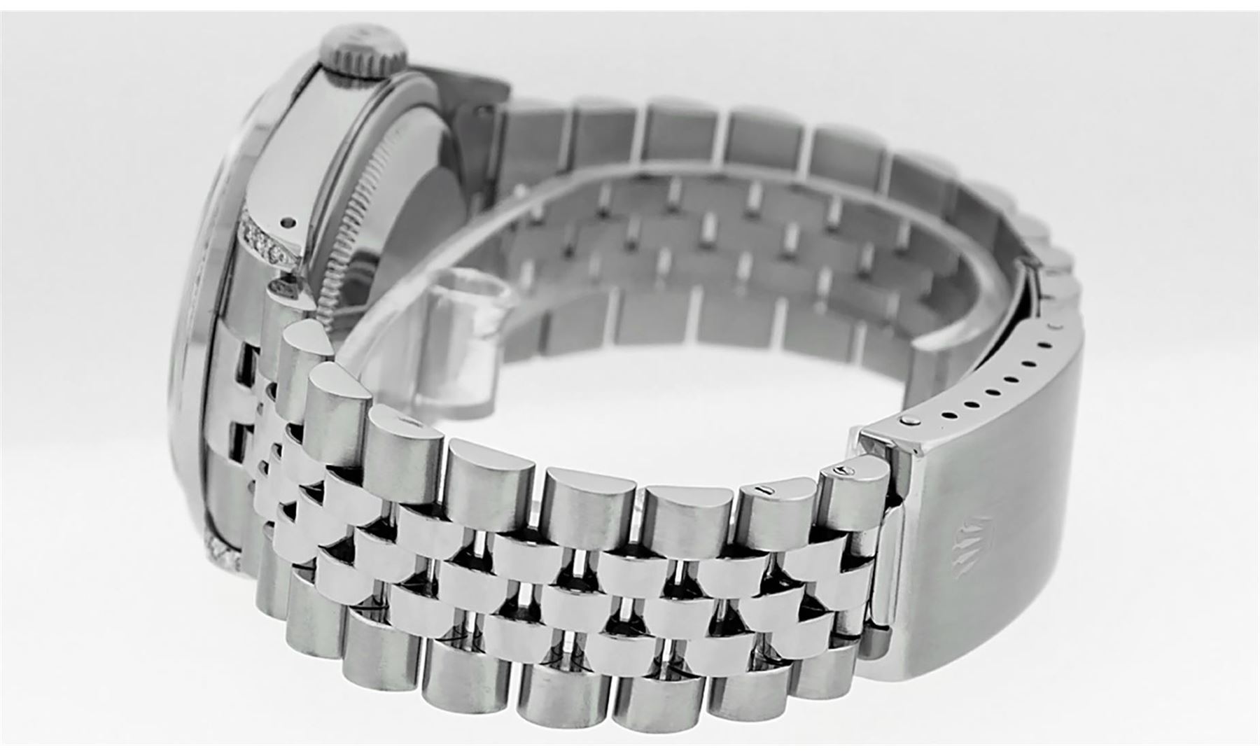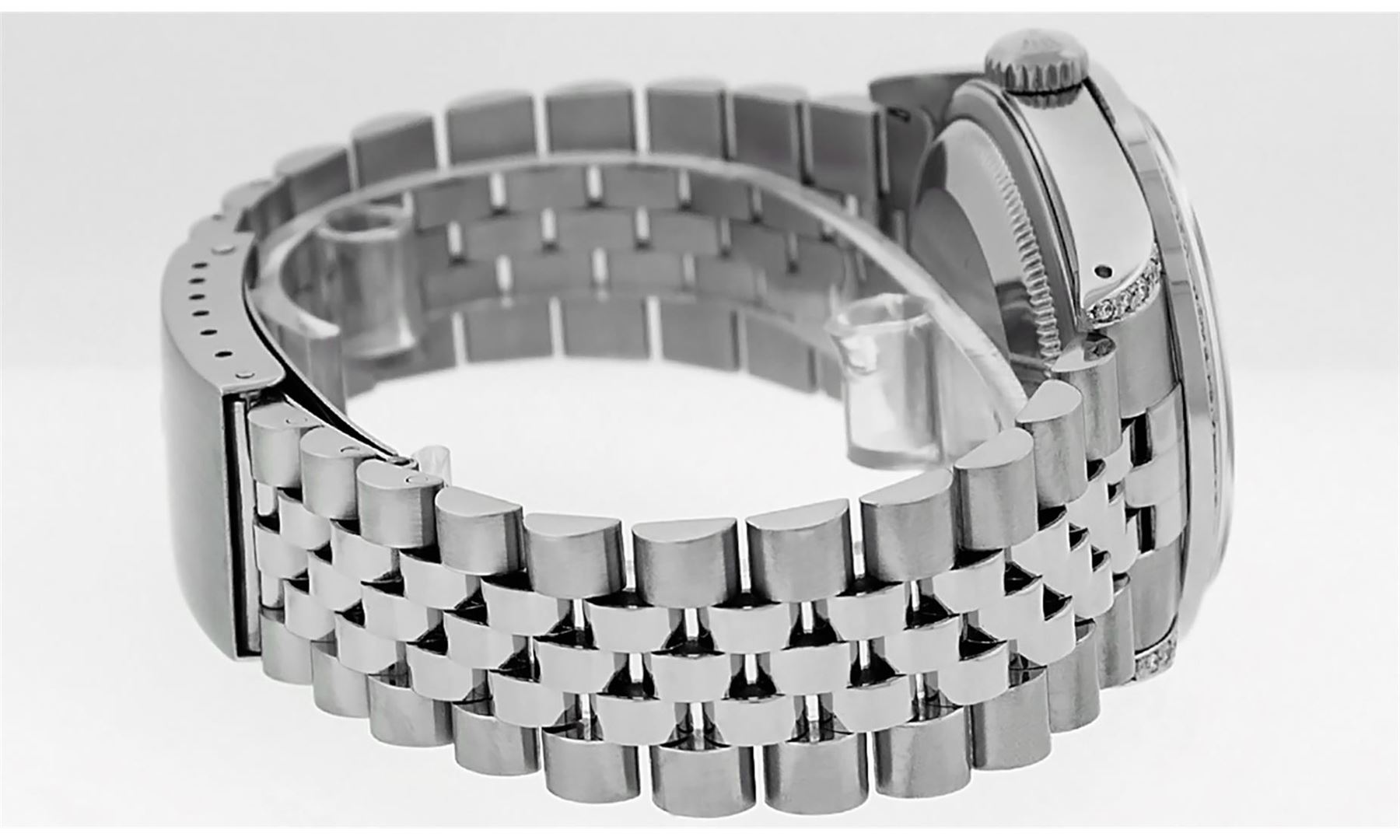 One Stainless Steel Rolex 36MM Datejust Polished Bright with Satin Finish, Serviced & Electronically Tested, Stainless Steel Case: 36mm, Custom Diamonds On Lugs: 28 Added Diamonds On Lugs. Stainless Steel Crown, Custom Bezel: New 18K White Gold Pyramid Diamond Bezel, Diamond Count: 24 Diamonds On Bezel. Custom Crystal: New Sapphire With Magnified Date Window. Custom Hands: New Solid Hands. Rolex Movement: Automatic Winding Movement 3035. Custom Dial: Custom Silver Dial With Added Diamond Hour Markers, Diamond Count: 10 Diamonds On Dial. Date Window: 3 O'Clock Position Date Display, Quickset, Model: Datejust Condition: G-6 Extra Fine. Rolex Bracelet: Stainless Steel Jubilee Band. Bright Polish & Satin Finish. 7.0 Inch Length, Adjustable. Fold Clasp, With Rolex Logo. This Watch Has Been Serviced And Polished And Its Free Of All Dents And Scratches.