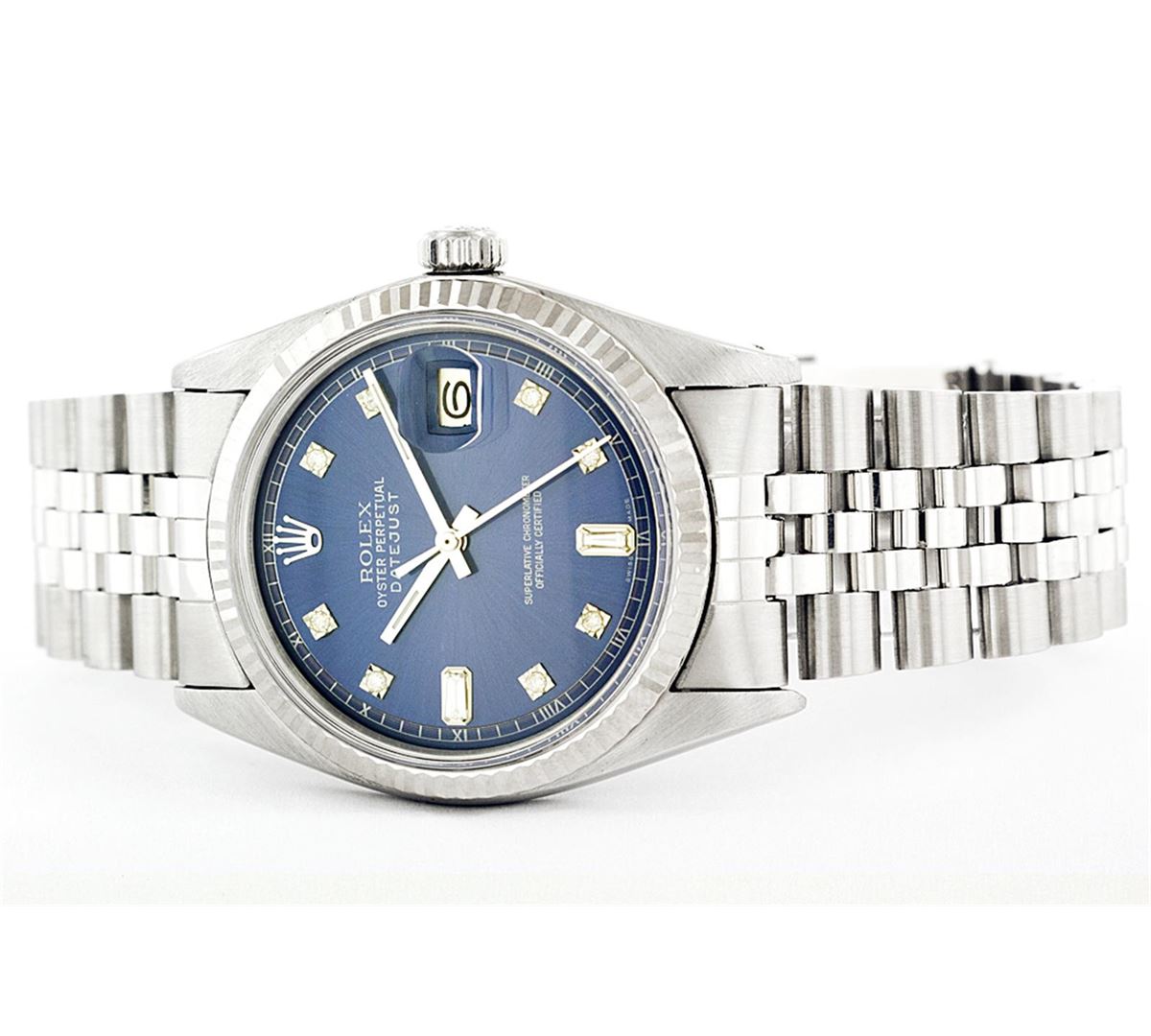 One Mens Rolex Datejust Polished Bright with Satin Finish, Serviced & Electronically Tested, Stainless Steel Case:36mm, Stainless Steel Crown, Original Bezel: 14K White Gold Fluted Bezel. Custom Crystal: Acrylic Cyclops Lens. Movement: Automatic Winding Movement Caliber 3035. Custom Dial: Blue Dial With Diamond Hour Markers and Track + Baguette Diamonds On The 6 & 9 Hour Marker, Diamond Count: 8 Diamonds + 2 Baguettes in Dial G To H In Color, Si-VS Clarity. Date Window: 3 O'Clock Position Date Display, Quickset, Model: 16014 Condition: G-6 Extra Fine. Bracelet: Stainless Steel Jubilee. Bright Polish & Satin Finish. 6.5 Inch Length, Adjustable. Standard Clasp, With Rolex Logo.