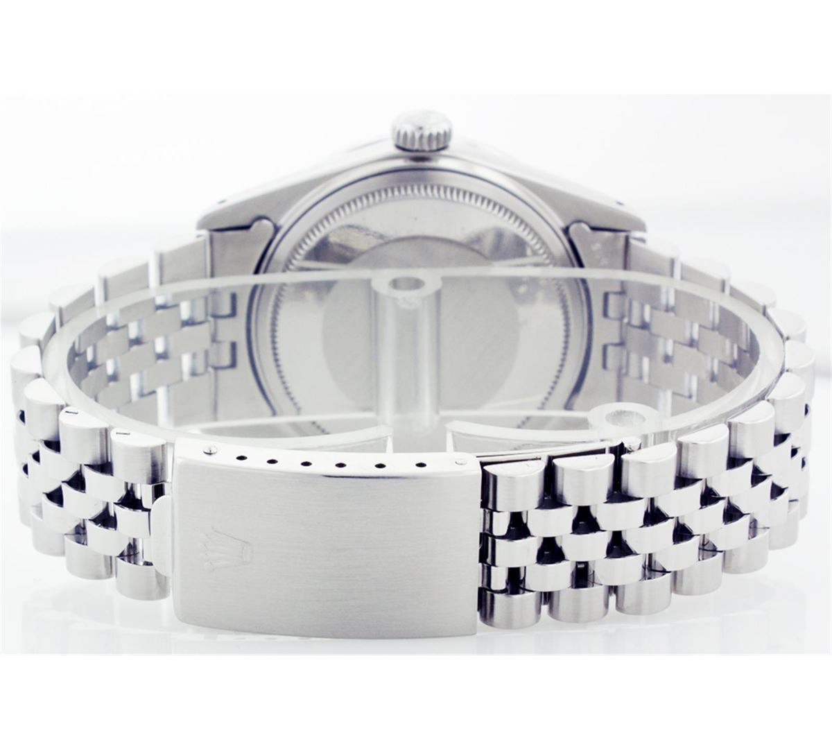 One Mens Rolex Datejust Polished Bright with Satin Finish, Serviced & Electronically Tested, Stainless Steel Case:36mm, Stainless Steel Crown, Custom Bezel: 18K White Gold Ruby Beadset Diamond Bezel, Diamond + Gem Count: 36 Diamonds + 4 Rubies Total Weight 1.00 Carat, Clarity: SI-VS, Color: G to H. Custom Crystal: Synthetic Sapphire Cyclops Lens. Movement: Automatic Winding Movement Caliber 3035. Custom Dial: Chocolate With Baguette Hour Markers, 8 Diamond Baguettes + 2 Ruby Baguettes in Dial, Dial Weight: .40 Carat, G To H In Color, Clarity: SI-VS. Date Window: 3 O'Clock Position Date Display, Quickset, Model: 16014 Condition: G-6 Extra Fine. Bracelet: Stainless Steel Jubilee. Bright Polish & Satin Finish. 6.5 Inch Length, Adjustable. Standard Clasp, With Rolex Logo.