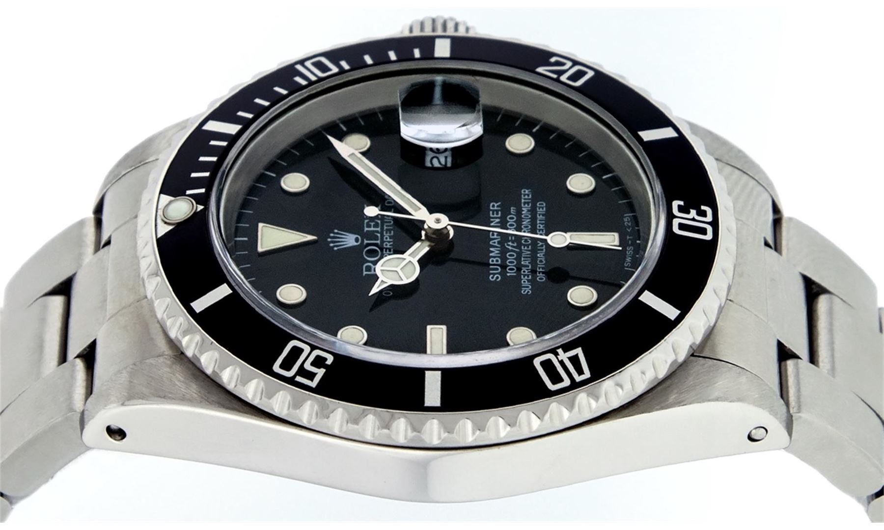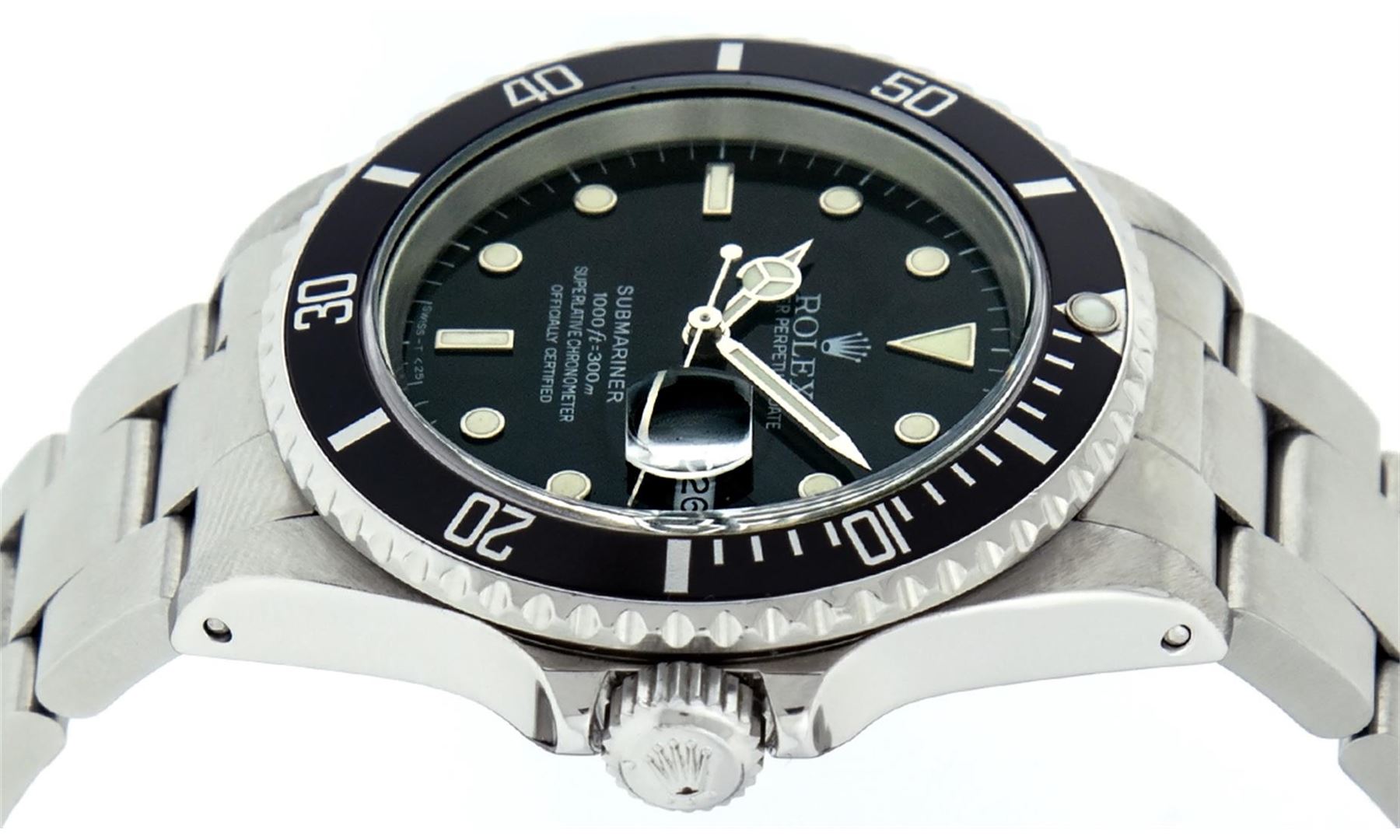 One Mens Rolex Submariner With Date Polished, Serviced & Electronically Tested, Stainless Steel Case:41mm, Stainless Steel Crown, Bezel: Stainless Steel Rotatable Bezel With Black Insert. Crystal: Synthetic Sapphire Cyclops Lens. Movement: Automatic Winding Movement Caliber 3135. Dial: Black Submariner Dial. Date Window: 3 O'Clock Position Date Display, Model: Submariner 16610, Quickset, Condition: G-6 Extra Fine. Bracelet: Stainless Steel Oyster. Bright Polish & Satin Finish. 7.0 Inch Length, Adjustable. Standard Clasp, With Rolex Logo.