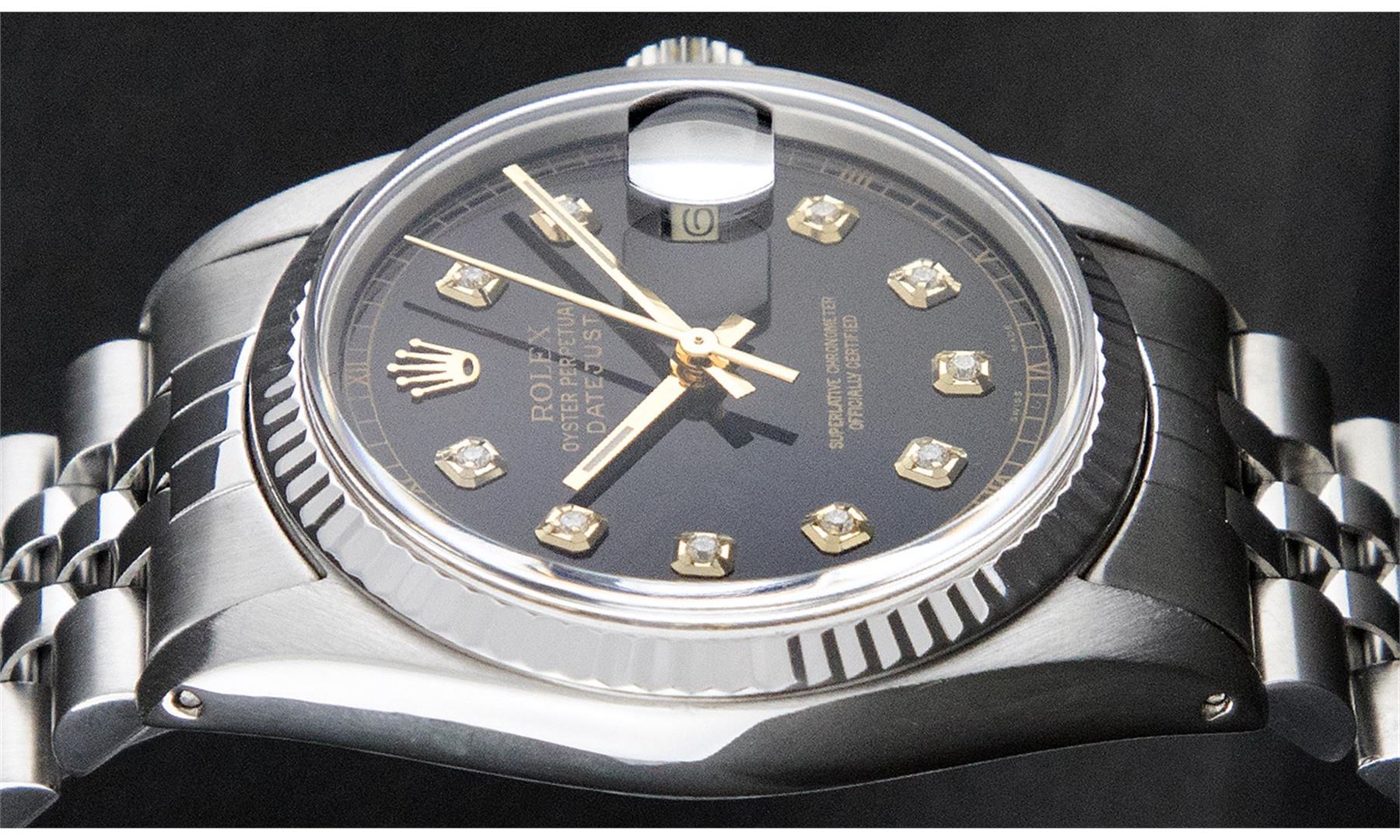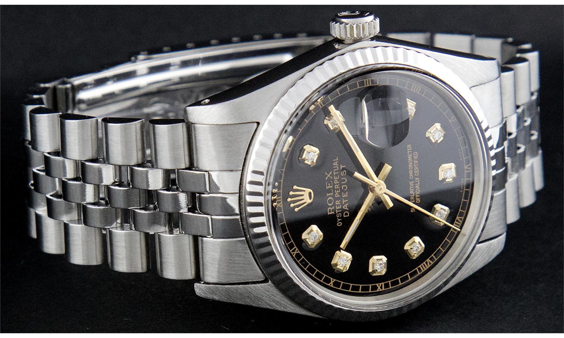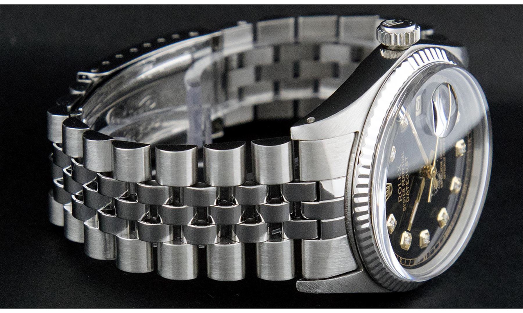 One Gents Rolex Datejust Polished, Serviced & Electronically Tested, Stainless Steel Case:36mm, Stainless Steel Crown, Original Bezel: 18K White Gold Fluted Bezel. Custom Crystal: Acrylic Cyclops Lens. Movement: Automatic Winding Movement Caliber 3035. Custom Dial: Black Diamond Dial With Track, Diamond Count: 10 Diamonds, Clarity: SI-VS, Color: G to H. Date Window: 3 O'Clock Position Date Display, Quickset, Model: 16014 Condition: G-6 Extra Fine. Bracelet: Stainless Steel Jubilee. Bright Polish & Satin Finish. 7.0 Inch Length, Adjustable. Standard Clasp, With Rolex Logo.