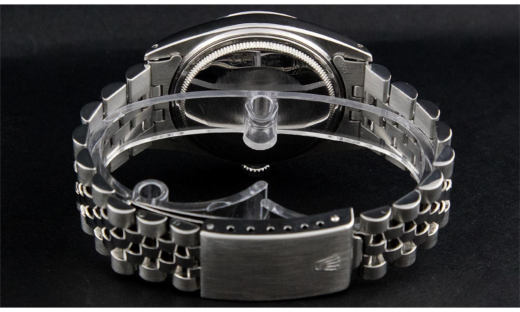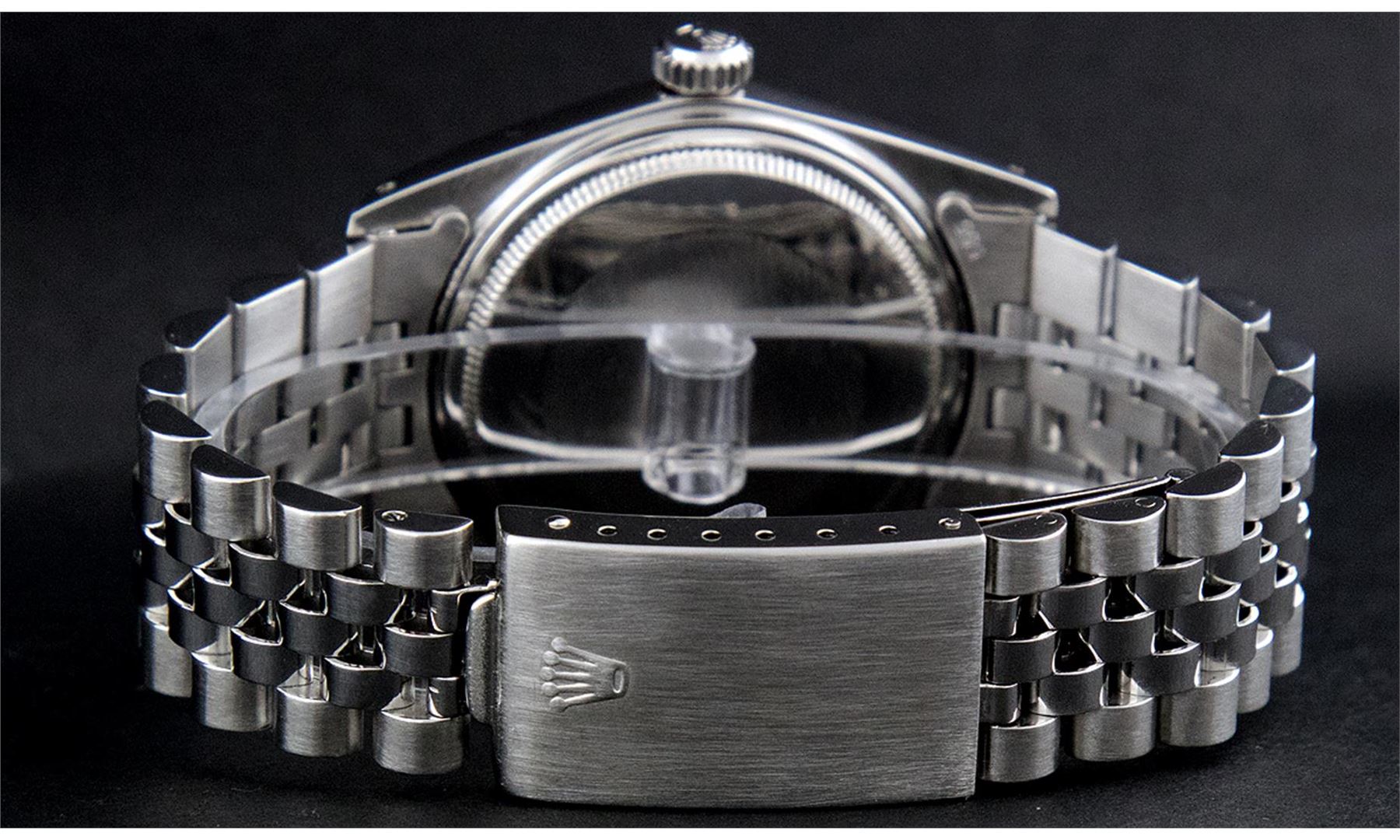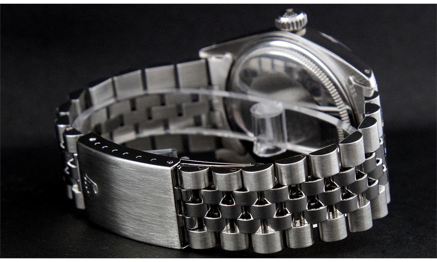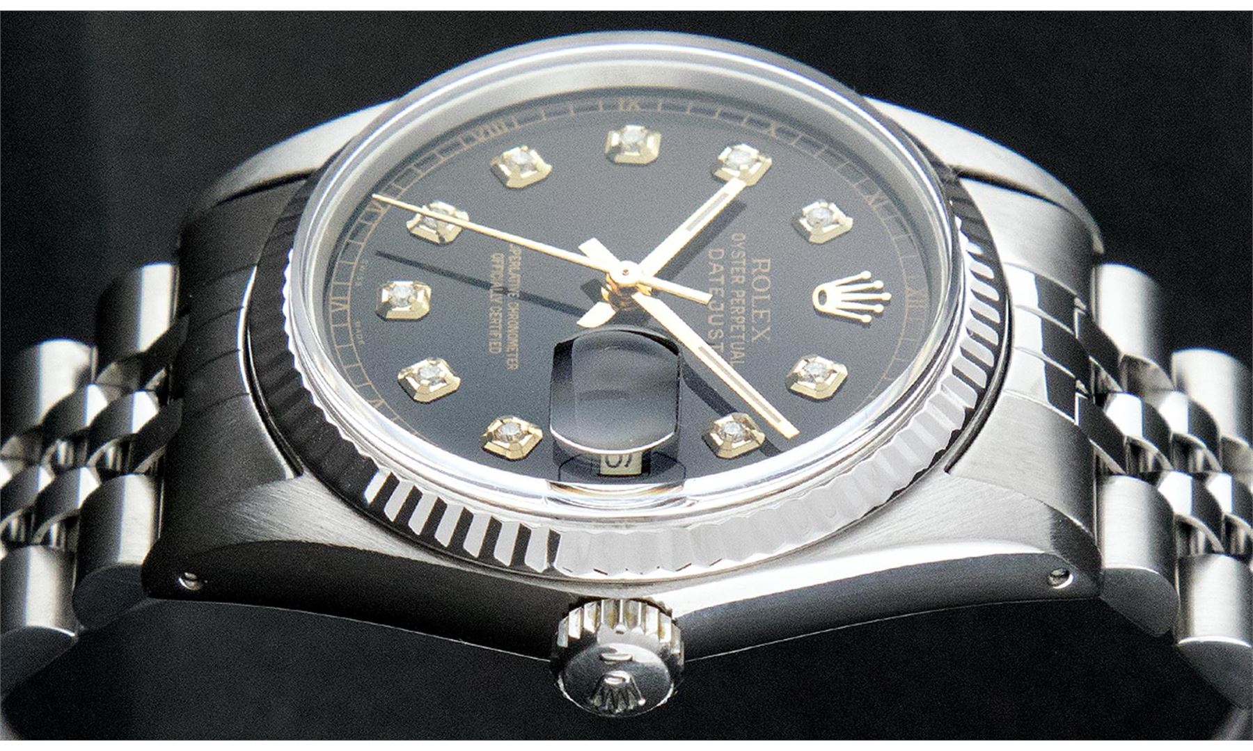 One Gents Rolex Datejust Polished, Serviced & Electronically Tested, Stainless Steel Case:36mm, Stainless Steel Crown, Original Bezel: 18K White Gold Fluted Bezel. Custom Crystal: Acrylic Cyclops Lens. Movement: Automatic Winding Movement Caliber 3035. Custom Dial: Black Diamond Dial With Track, Diamond Count: 10 Diamonds, Clarity: SI-VS, Color: G to H. Date Window: 3 O'Clock Position Date Display, Quickset, Model: 16014 Condition: G-6 Extra Fine. Bracelet: Stainless Steel Jubilee. Bright Polish & Satin Finish. 7.0 Inch Length, Adjustable. Standard Clasp, With Rolex Logo.
