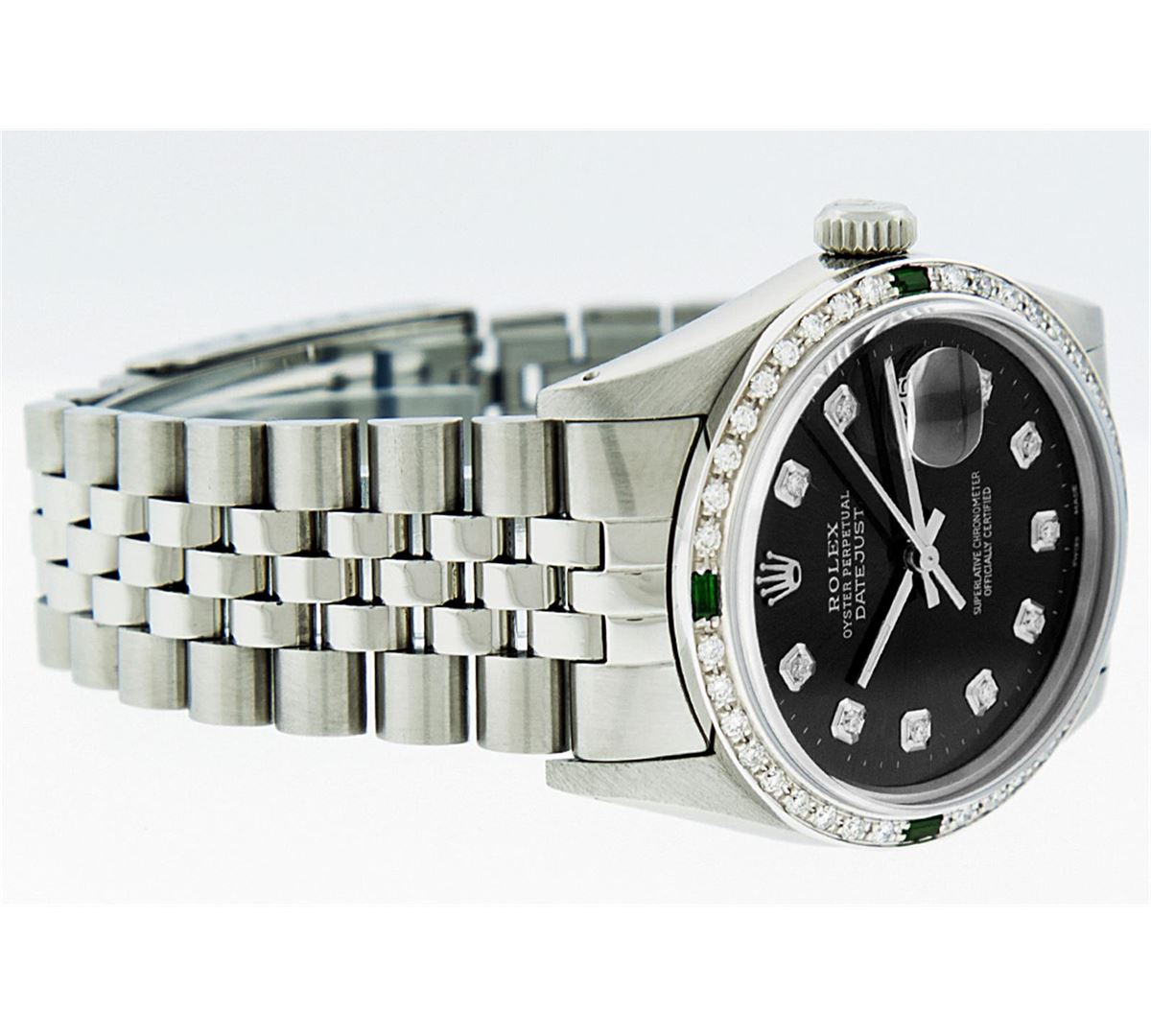 One Mens Rolex Datejust Polished Bright with Satin Finish, Serviced & Electronically Tested, Stainless Steel Case:36mm, Stainless Steel Crown, Custom Bezel: 18K White Gold Emerald Beadset Diamond Bezel, Diamond + Gem Count: 36 Diamonds + 4 Emeralds. Total Weight 1.00 Carat, Clarity: Si-VS, Color: G to H. Custom Crystal: Synthetic Sapphire Cyclops Lens. Movement: Automatic Winding Movement Caliber 3035. Custom Dial: Black Diamond Dial With Line Track, 10 Diamond in Dial G To H In Color, Si-VS Clarity. Date Window: 3 O'Clock Position Date Display, Quickset, Model: Datejust. Condition: G-6 Extra Fine. Bracelet: Stainless Steel Jubilee. Bright Polish & Satin Finish. 7.0 Inch Length, Adjustable. Standard Clasp, With Rolex Logo. Comes with a 6 month warranty card.
